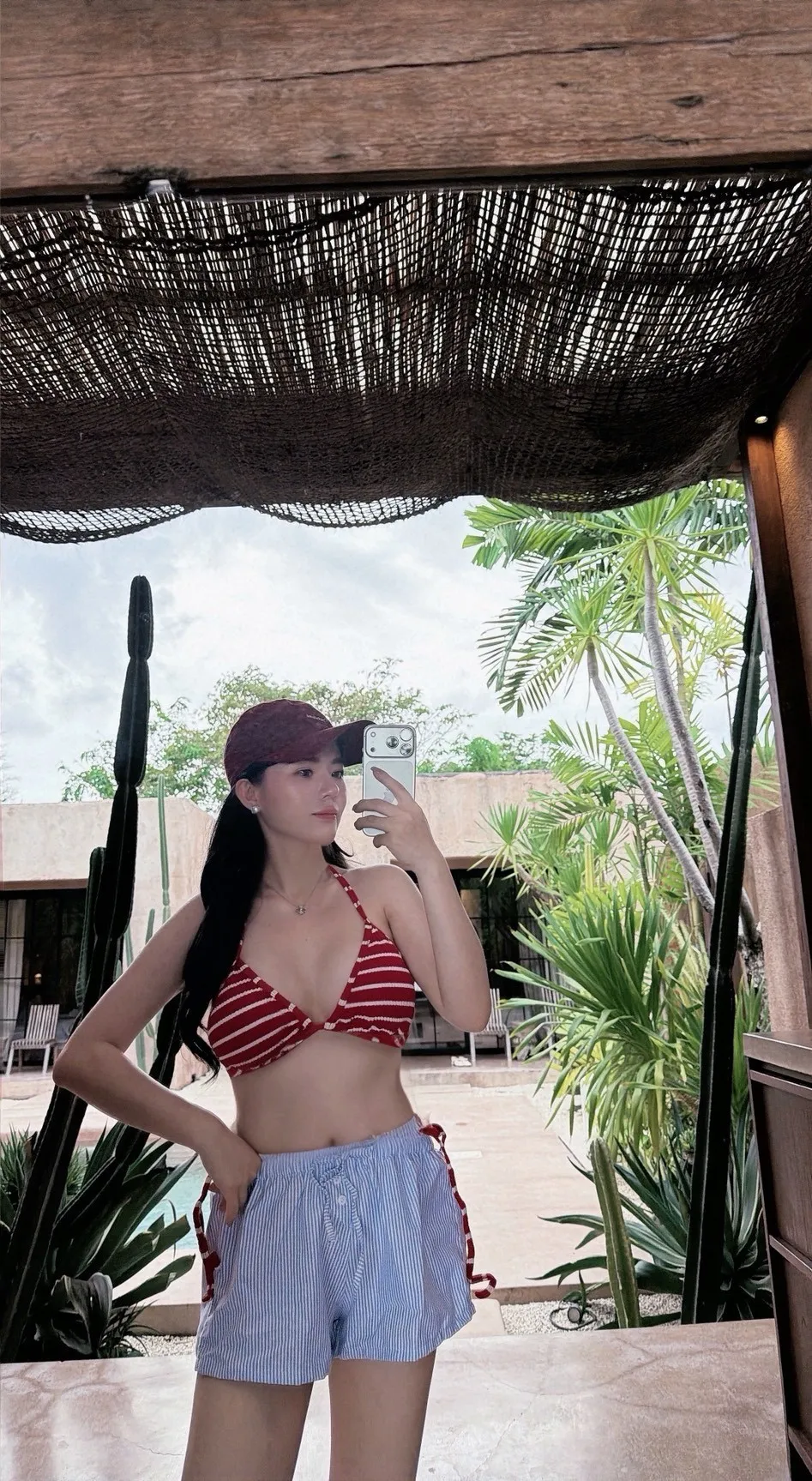 美式甜心復古三件式套裝:紅條紋比基尼+藍條紋短褲