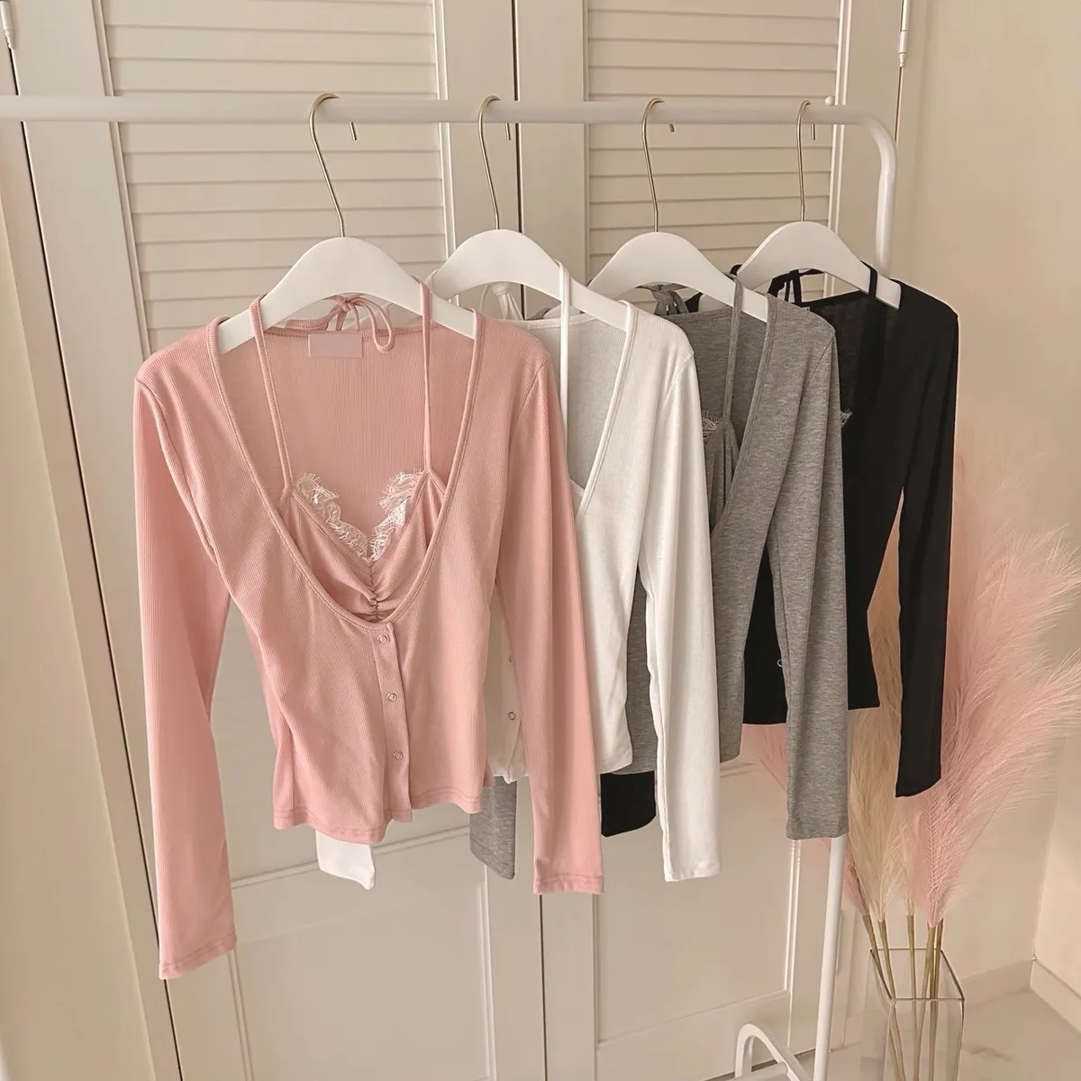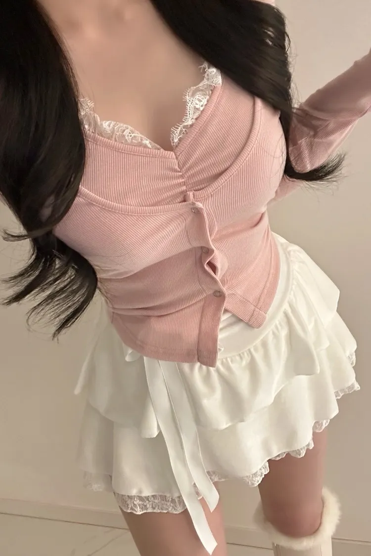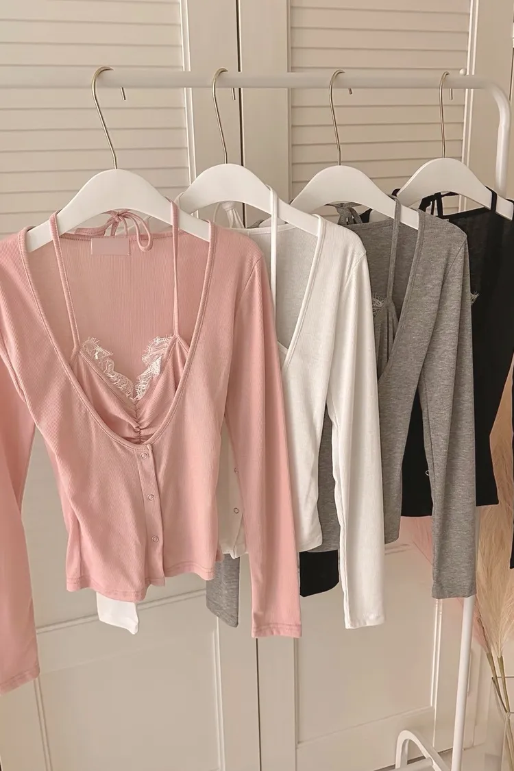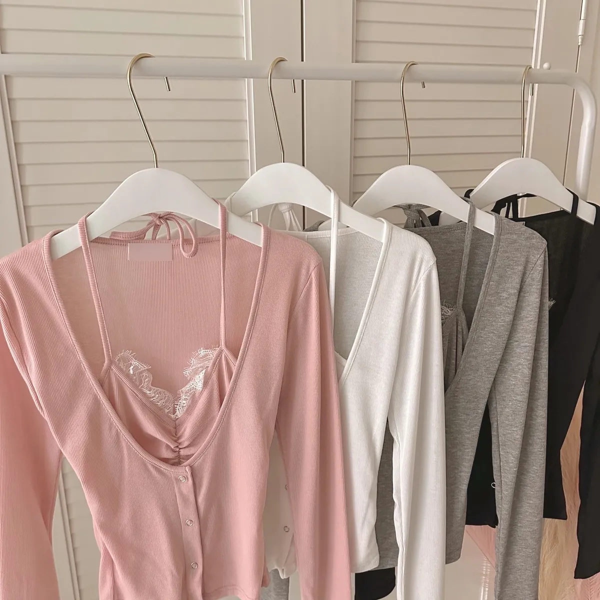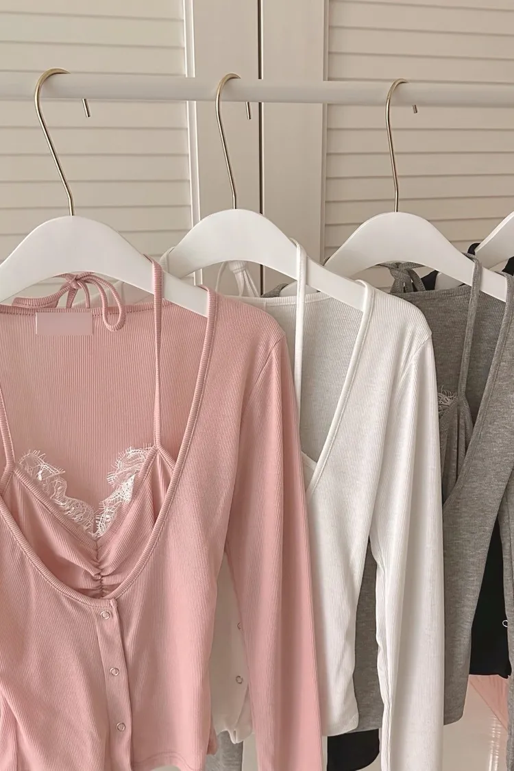 溫柔必買蕾絲雕花彈力棉質綁帶上衣