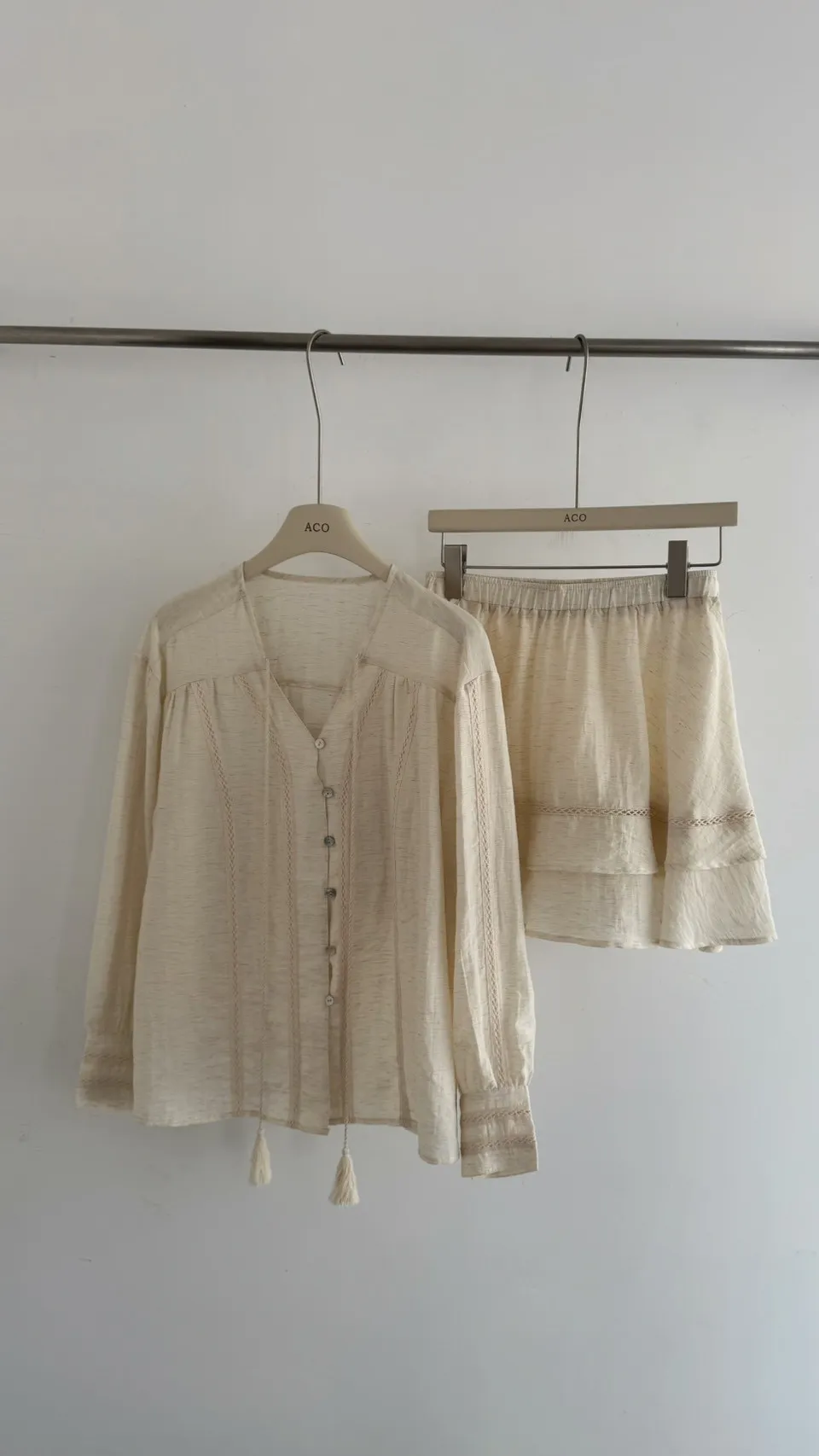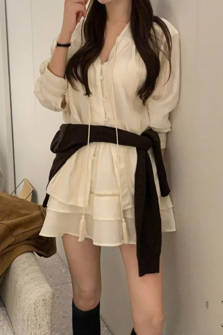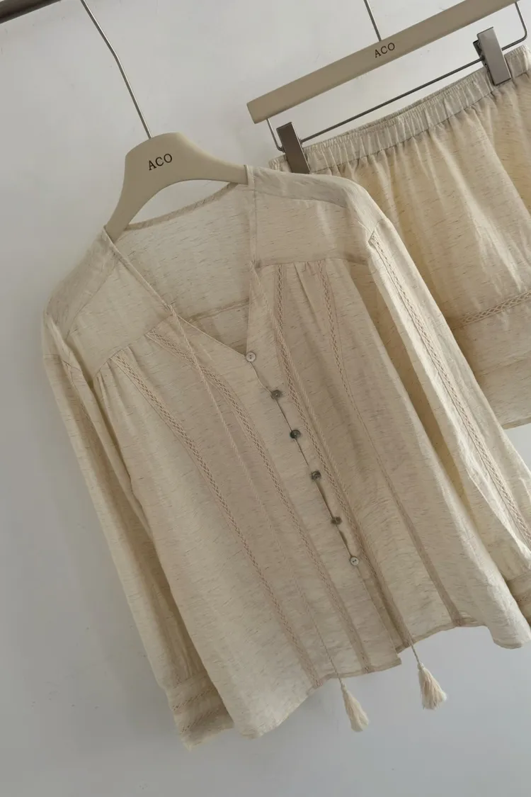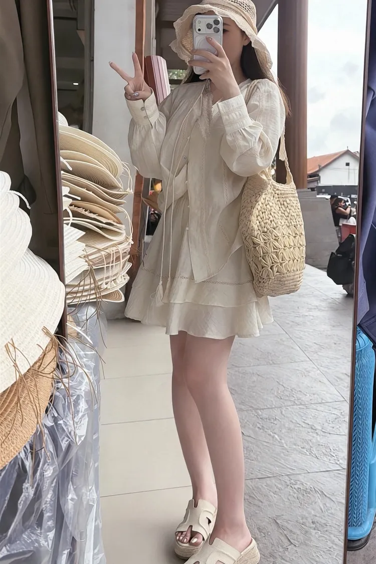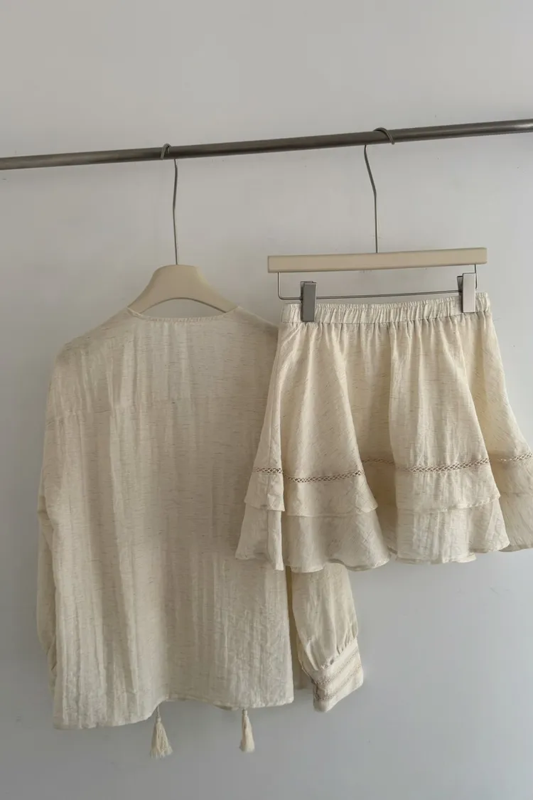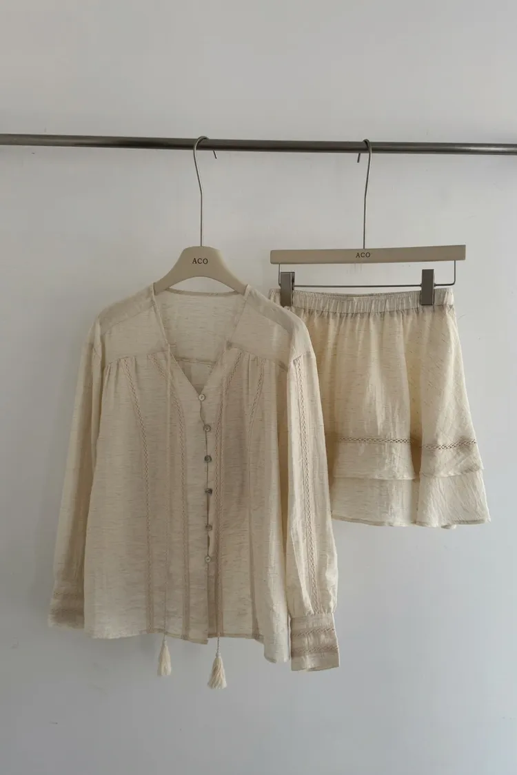 私藏棉麻質感襯衫兩件式套裝:排釦上衣+高腰蛋糕裙