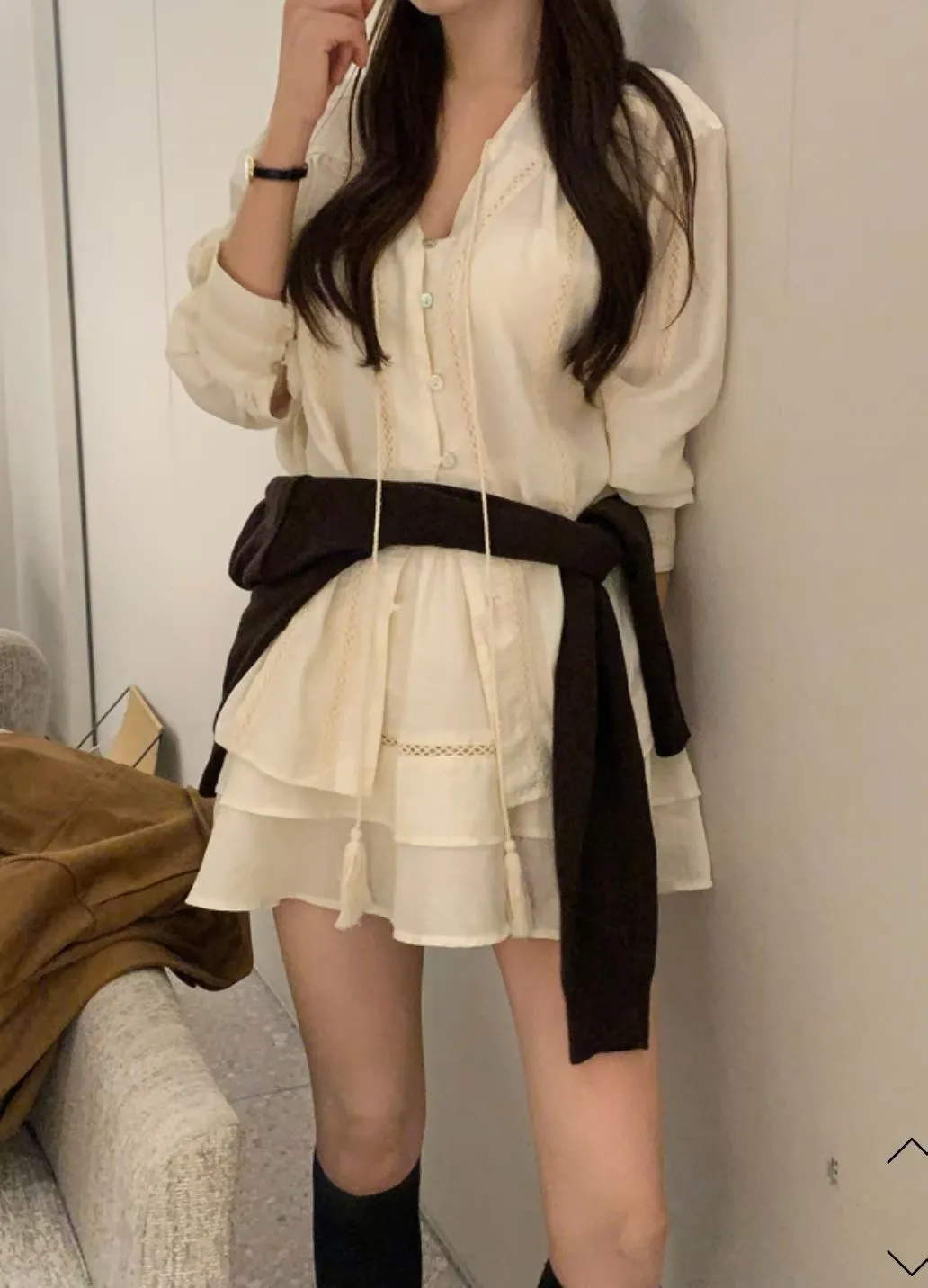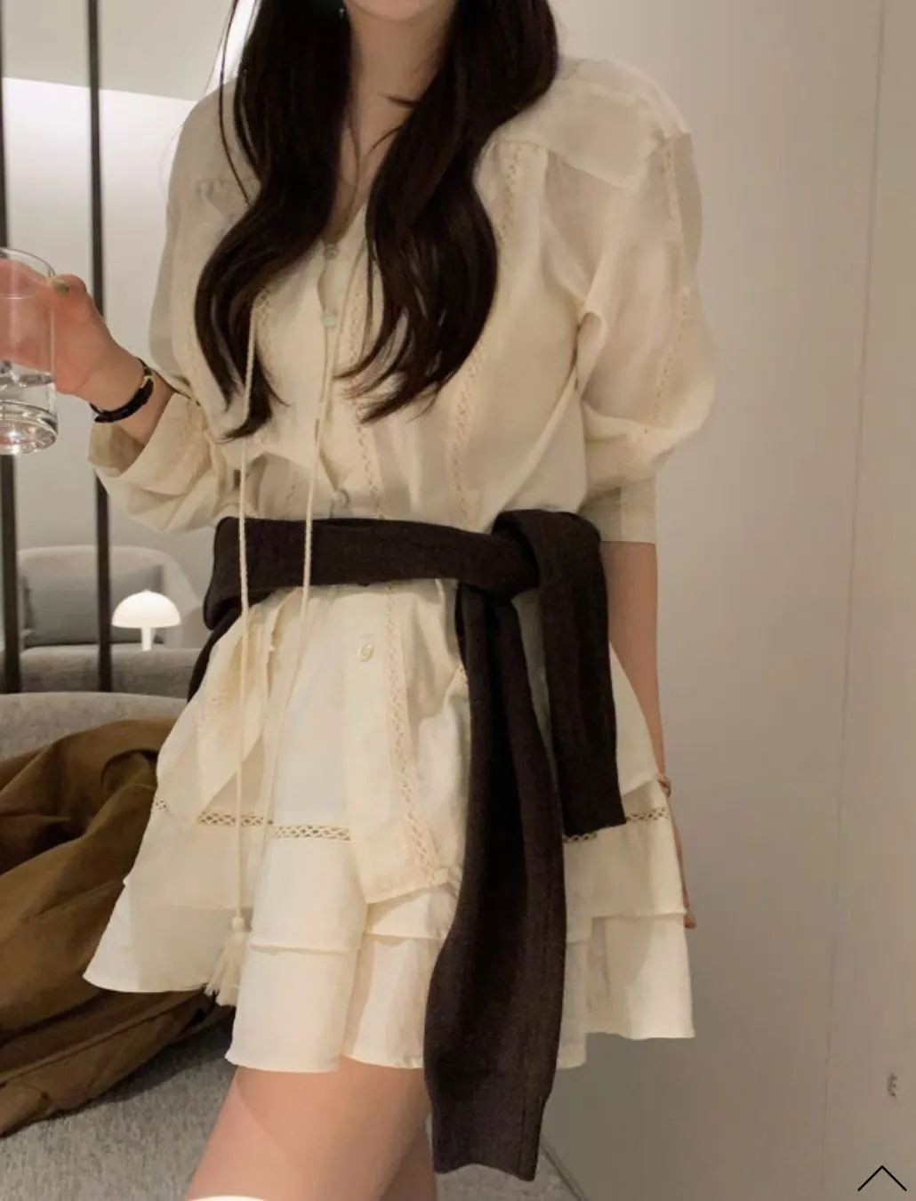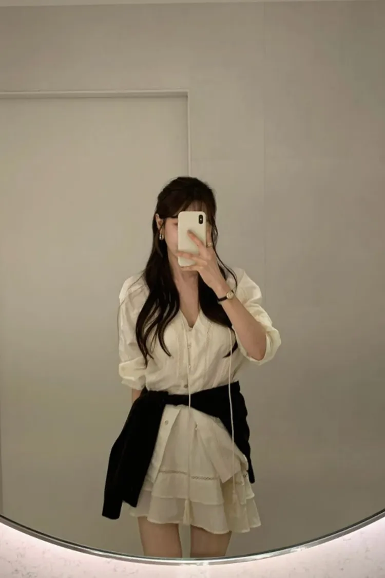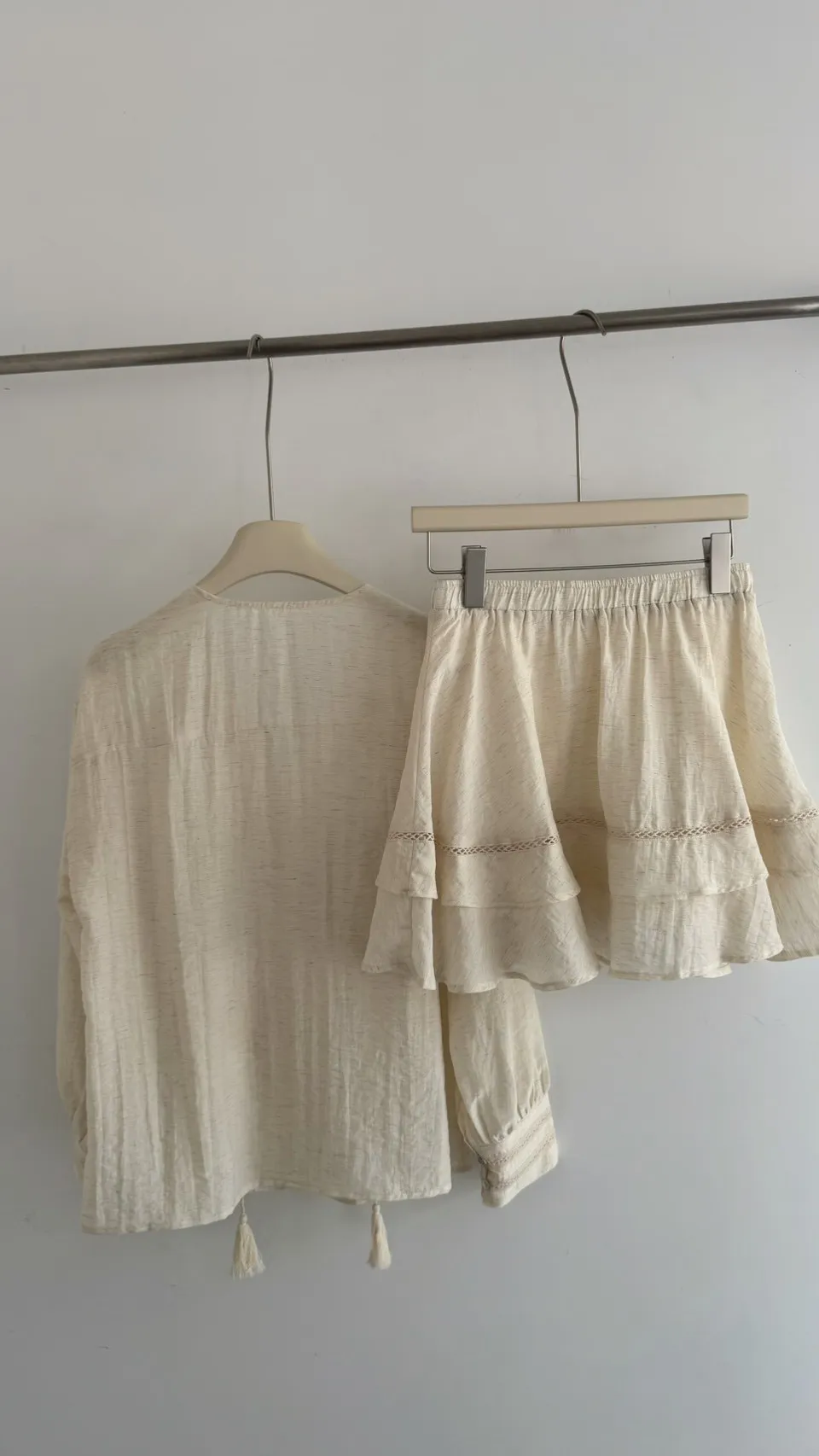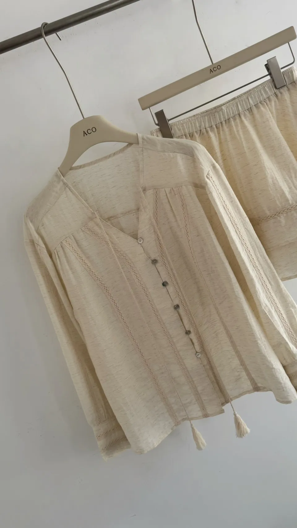 私藏棉麻質感襯衫兩件式套裝:排釦上衣+高腰蛋糕裙
