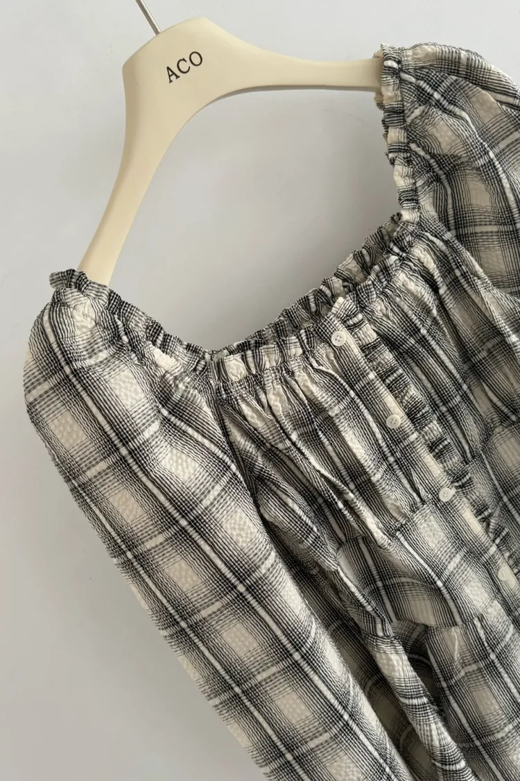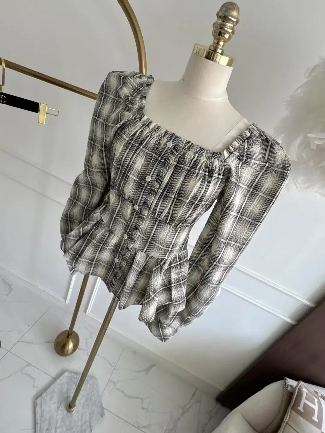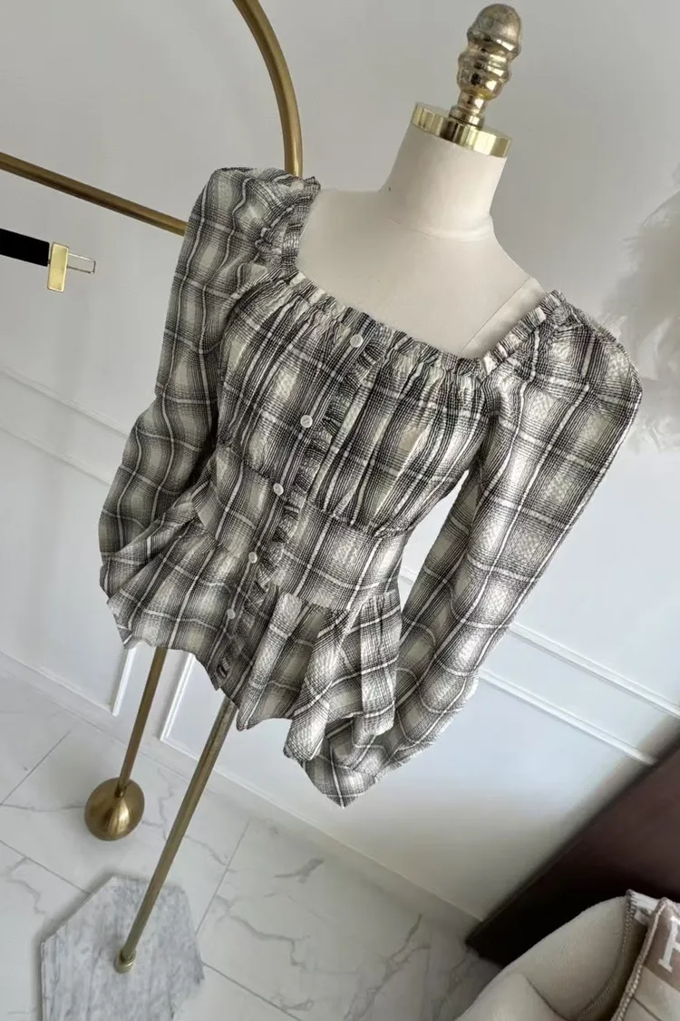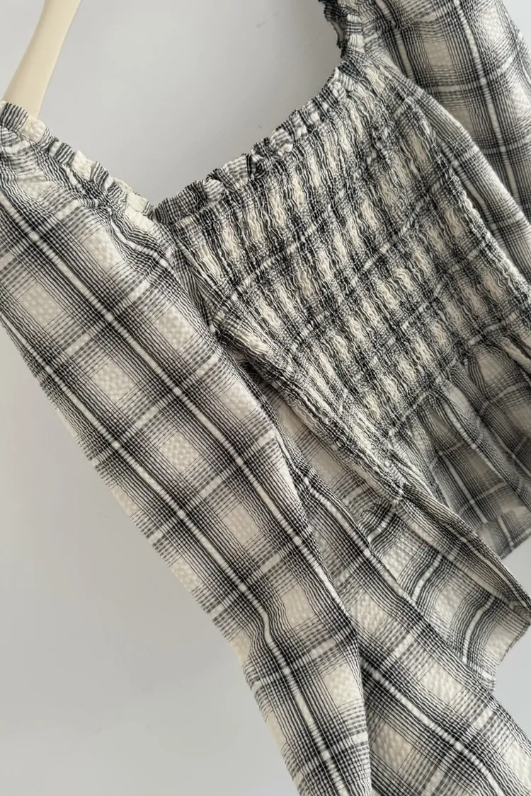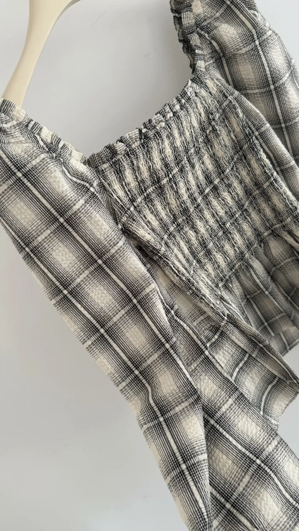 私藏高級感黑白格紋收腰顯瘦方領上衣
