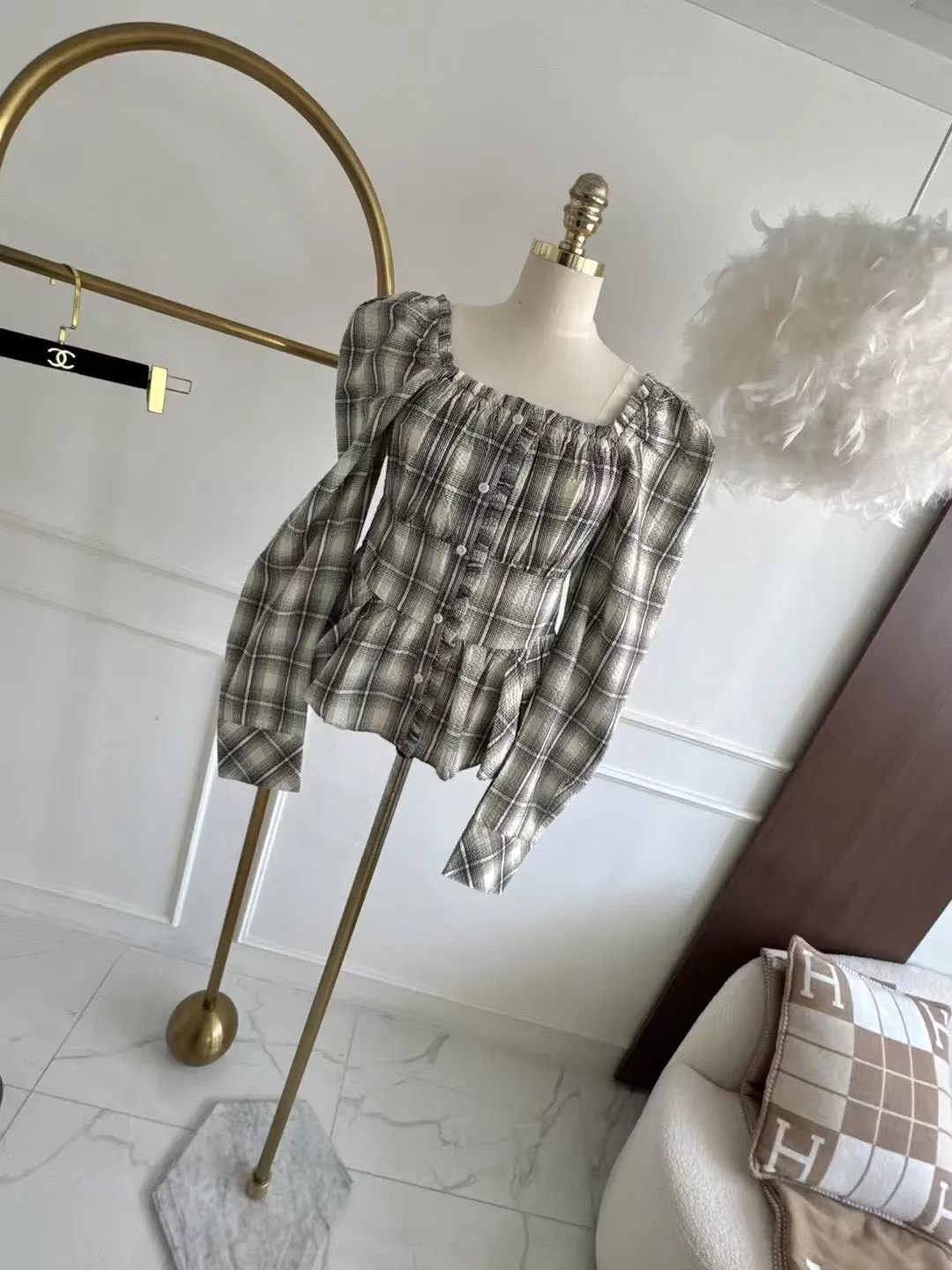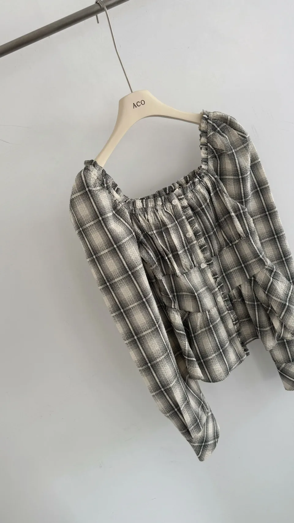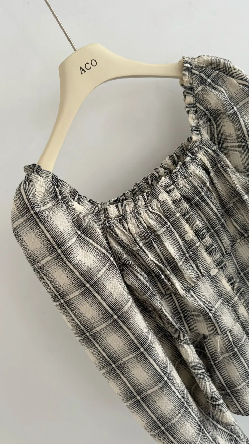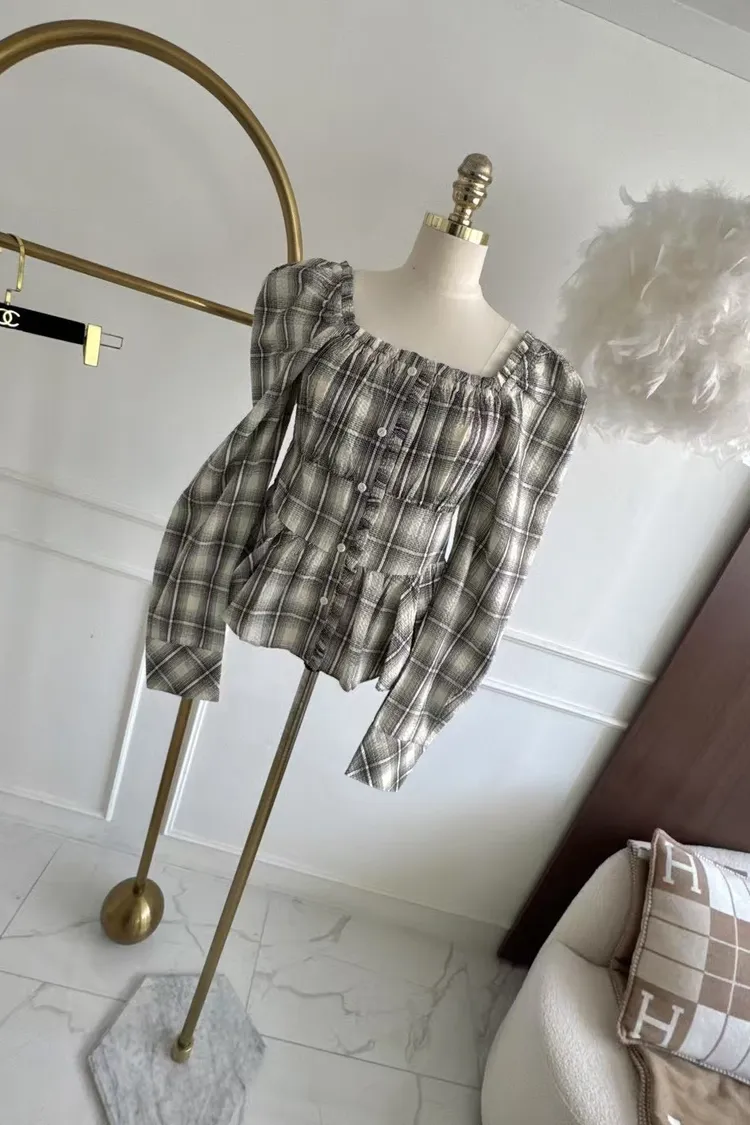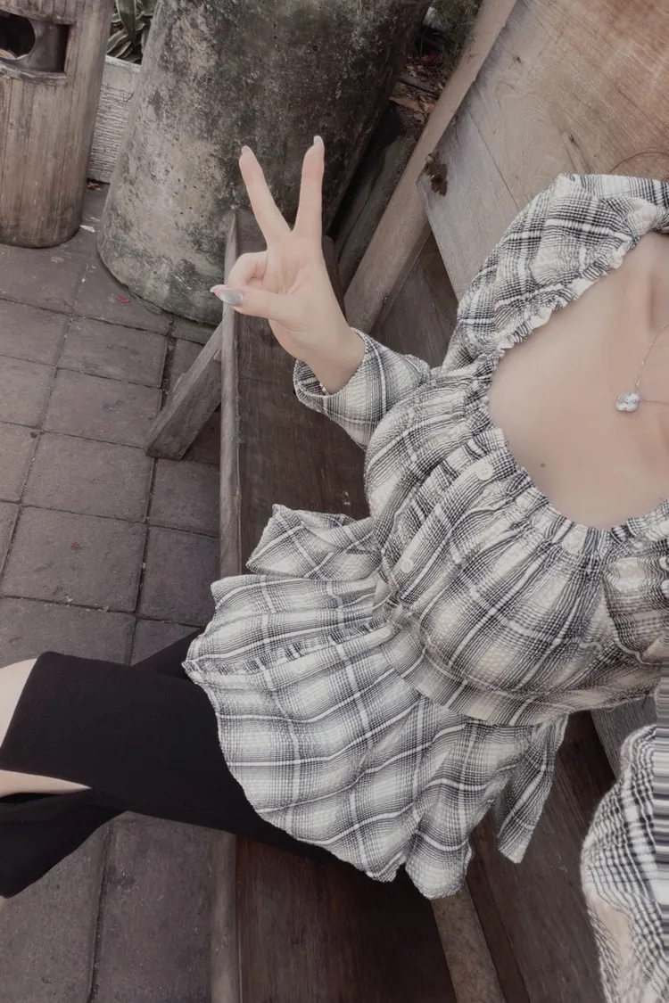 私藏高級感黑白格紋收腰顯瘦方領上衣