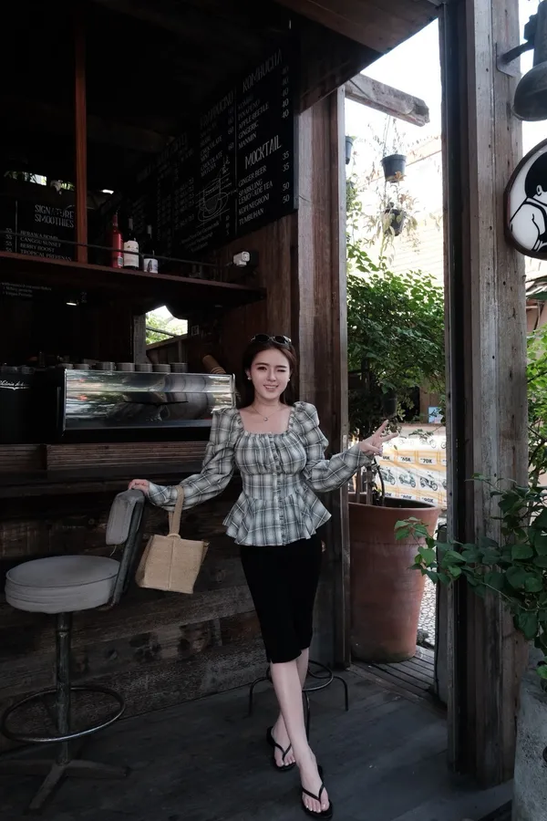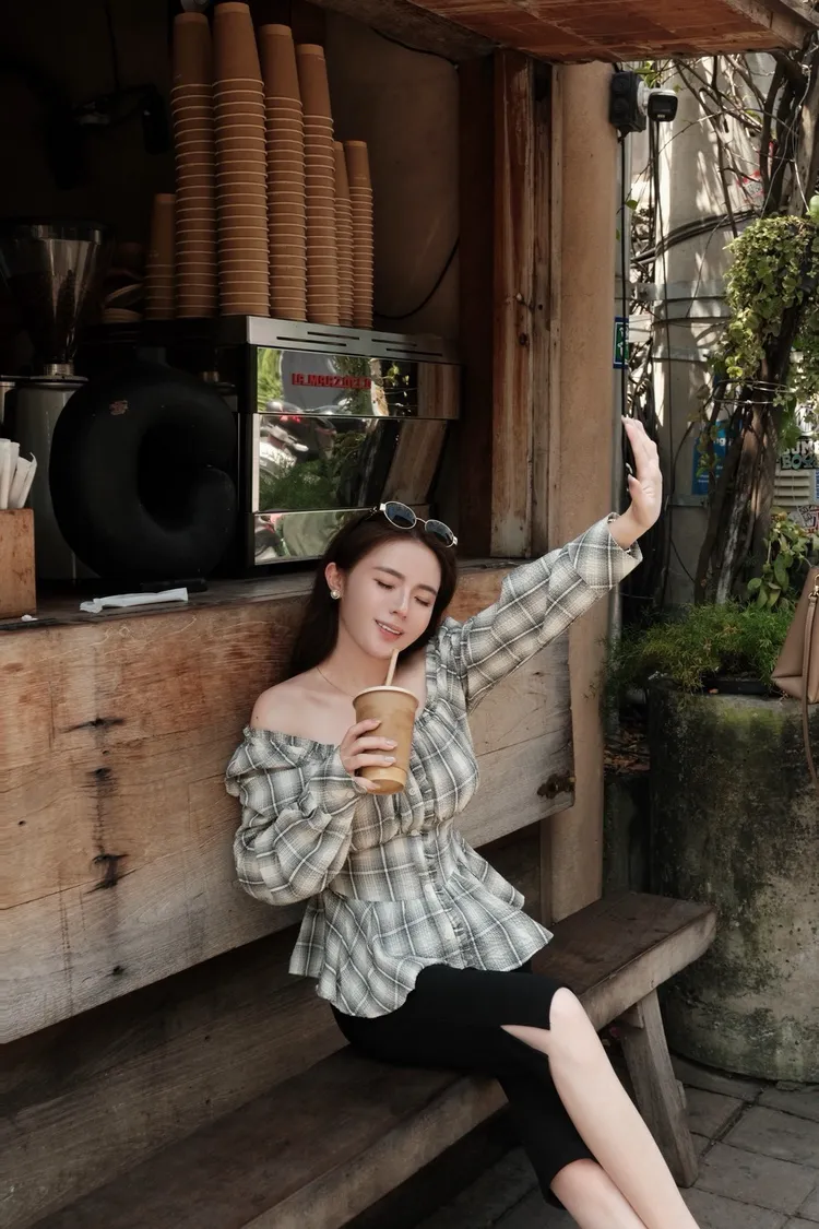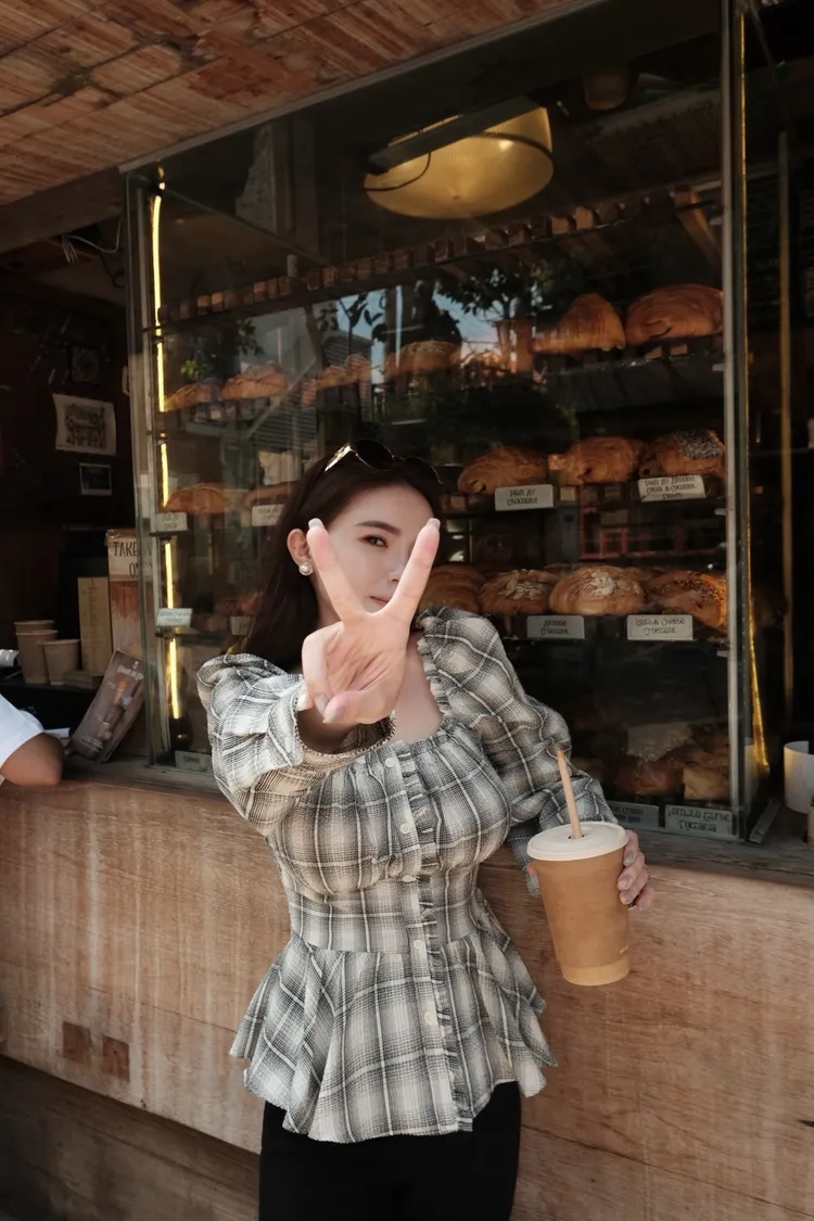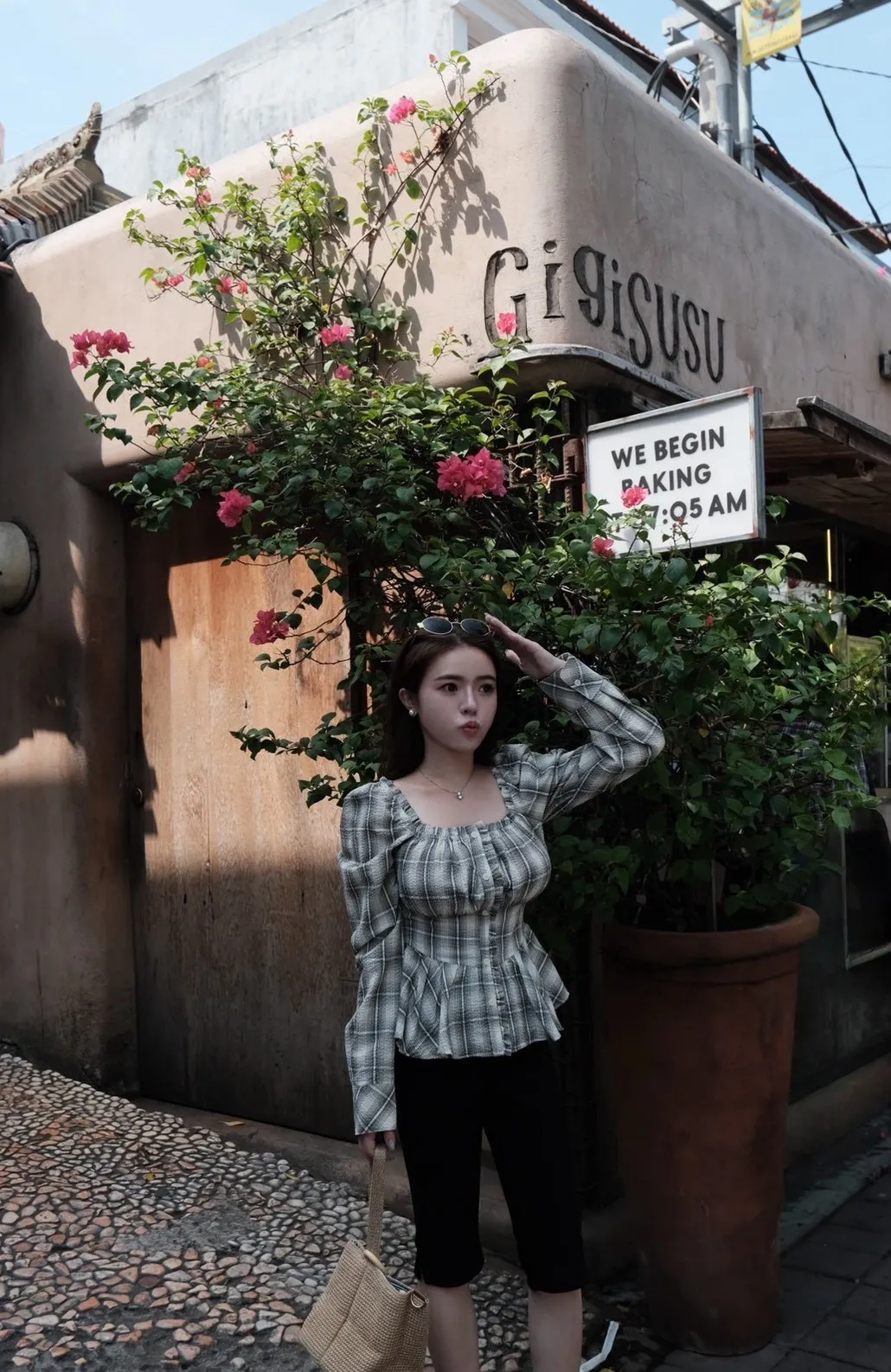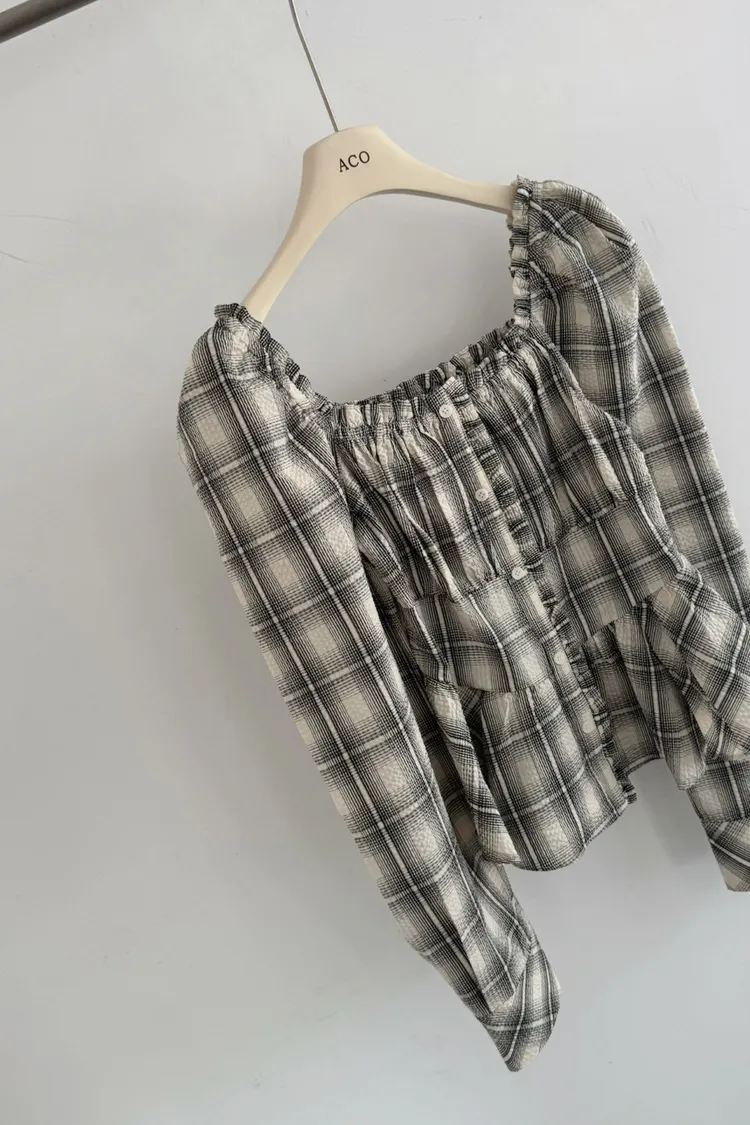 私藏高級感黑白格紋收腰顯瘦方領上衣