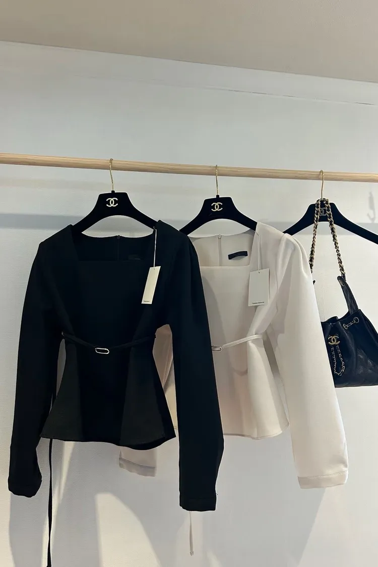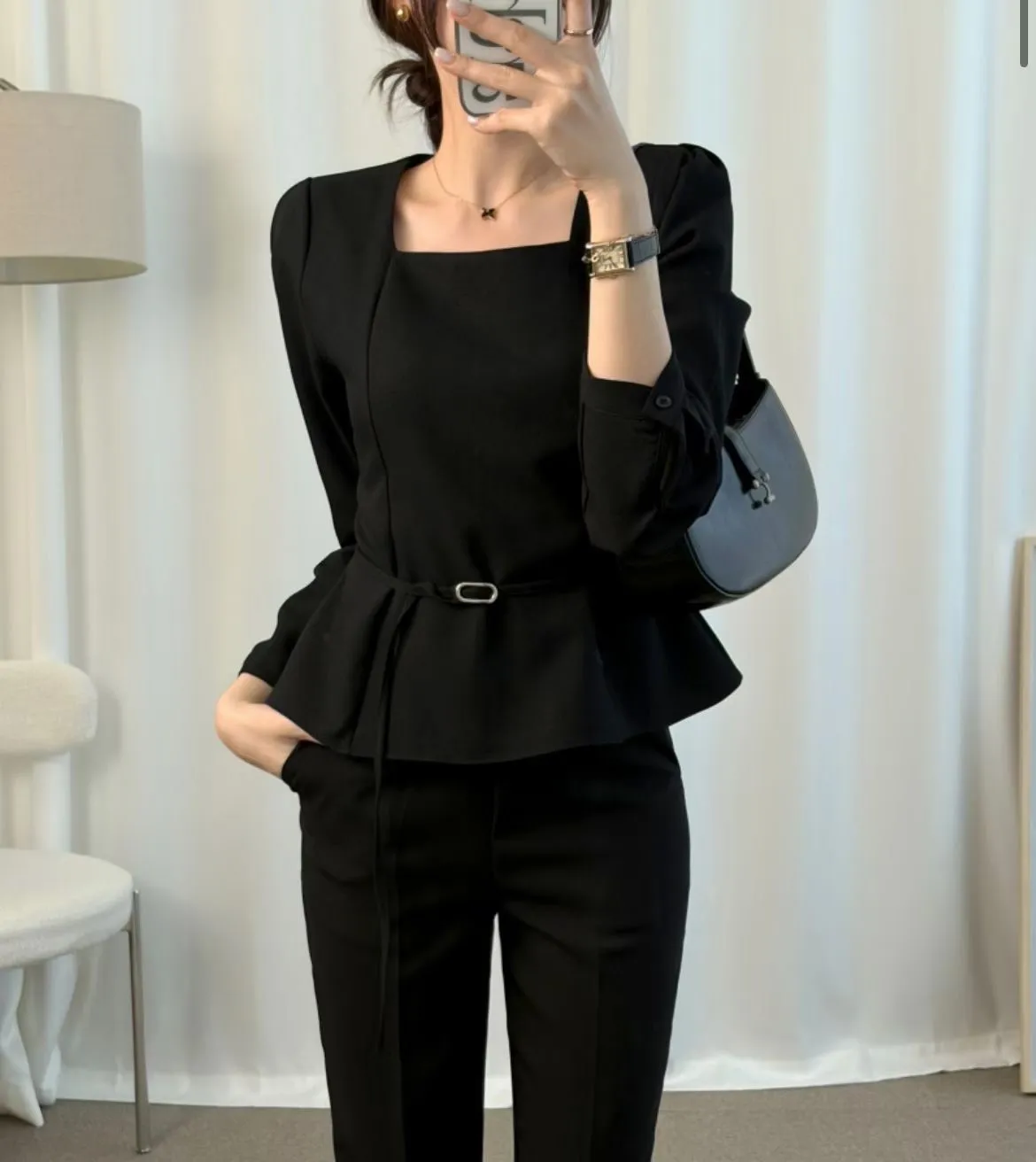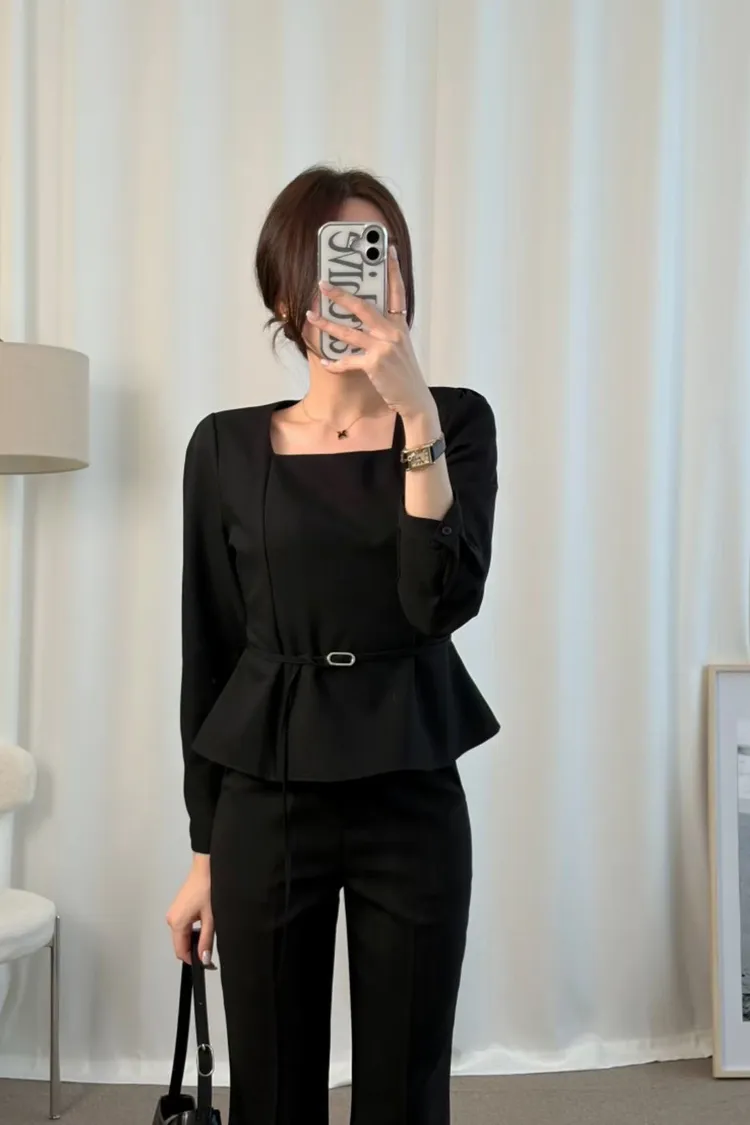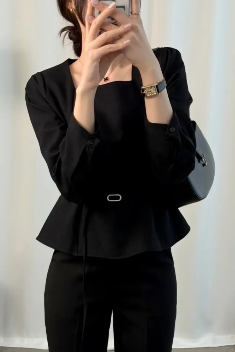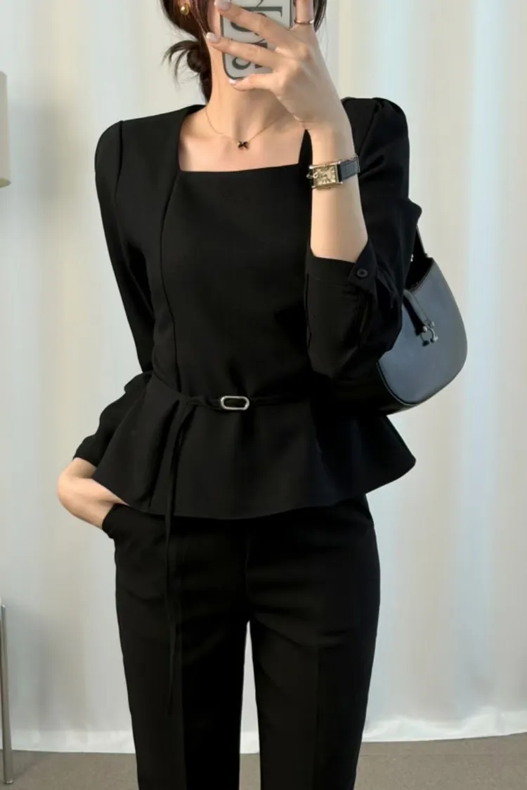 溫柔家獨家訂製小方領雪紡上衣(附腰帶)