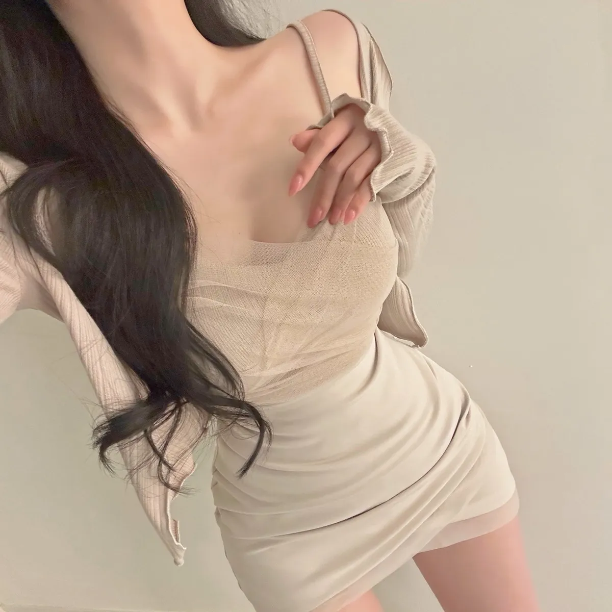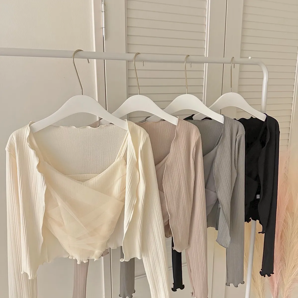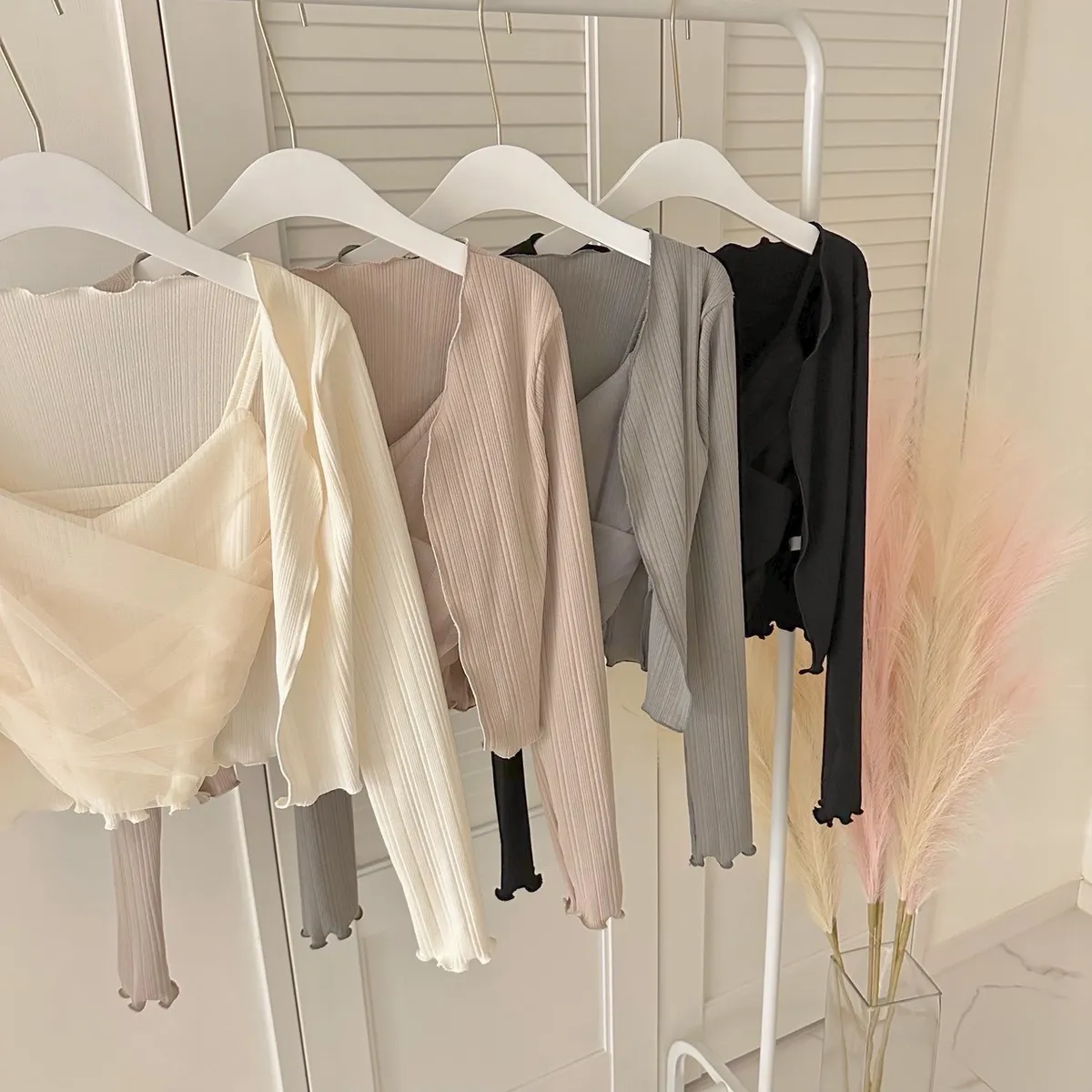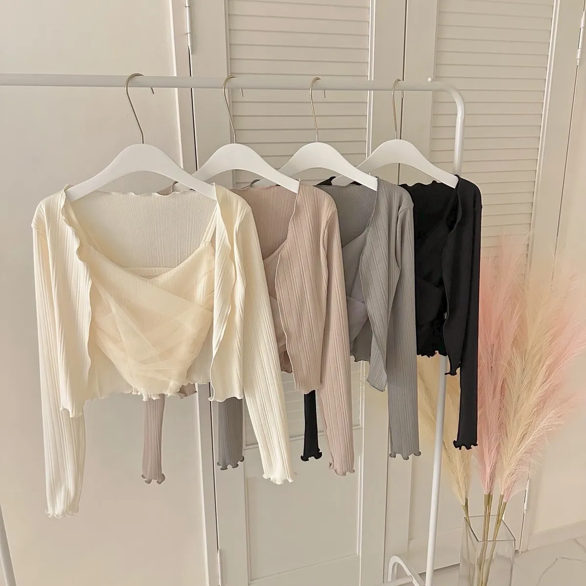(熱賣爆款)羅紋質感拼接網紗細肩帶背心+罩衫兩件式set