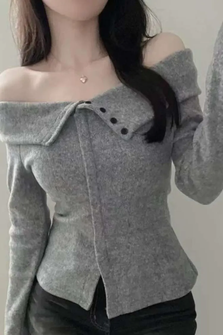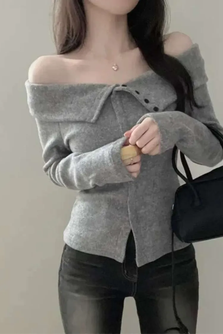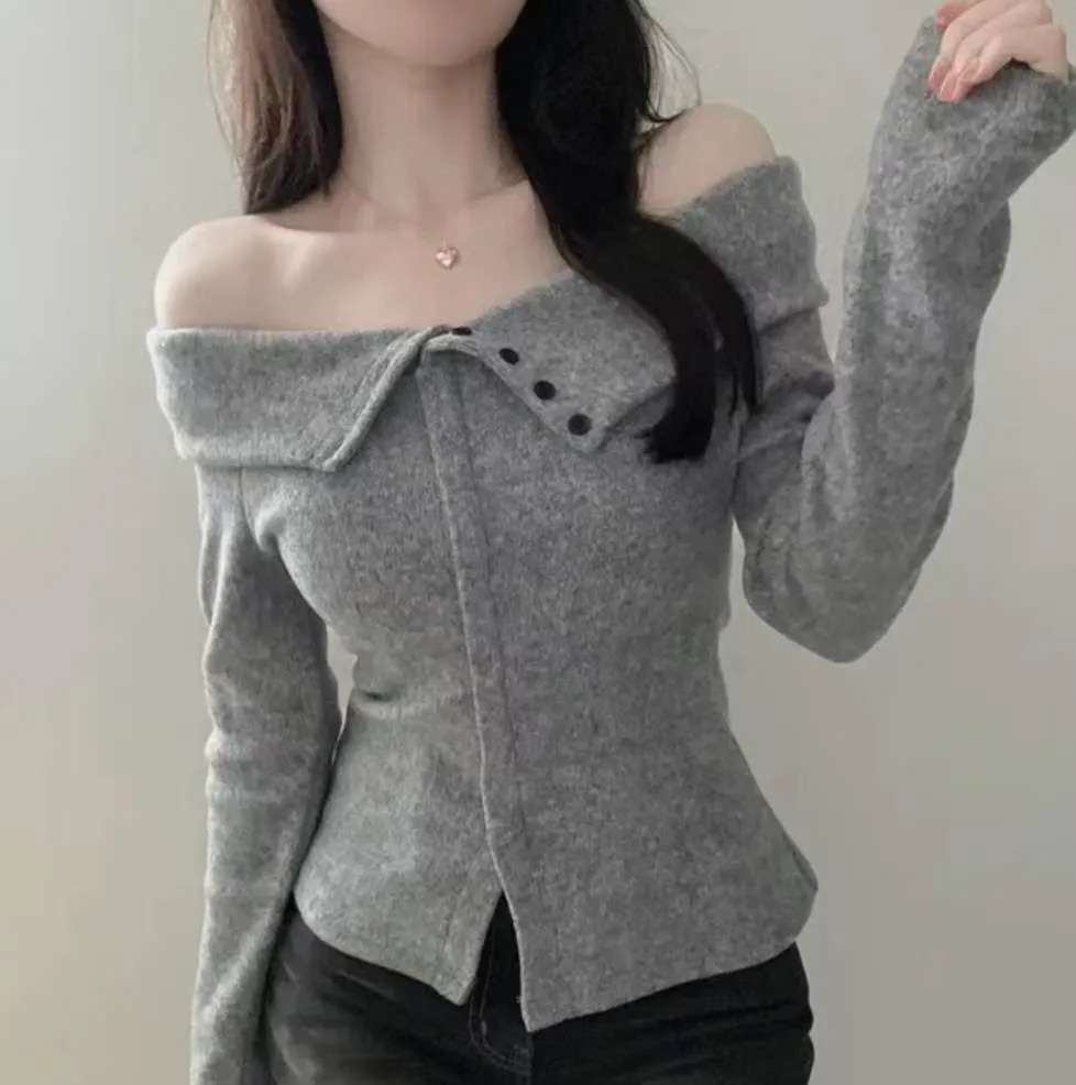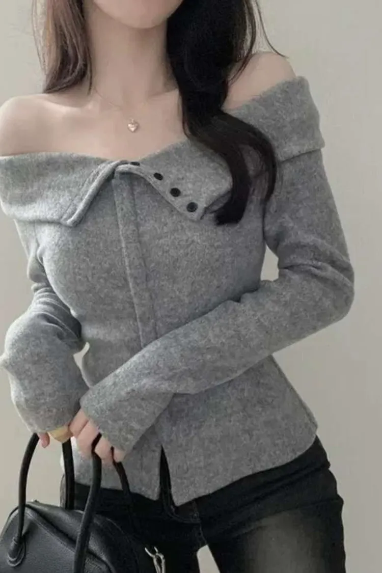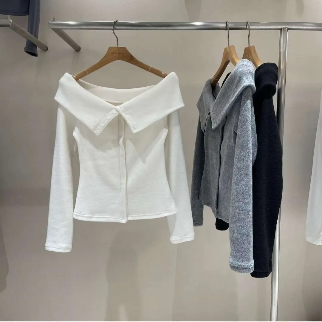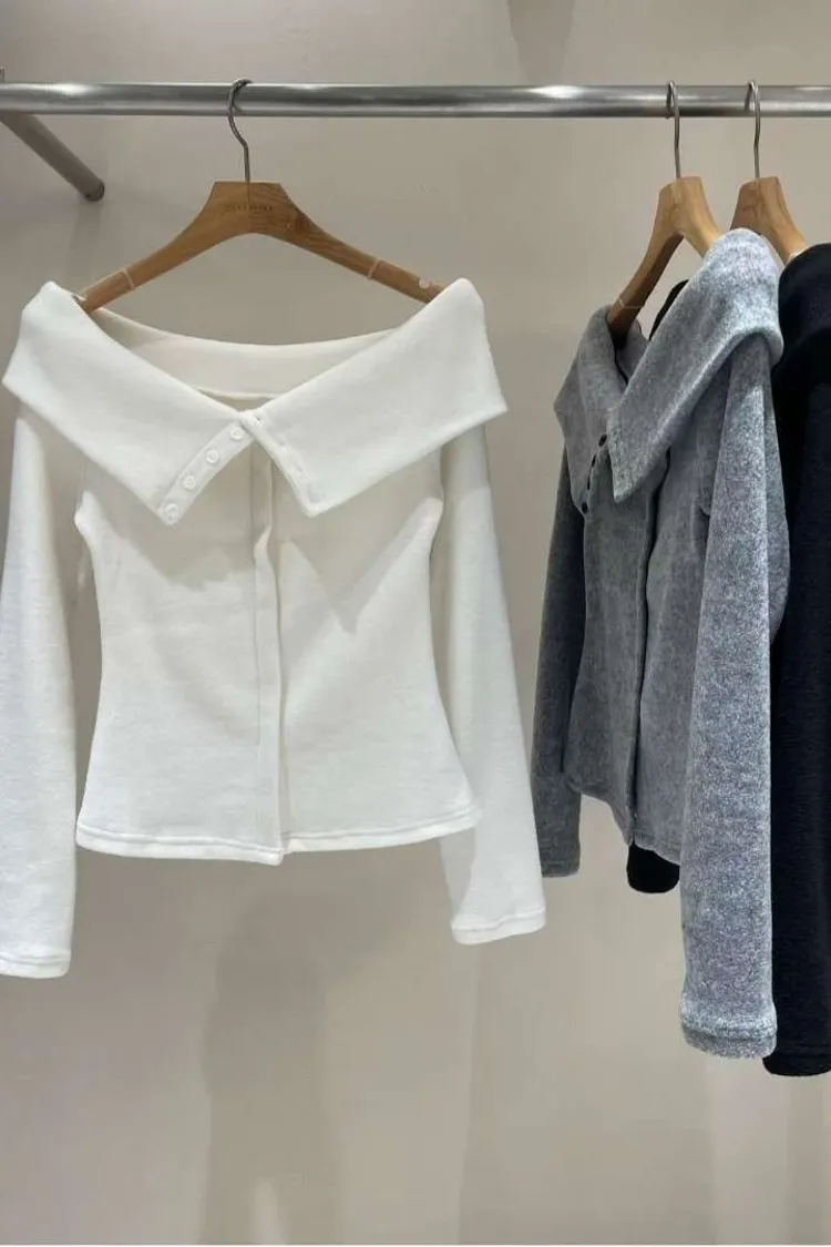 溫柔家排釦翻領一字領腰身磨毛上衣