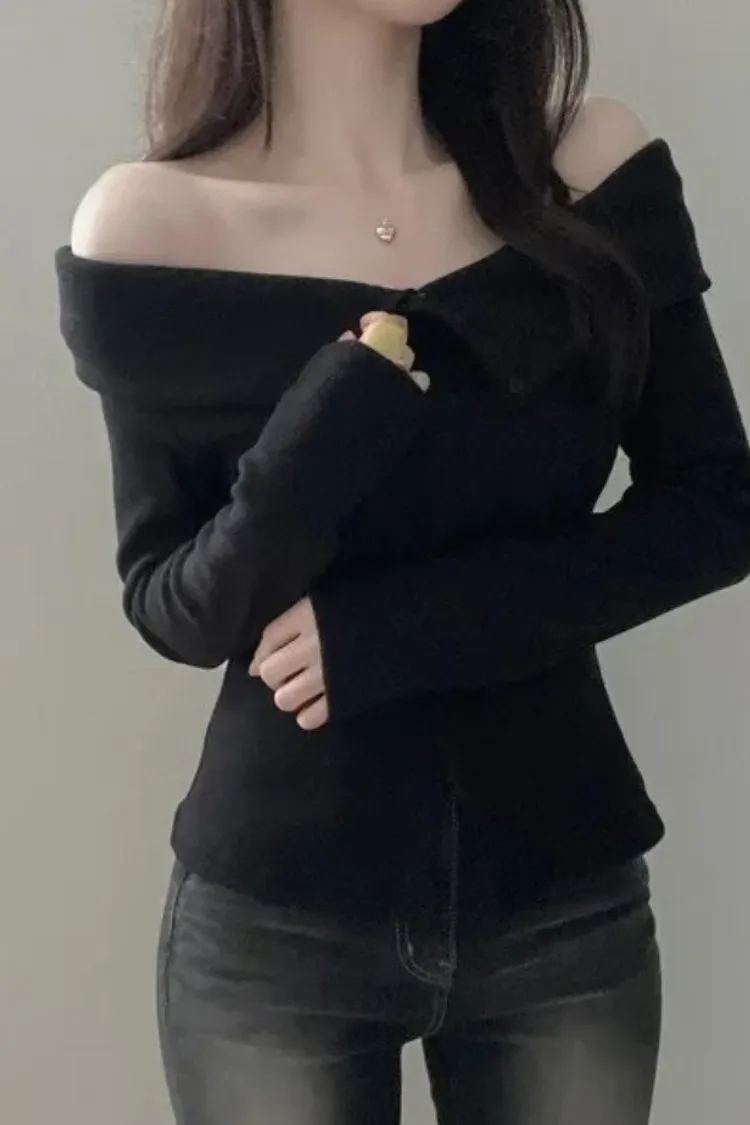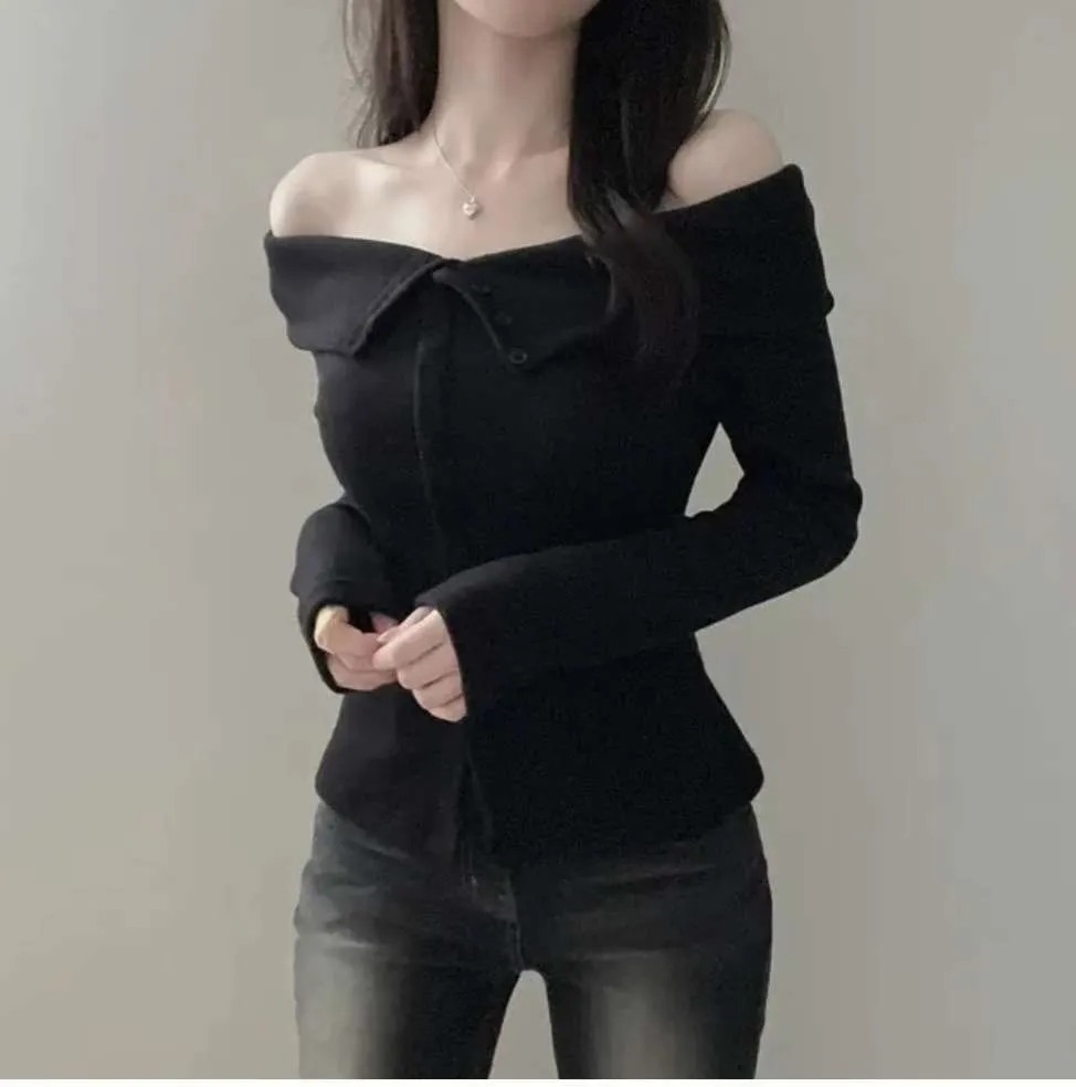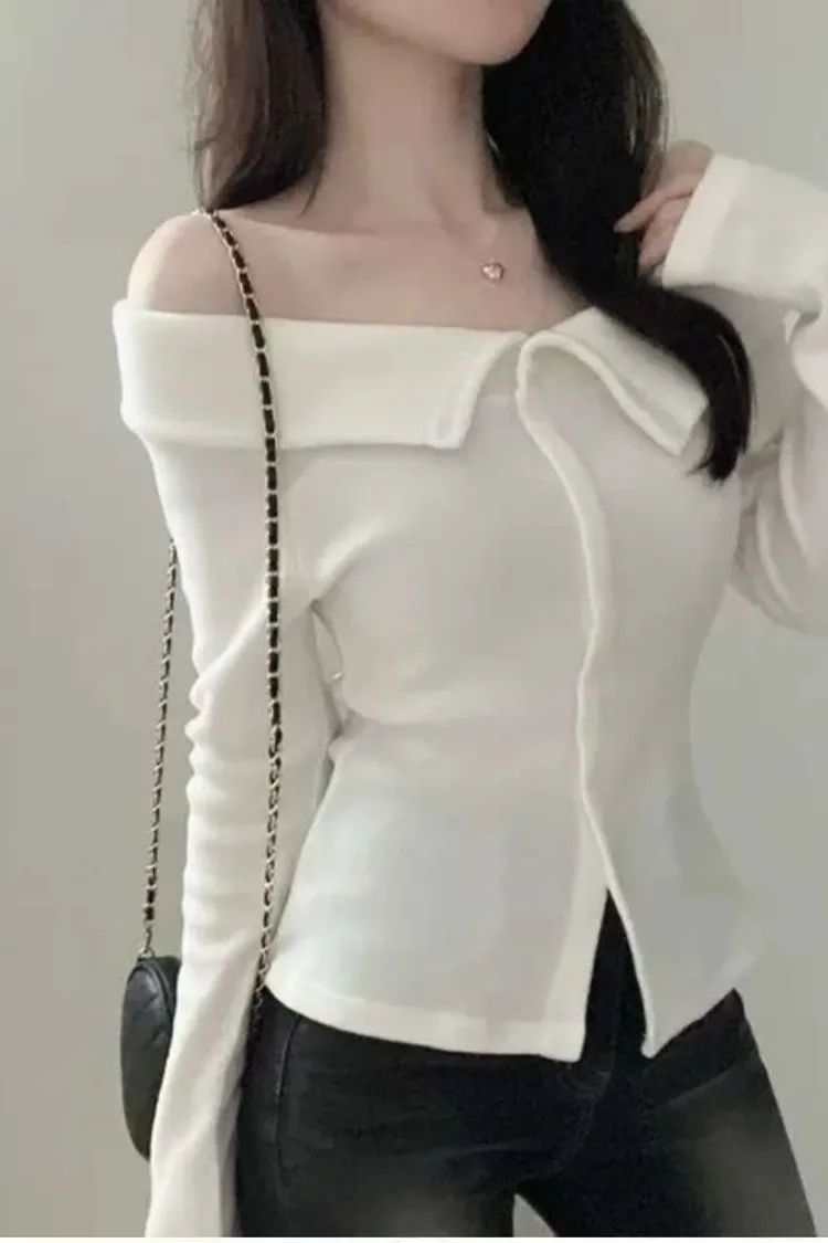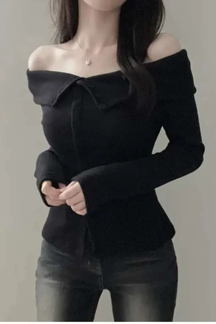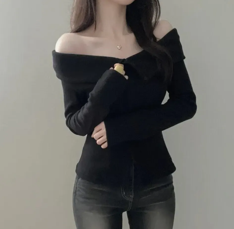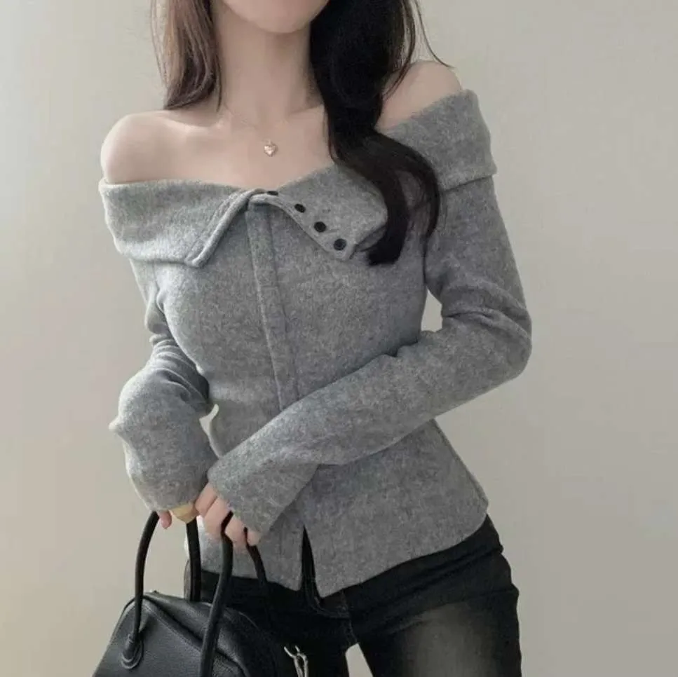 溫柔家排釦翻領一字領腰身磨毛上衣
