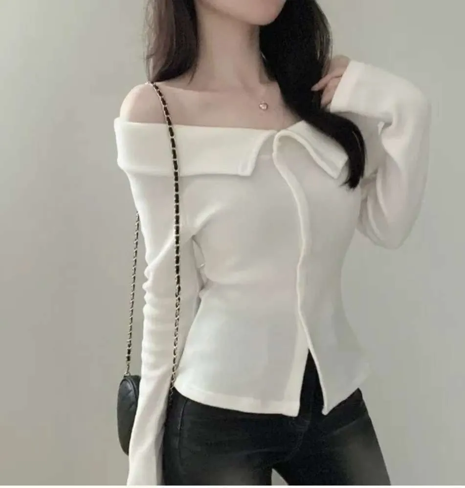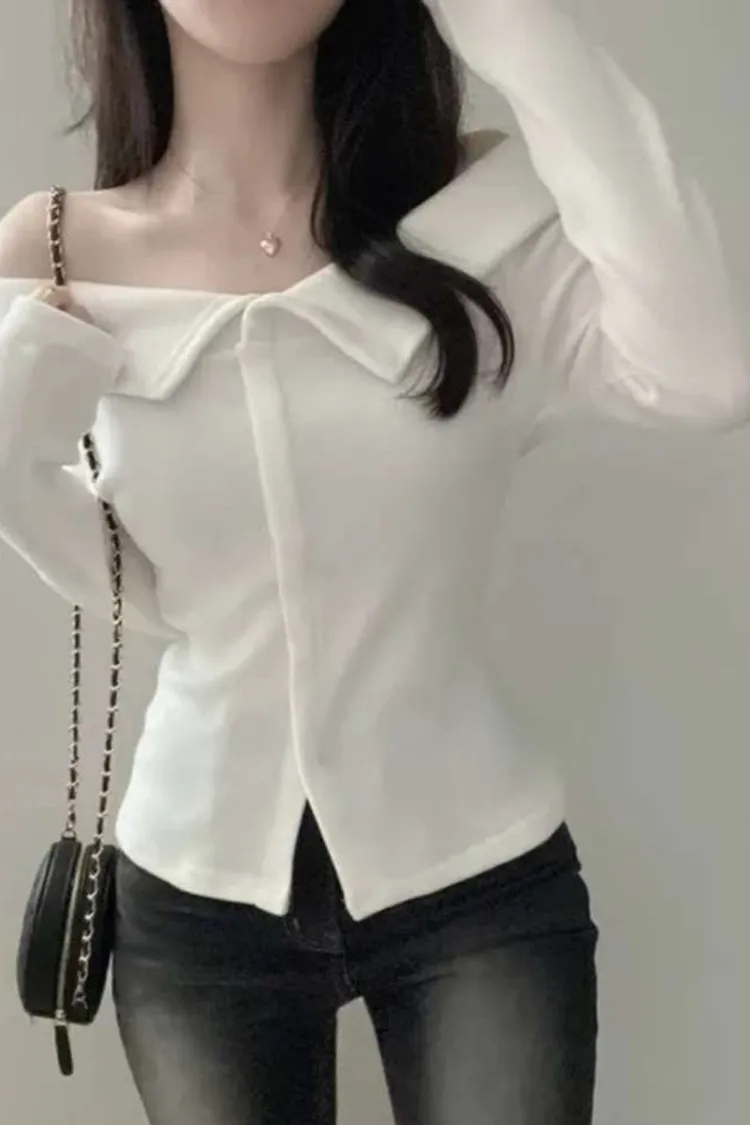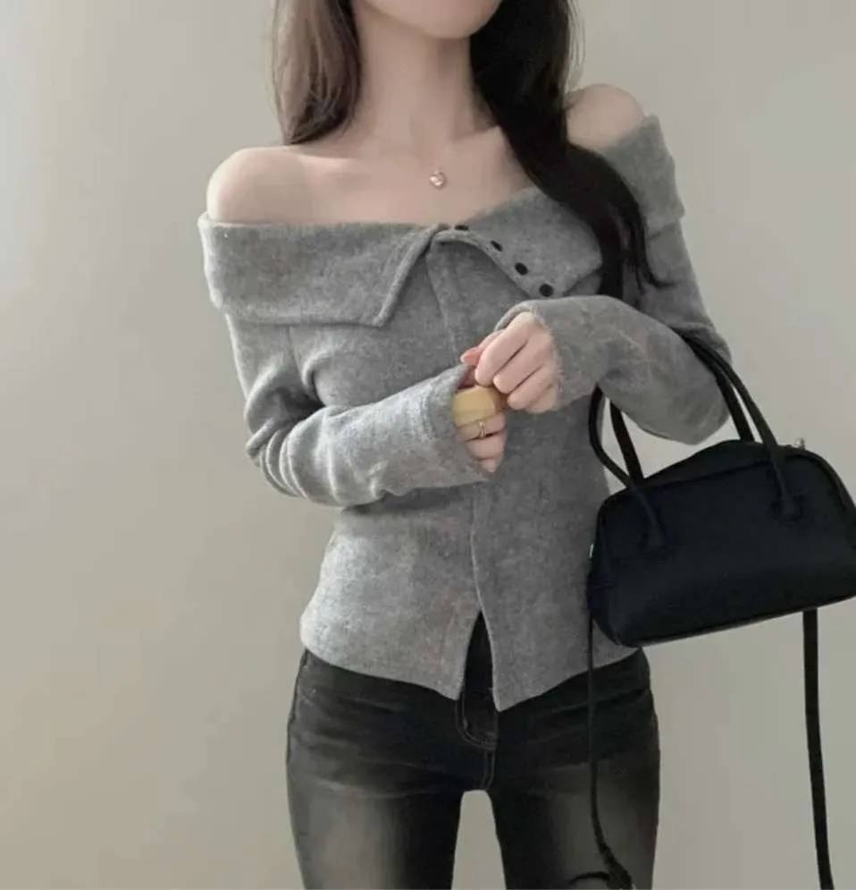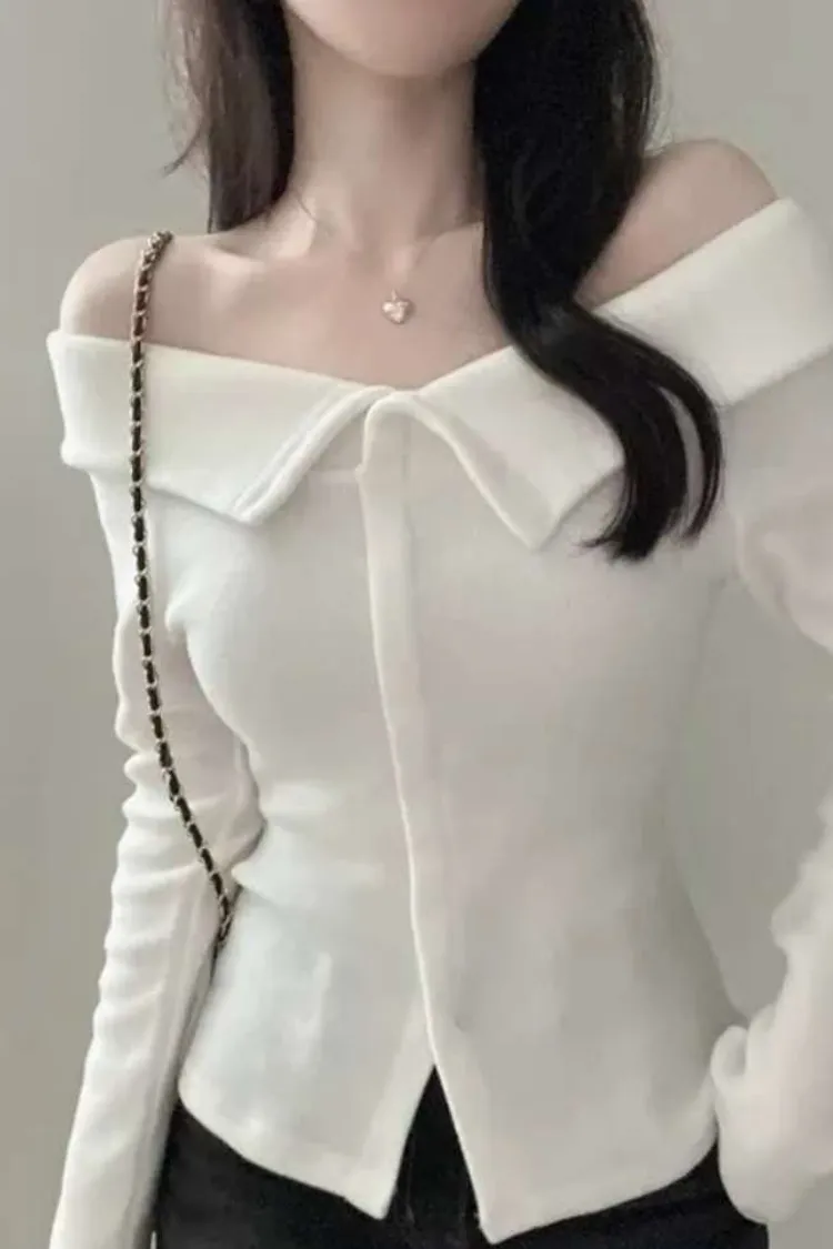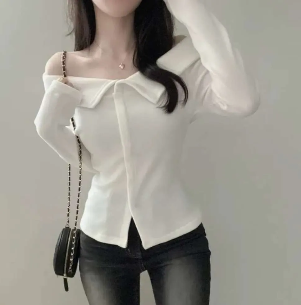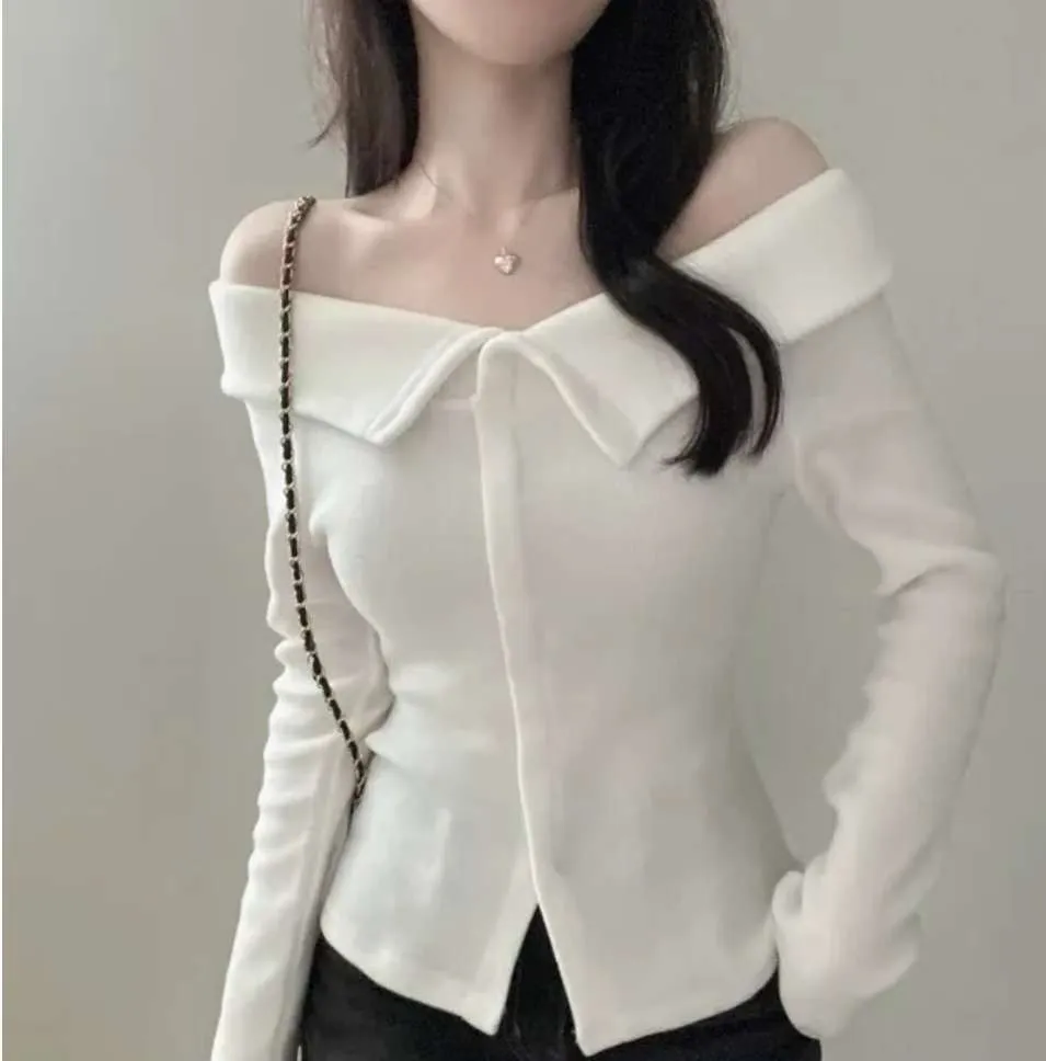 溫柔家排釦翻領一字領腰身磨毛上衣