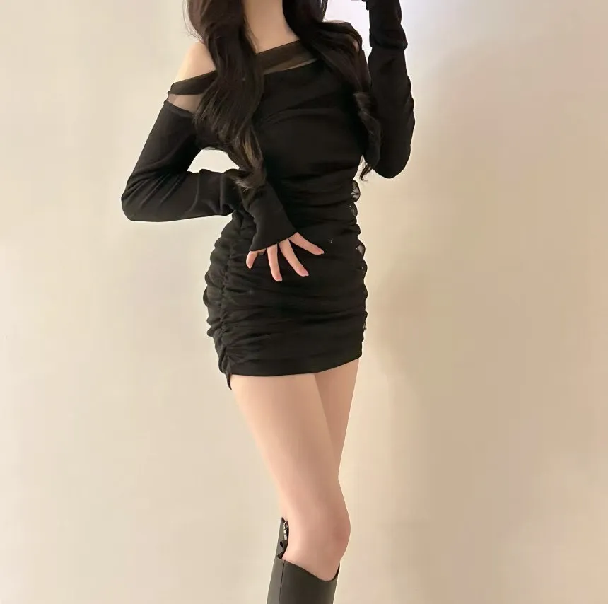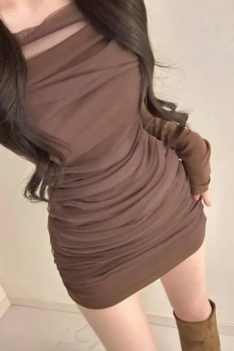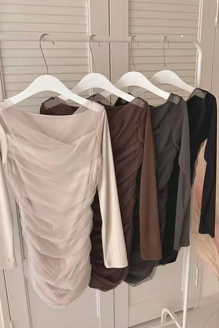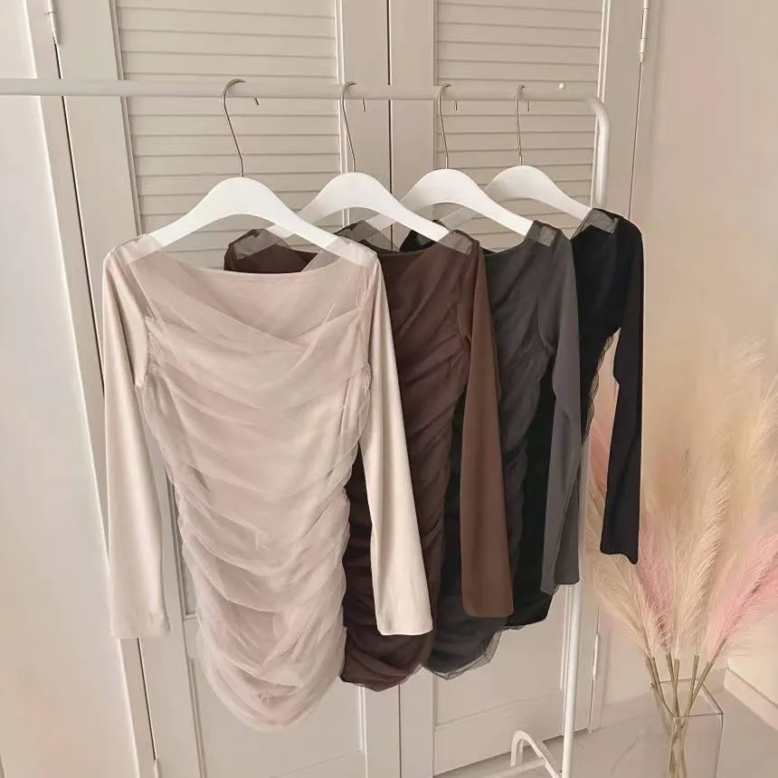 私藏高級感拼接網紗彈力包臀洋