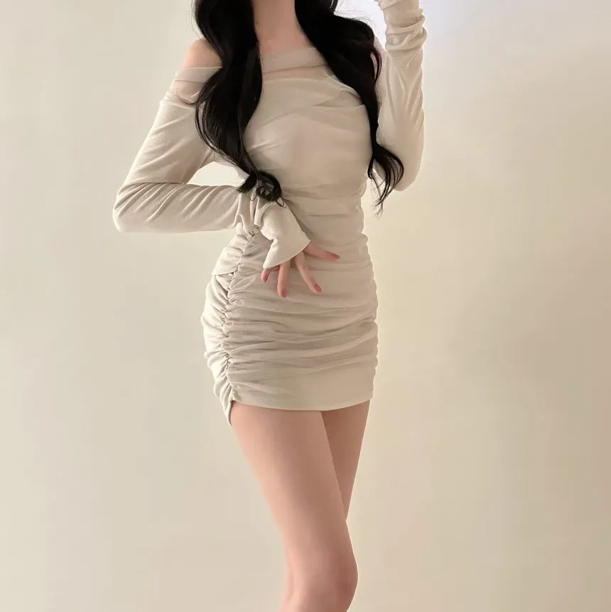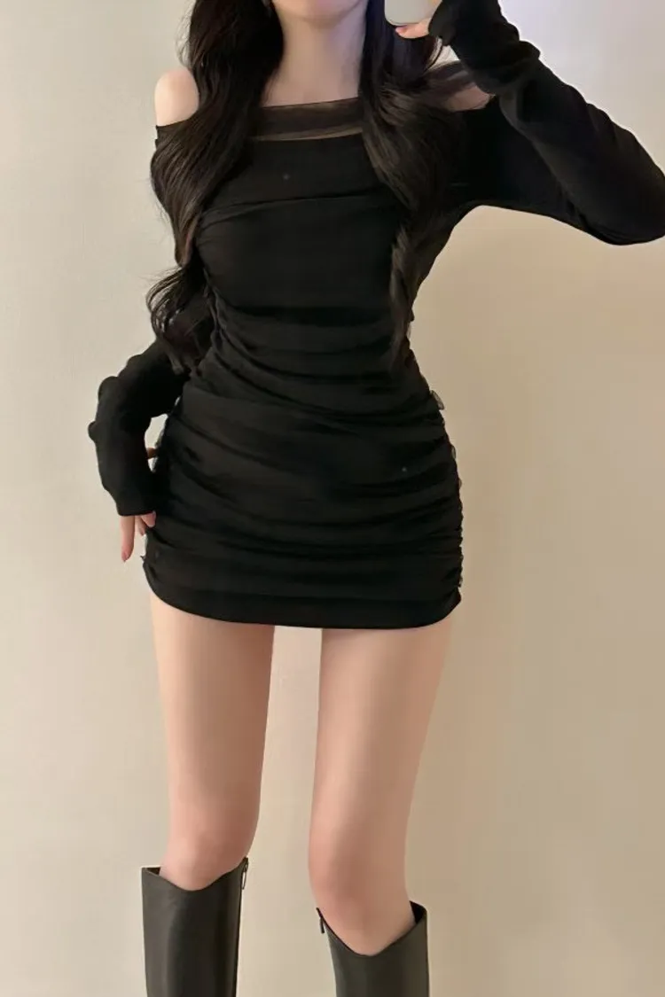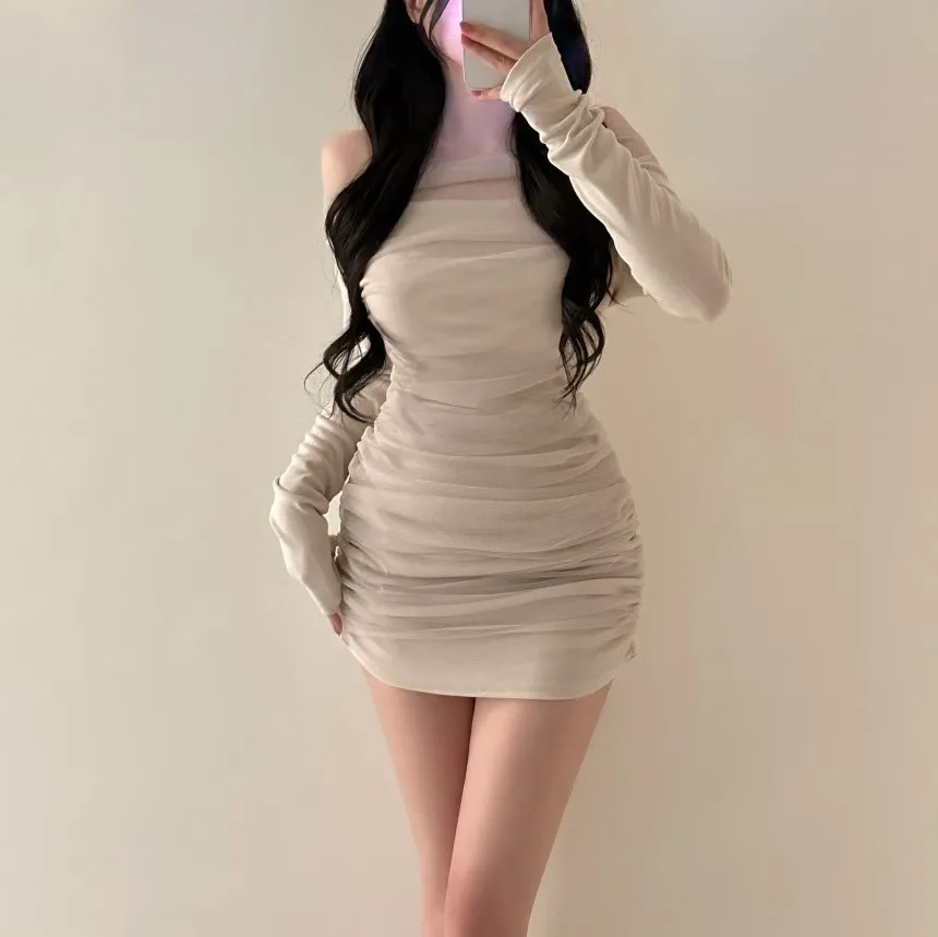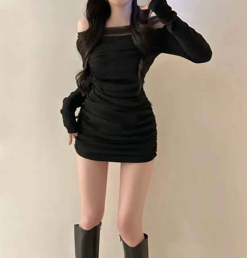 私藏高級感拼接網紗彈力包臀洋
