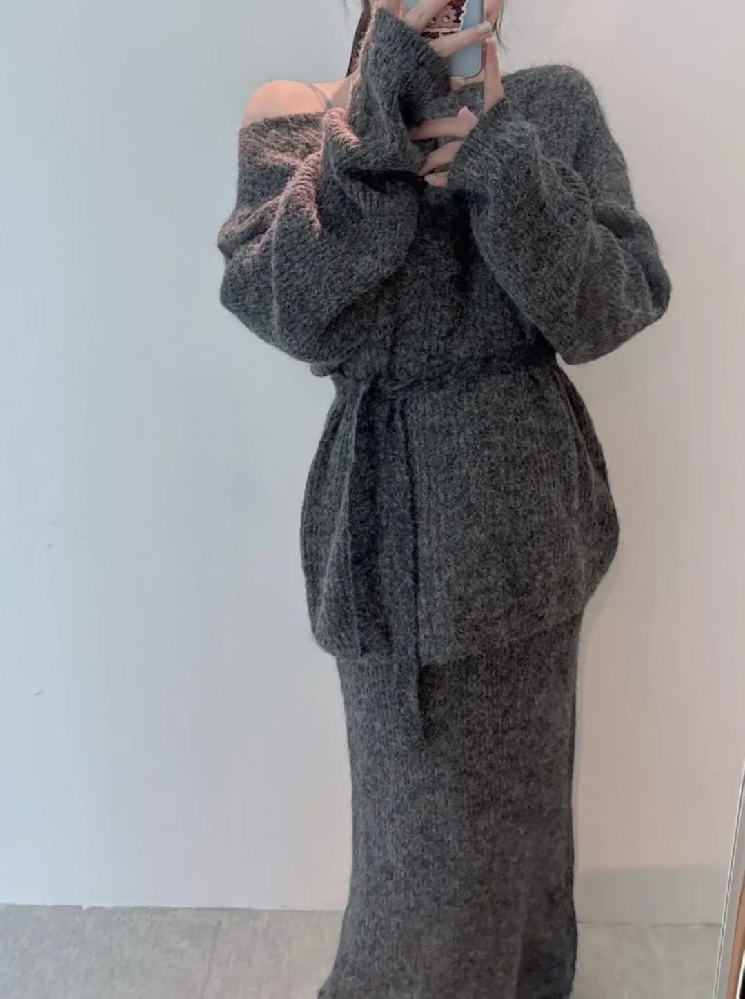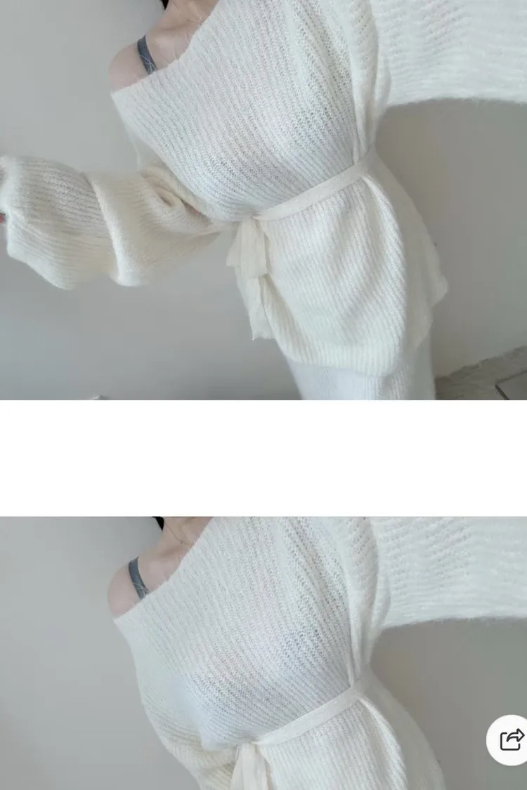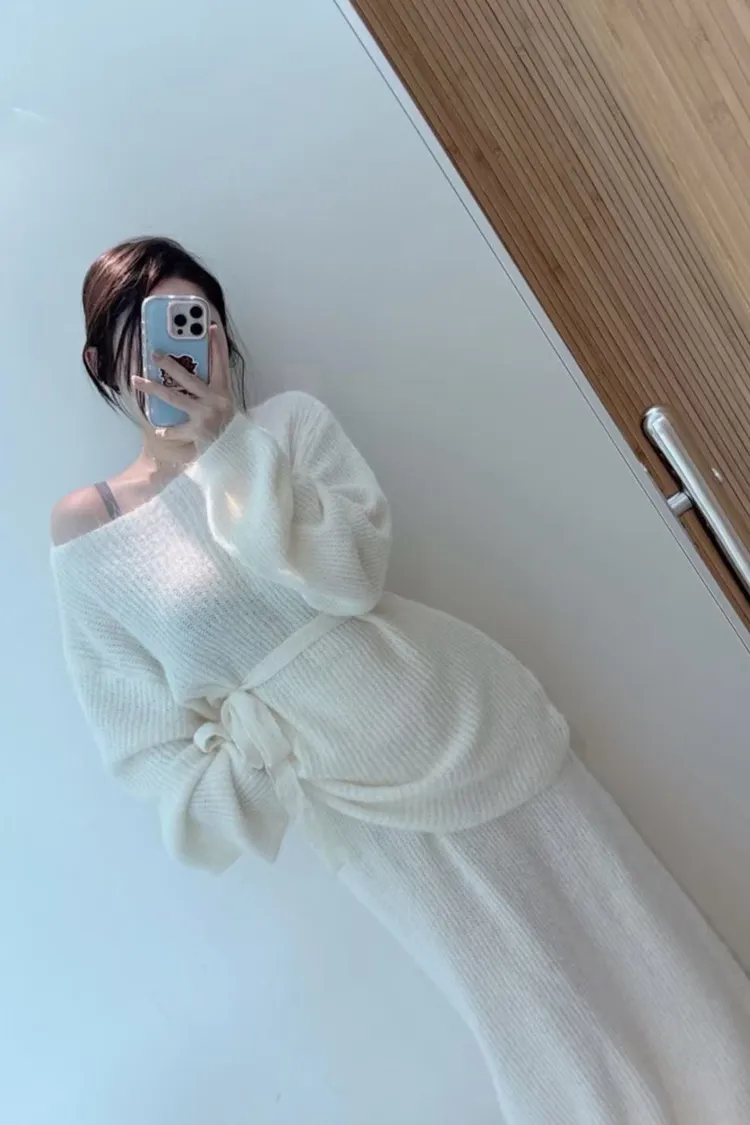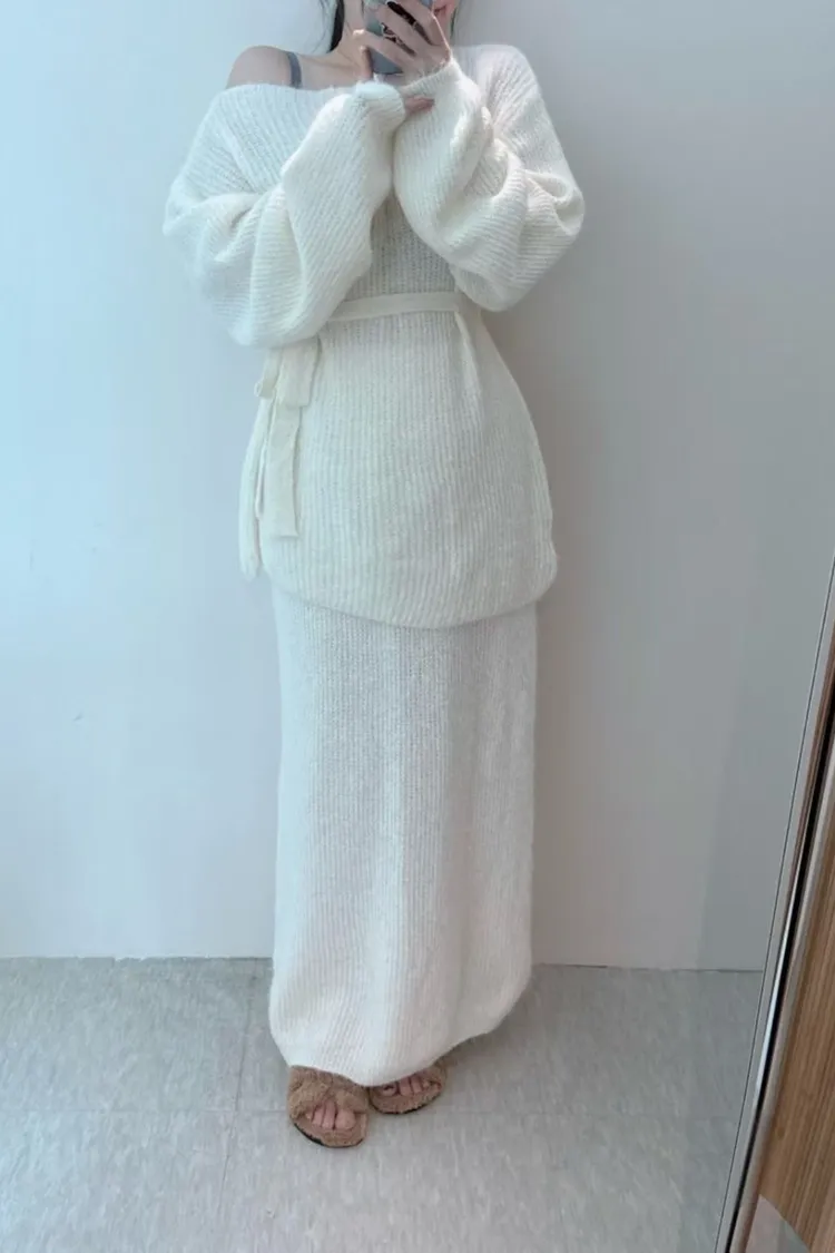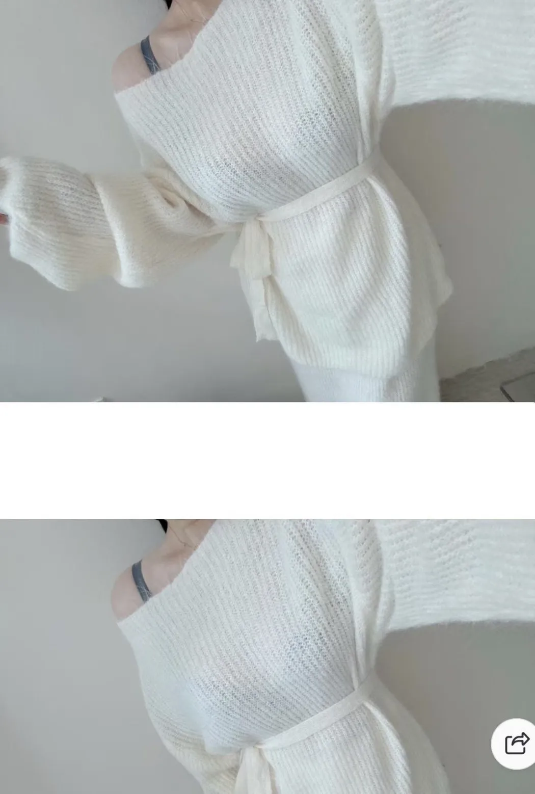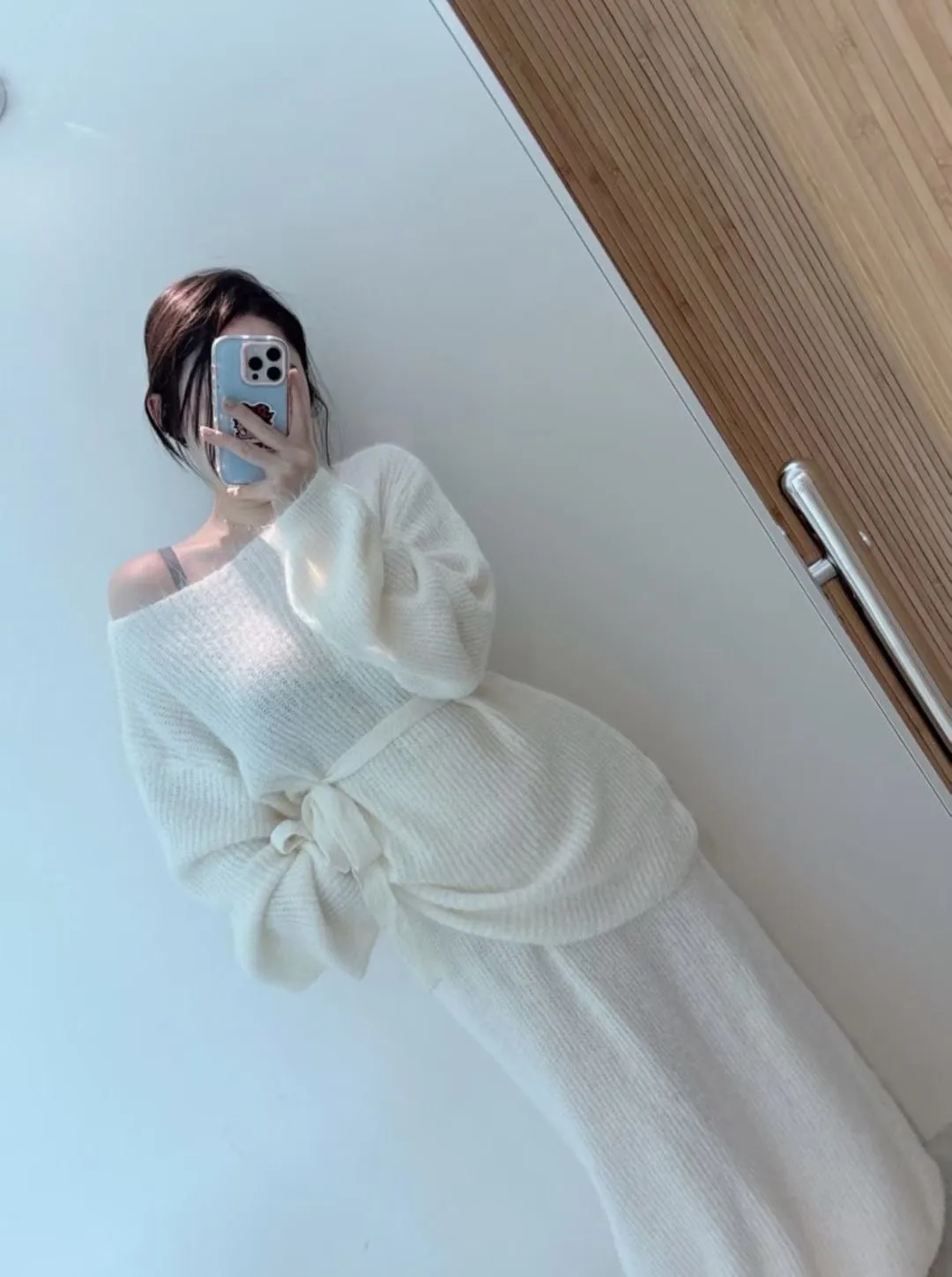 秋冬歐膩日常針織寬鬆兩件式set:寬鬆斜肩寬鬆上衣+高腰半身裙(附綁帶)