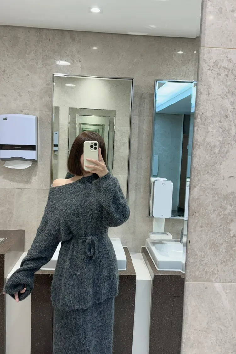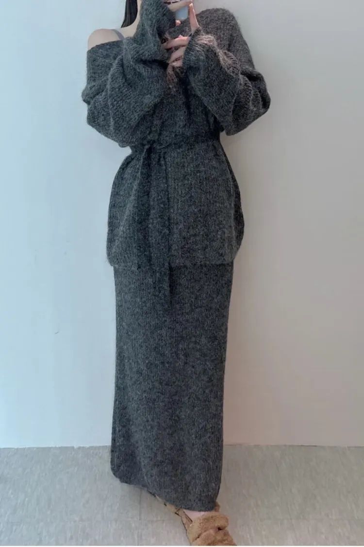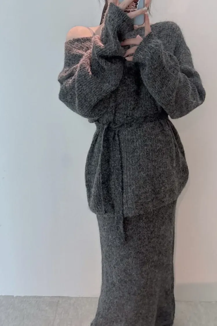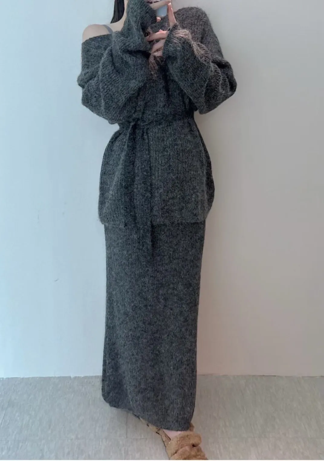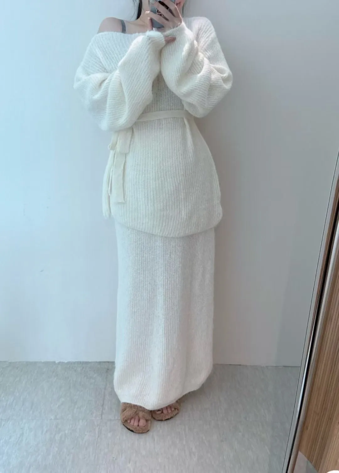 秋冬歐膩日常針織寬鬆兩件式set:寬鬆斜肩寬鬆上衣+高腰半身裙(附綁帶)