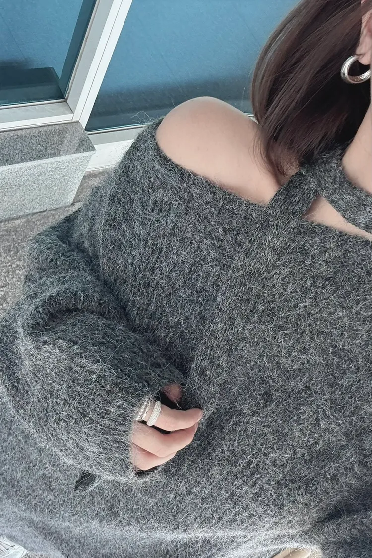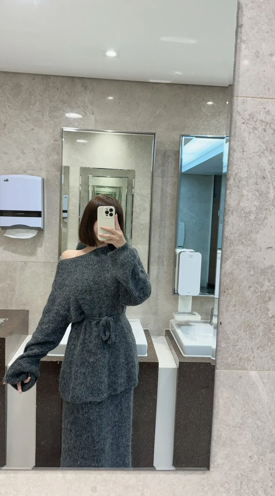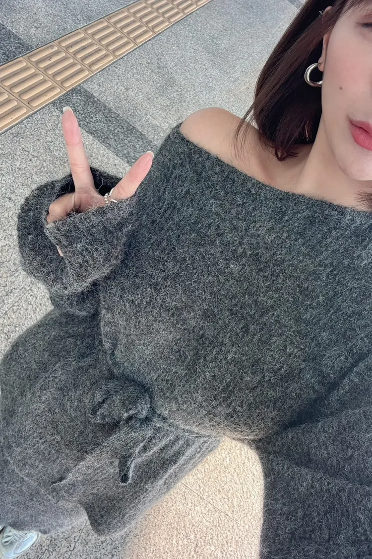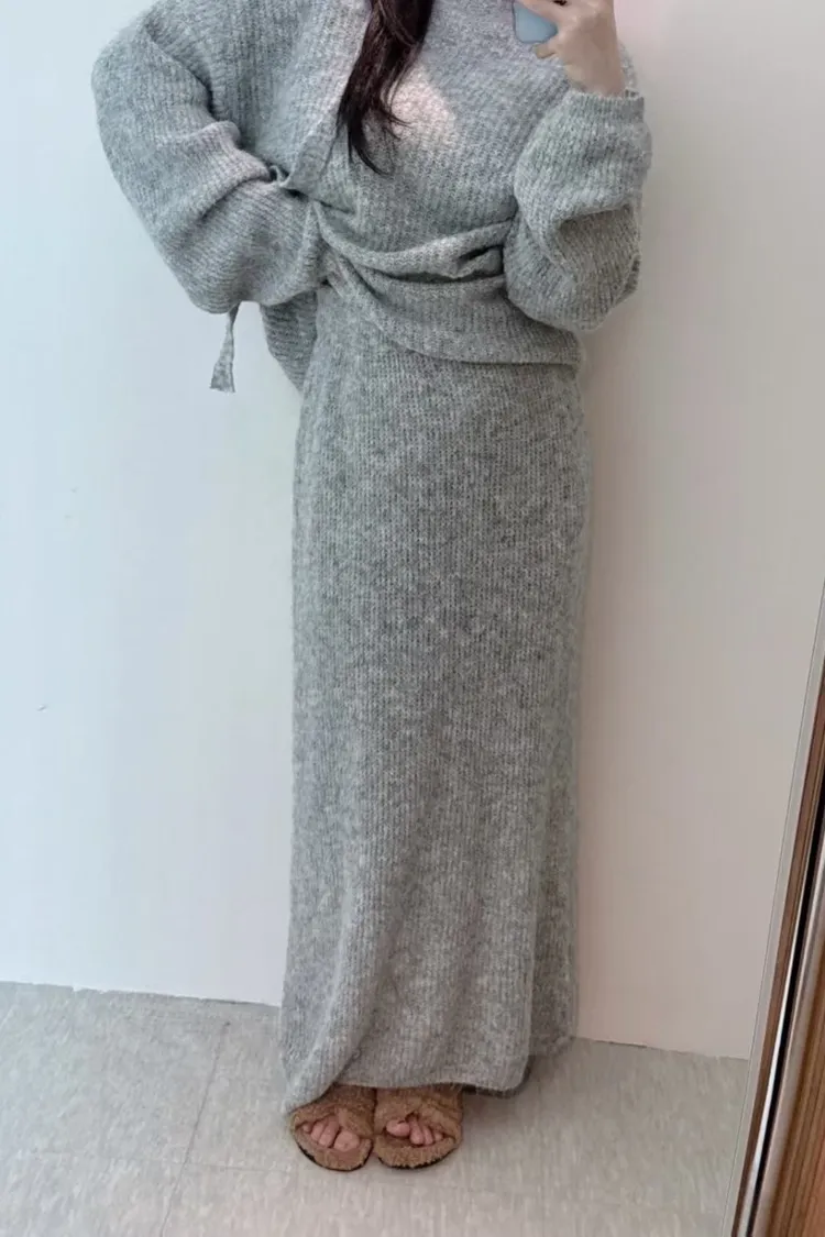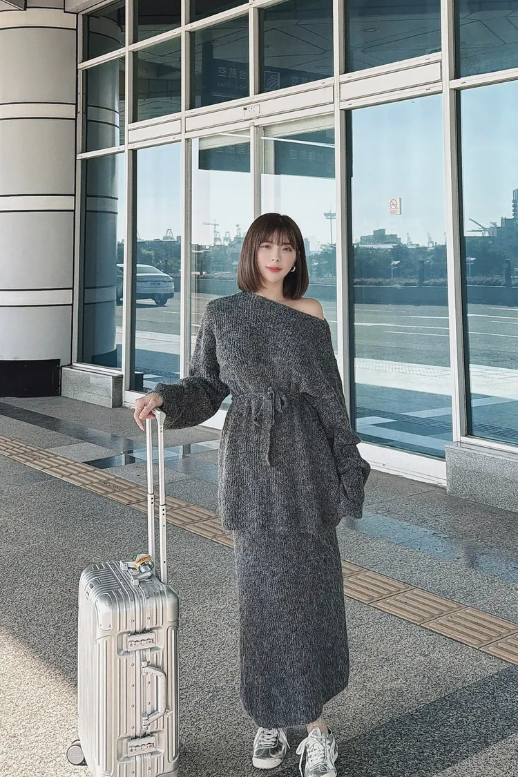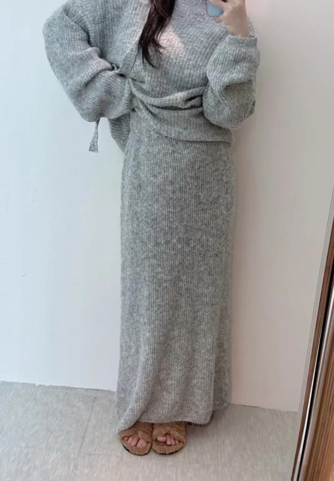 秋冬歐膩日常針織寬鬆兩件式set:寬鬆斜肩寬鬆上衣+高腰半身裙(附綁帶)