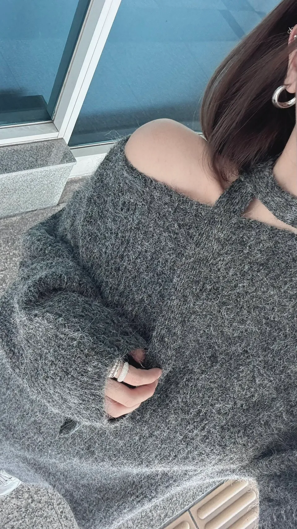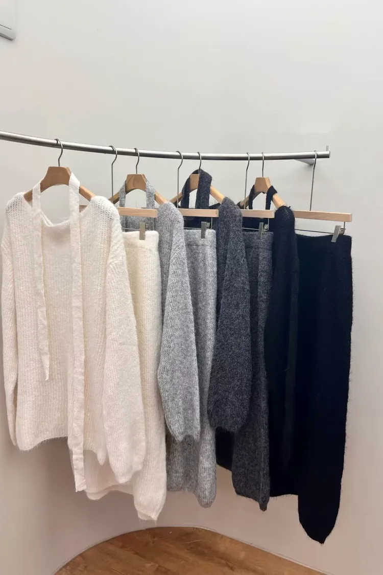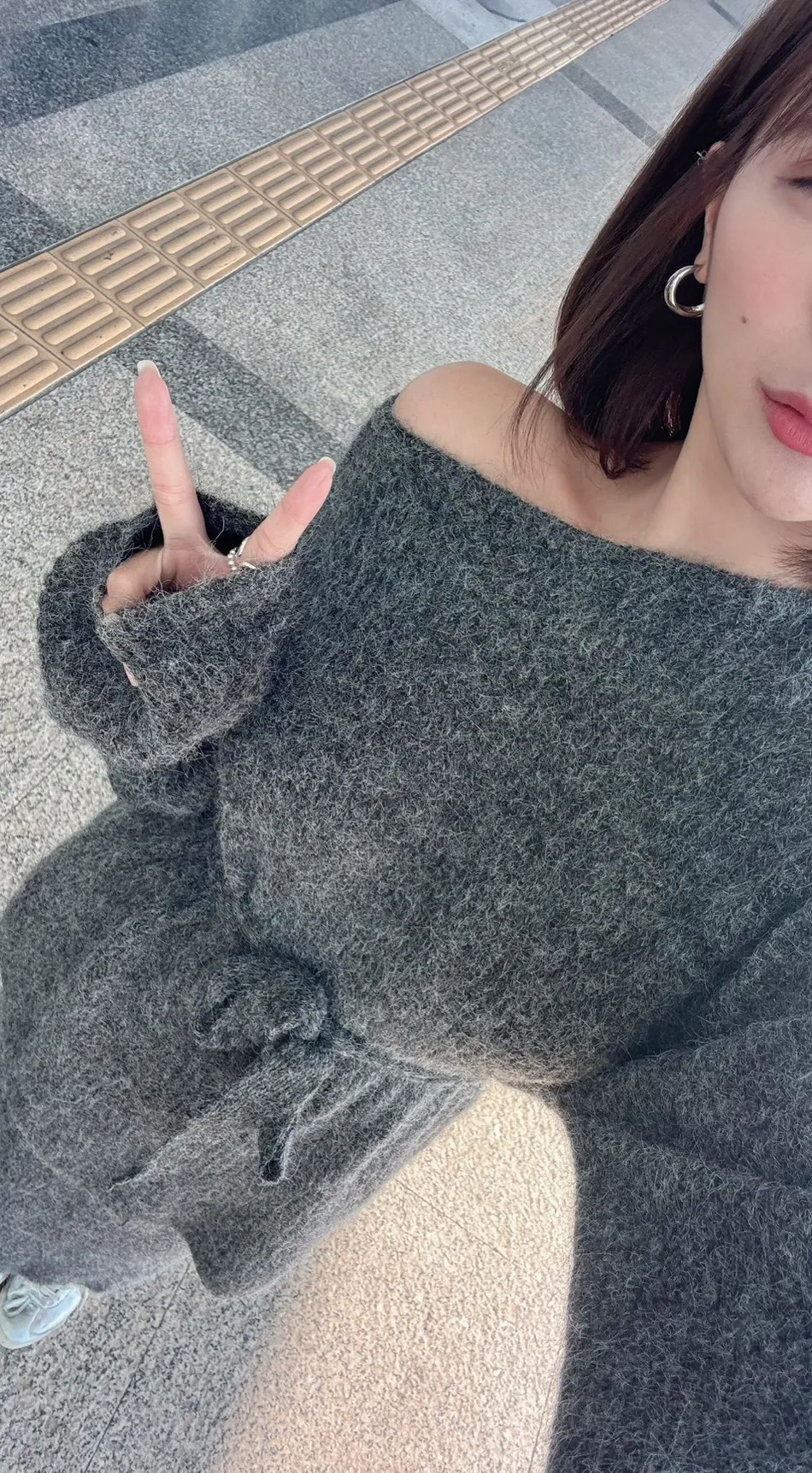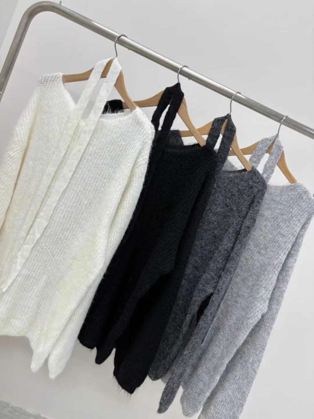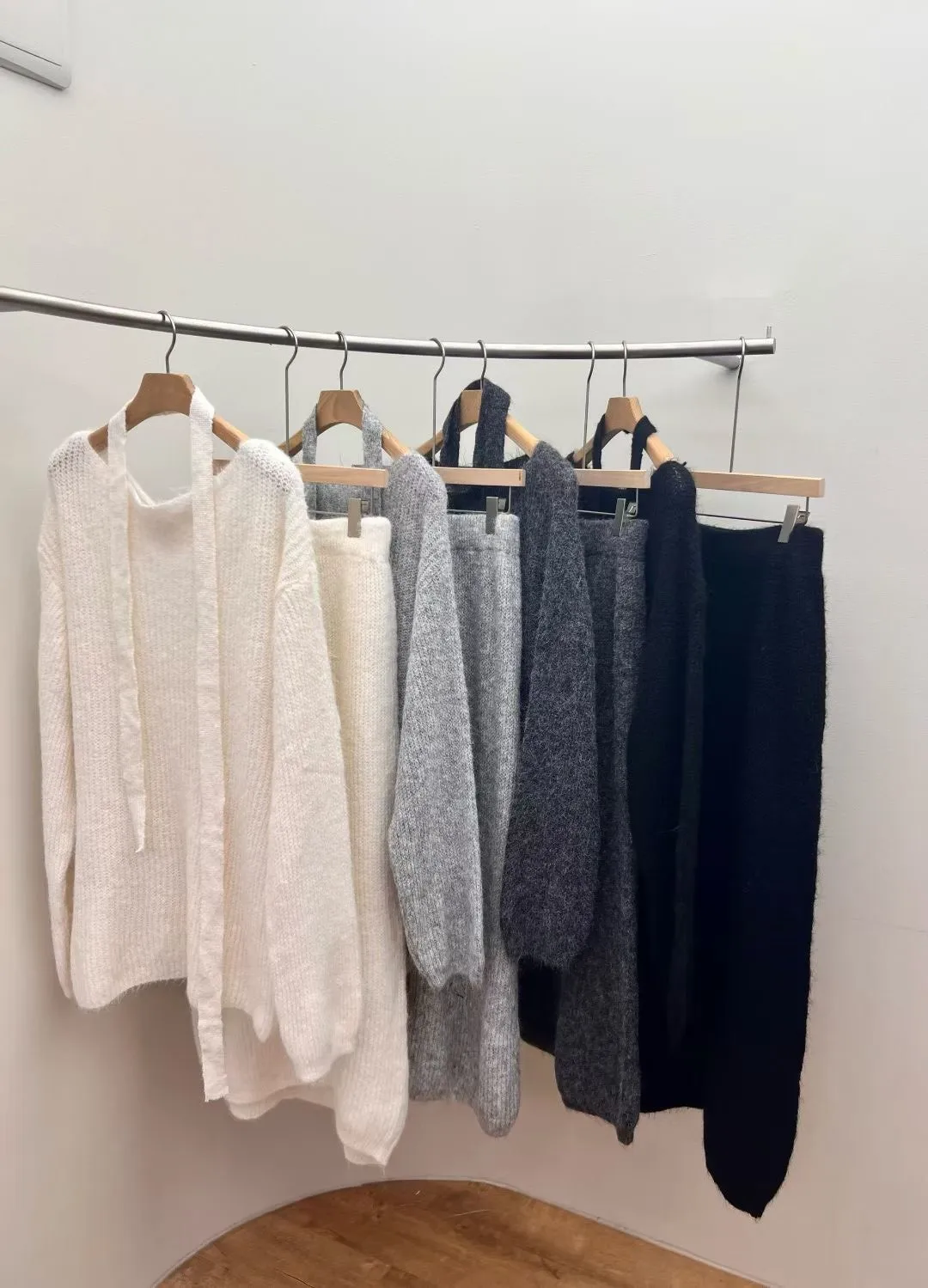 秋冬歐膩日常針織寬鬆兩件式set:寬鬆斜肩寬鬆上衣+高腰半身裙(附綁帶)