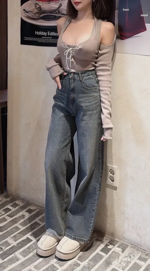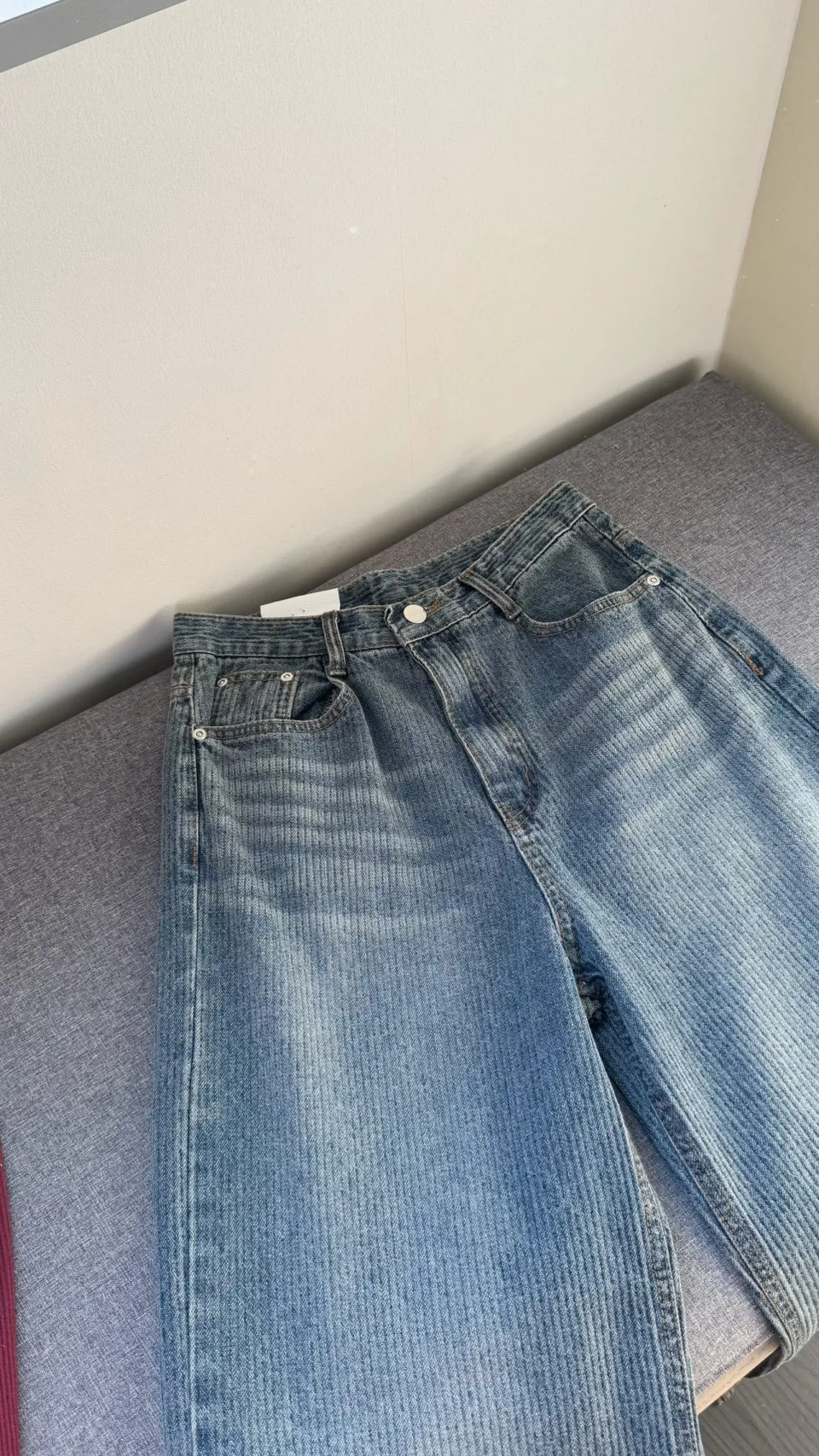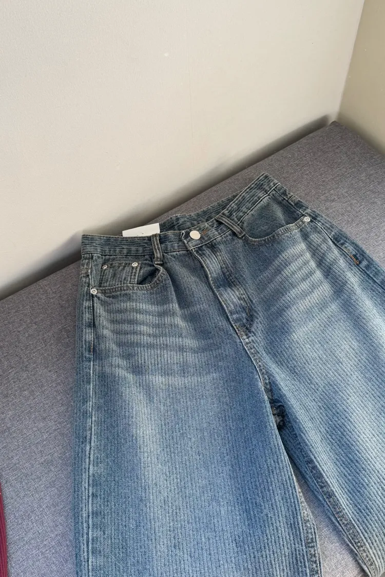 私藏款復古高腰燈芯絨坑條刷色牛仔寬褲