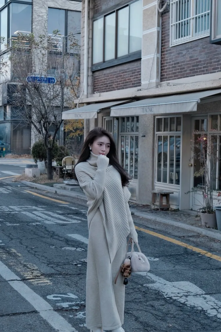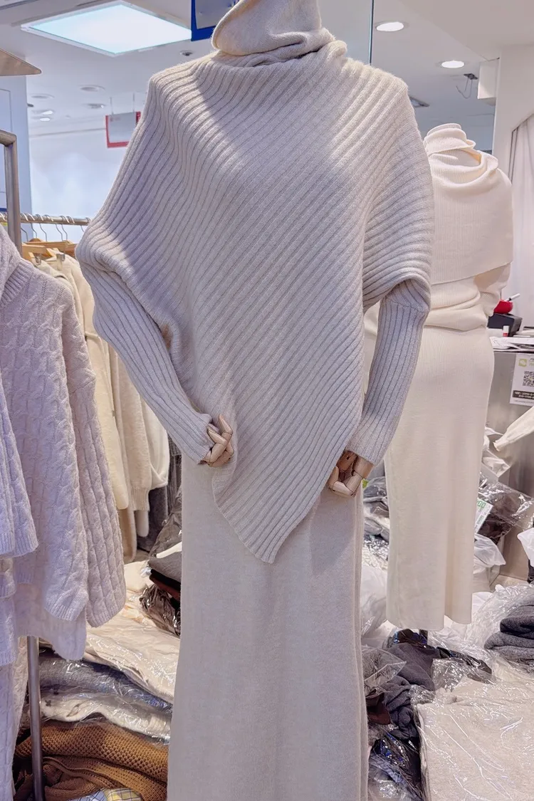 溫柔高級感不規則坑條針織高領上衣+半身裙