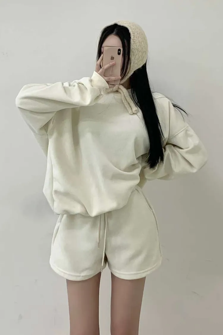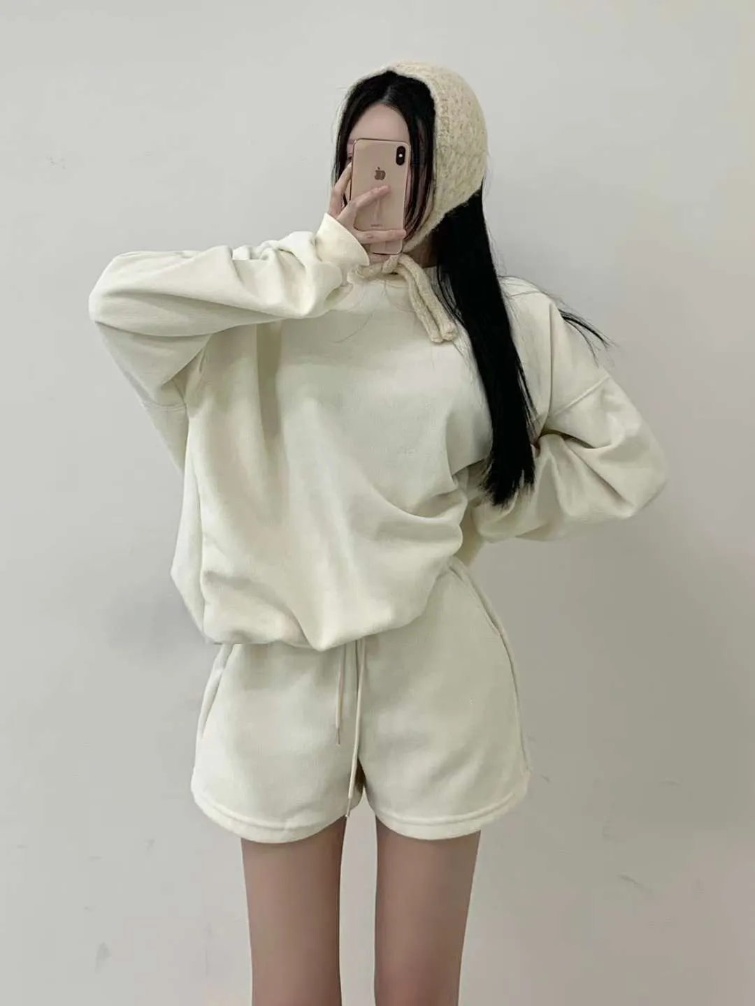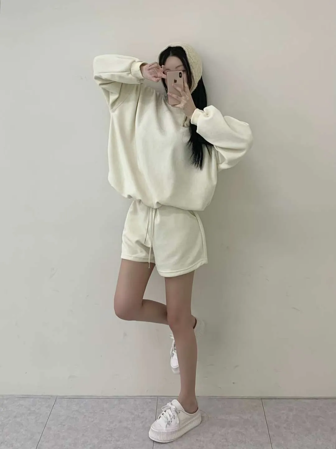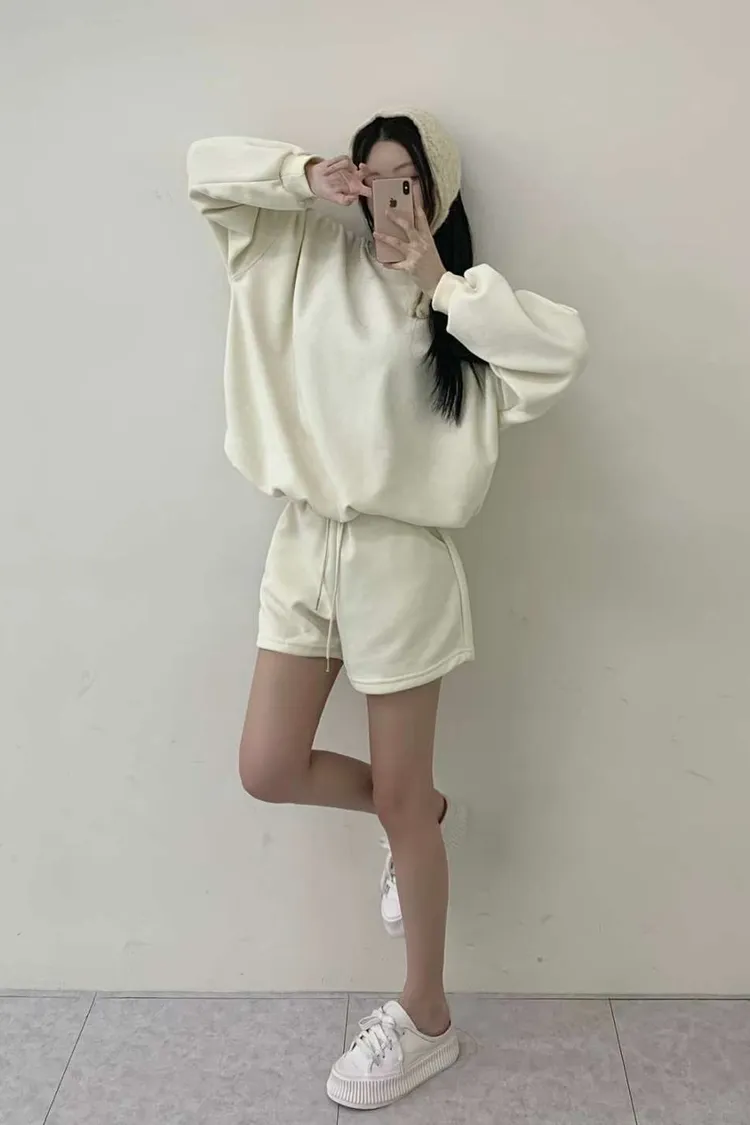 甜美休閒美式寬鬆內刷毛兩件式套裝:大學tee+綁帶短褲