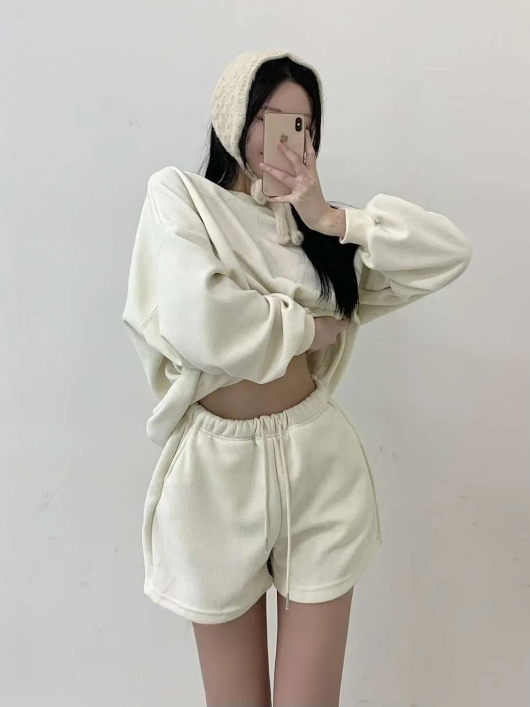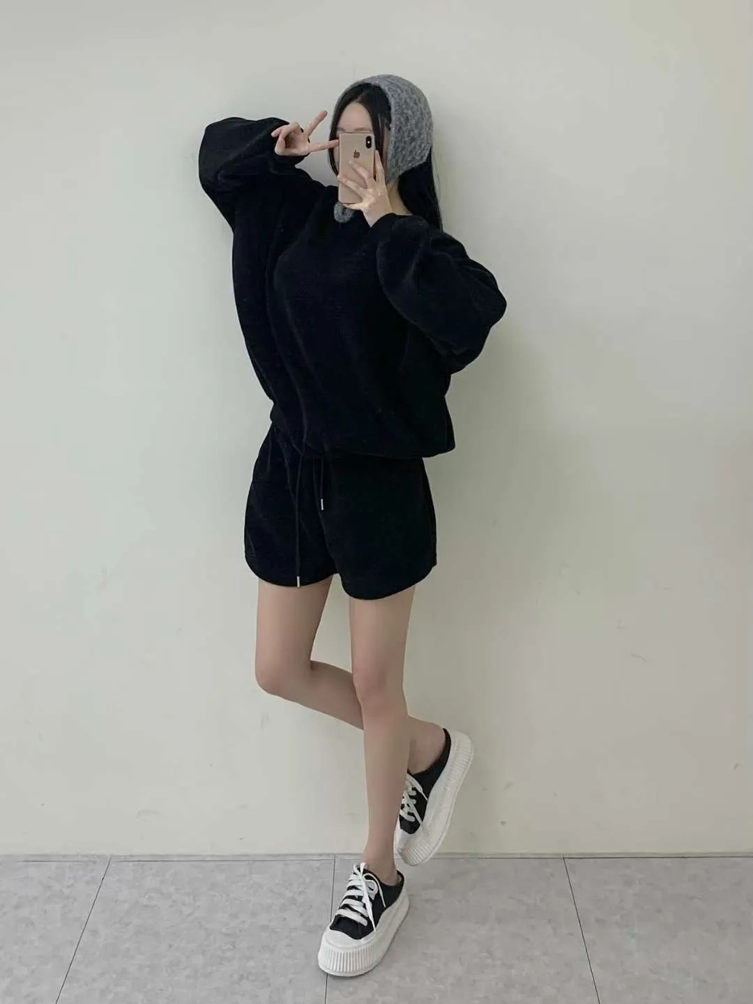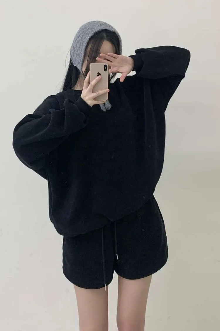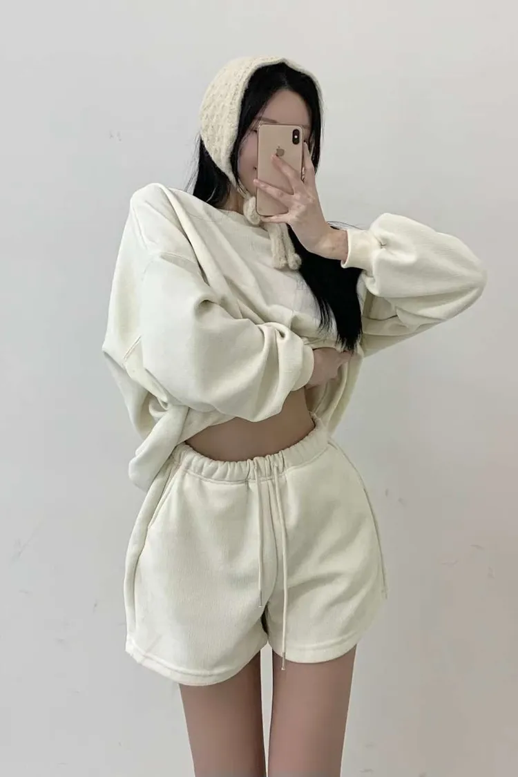 甜美休閒美式寬鬆內刷毛兩件式套裝:大學tee+綁帶短褲