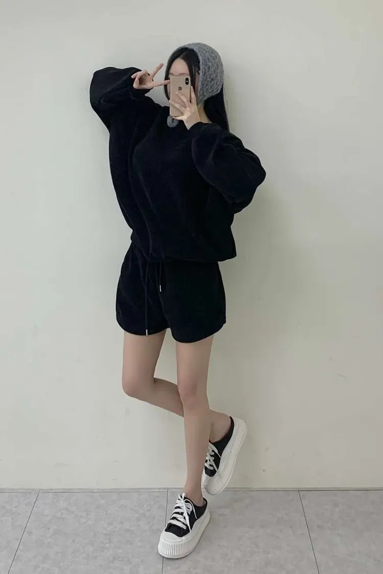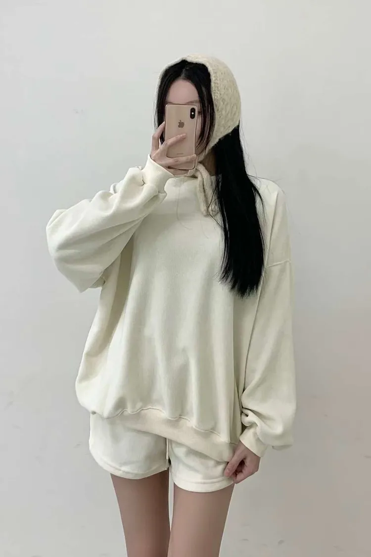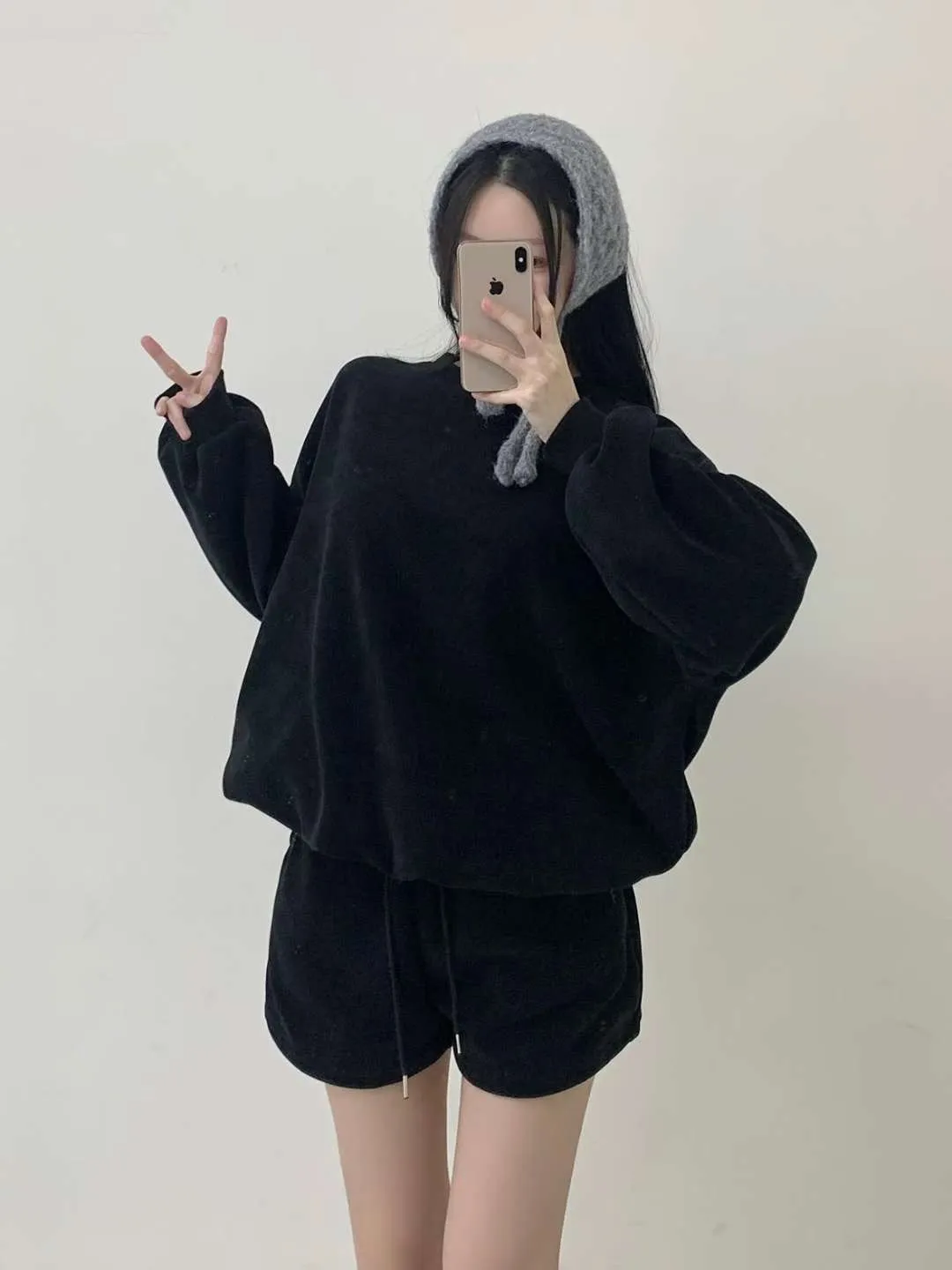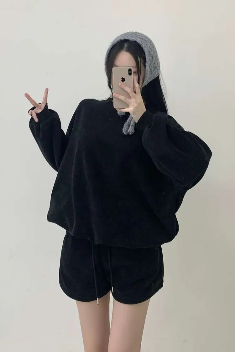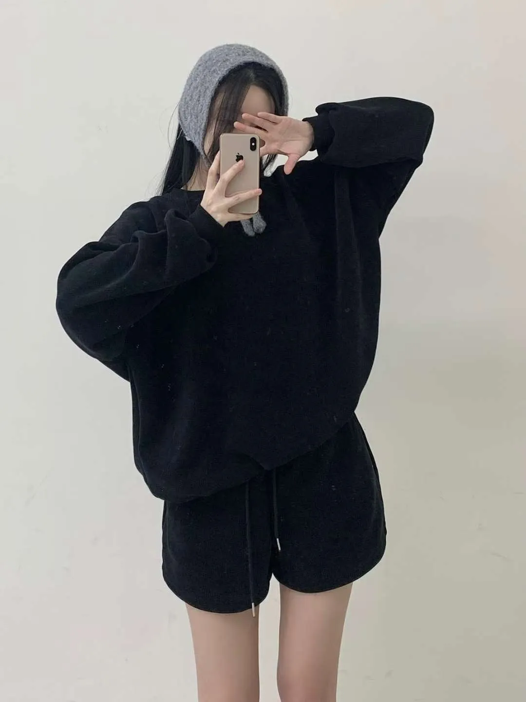 甜美休閒美式寬鬆內刷毛兩件式套裝:大學tee+綁帶短褲