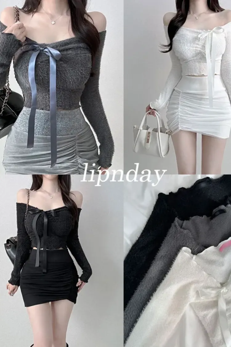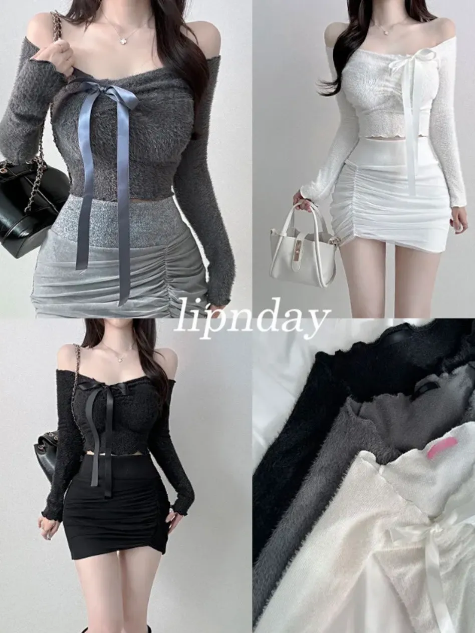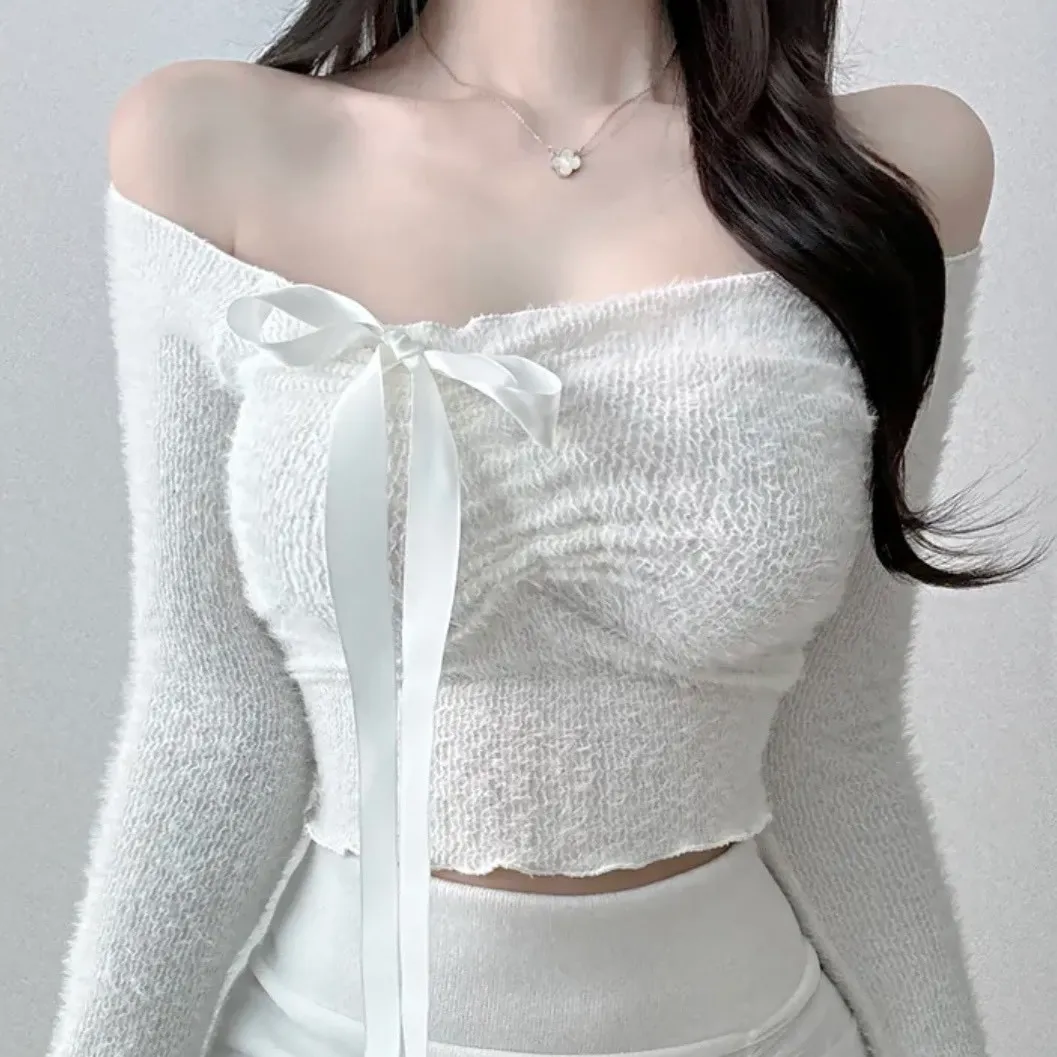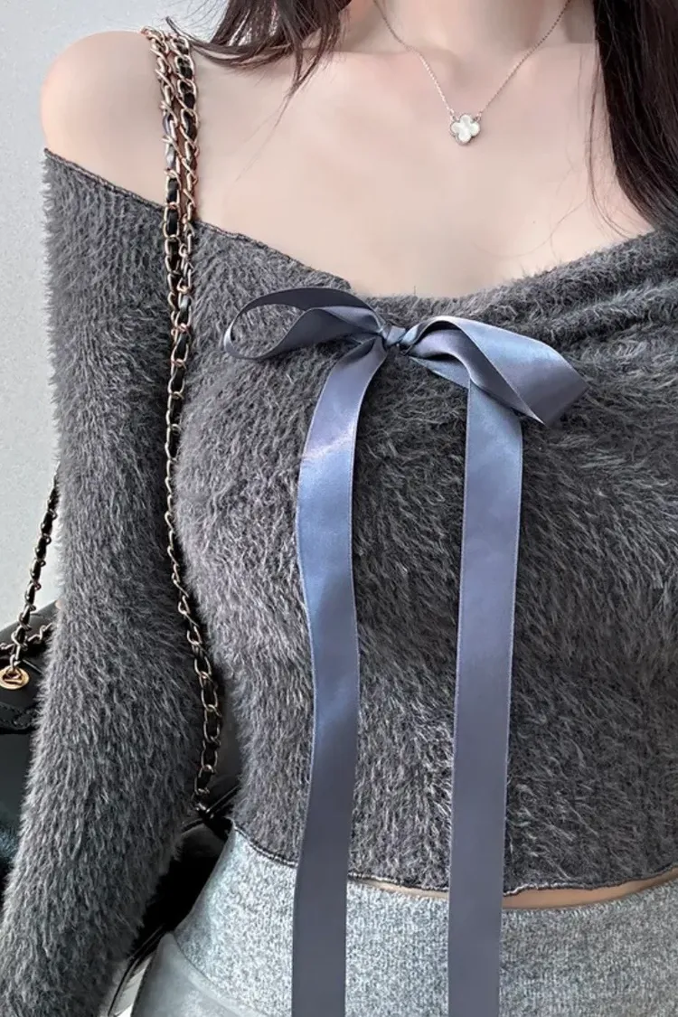 歐膩家絨毛親膚緞帶彈力一字領上衣
