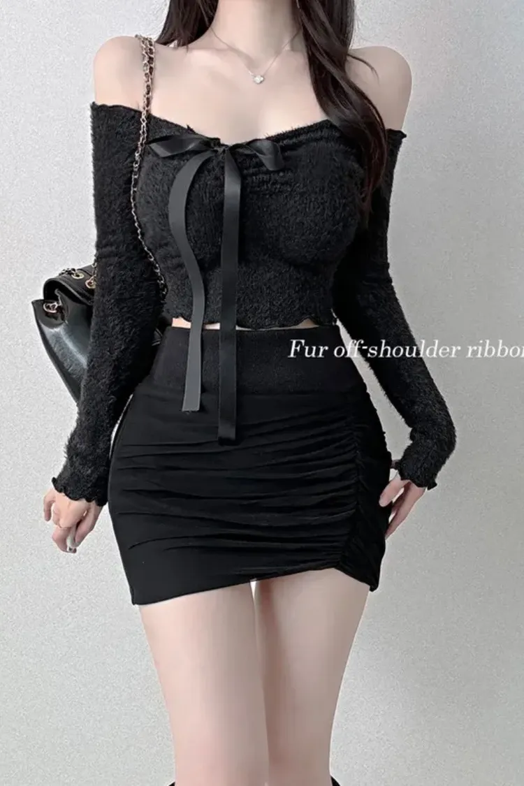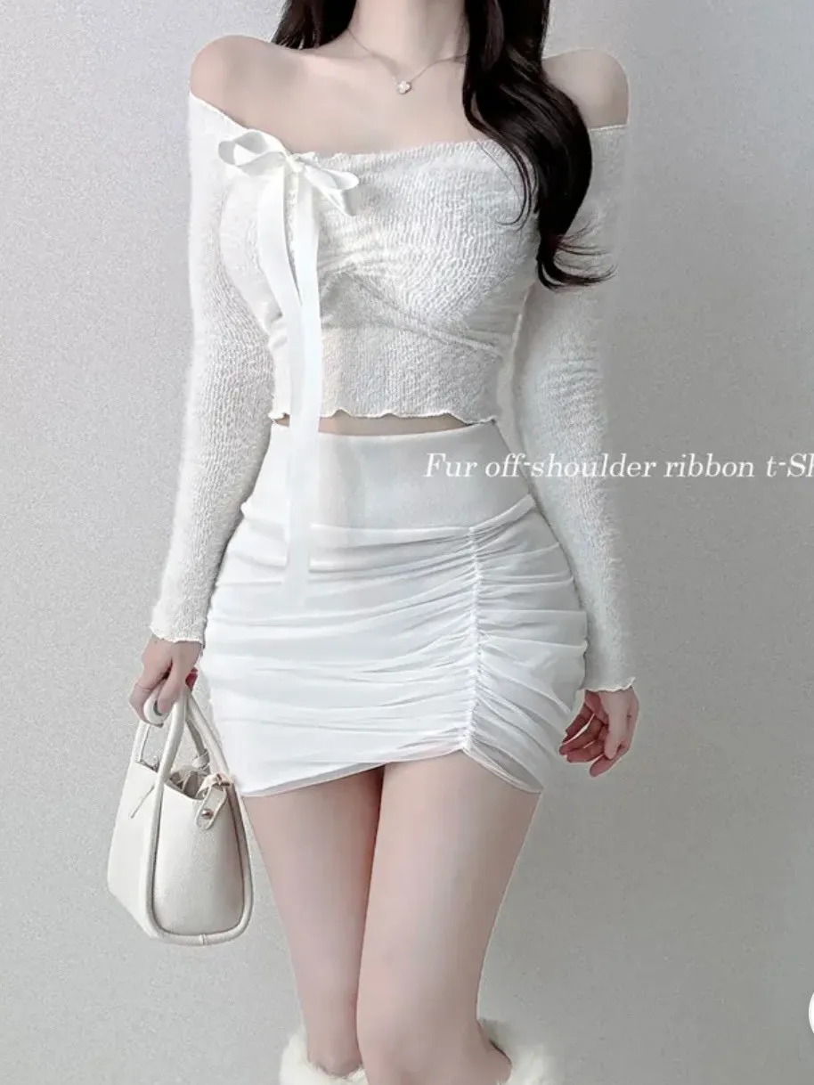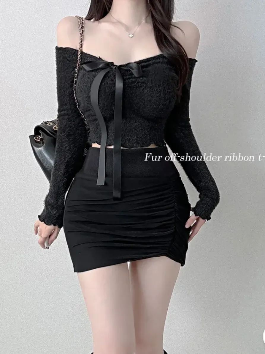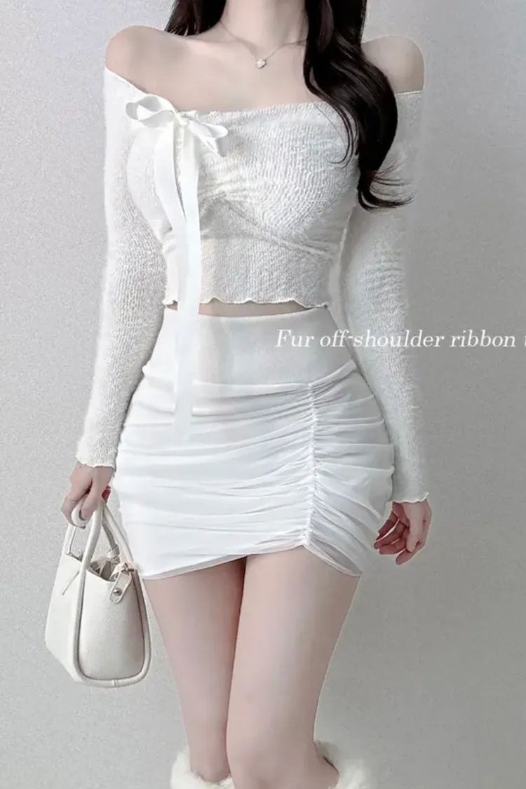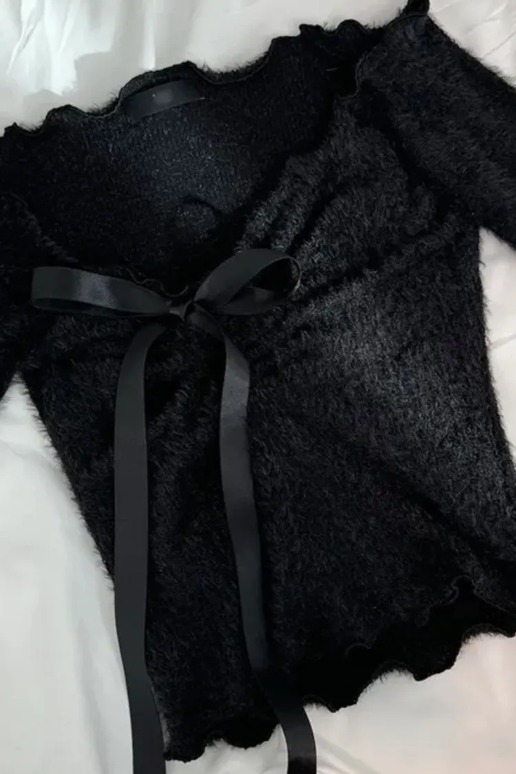 歐膩家絨毛親膚緞帶彈力一字領上衣