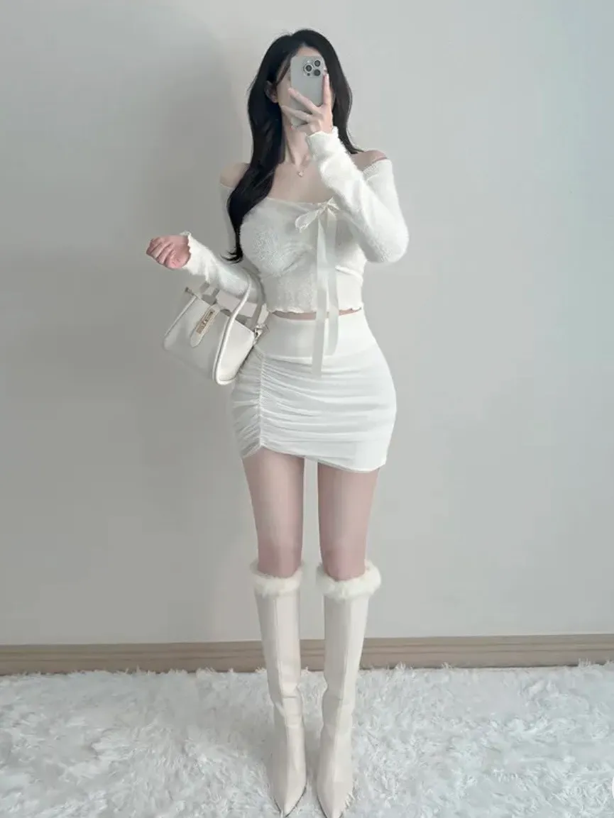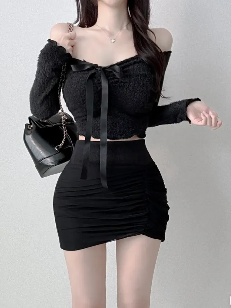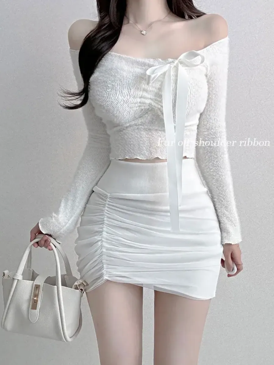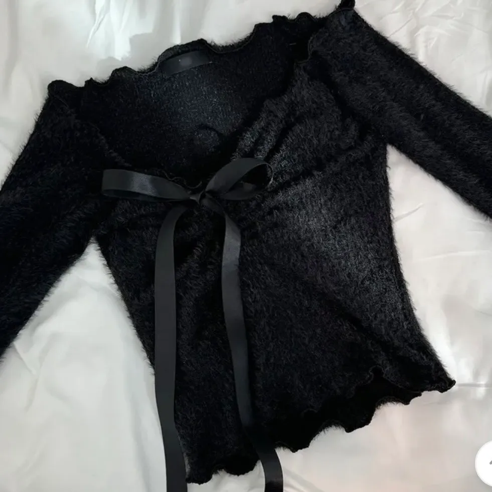 歐膩家絨毛親膚緞帶彈力一字領上衣