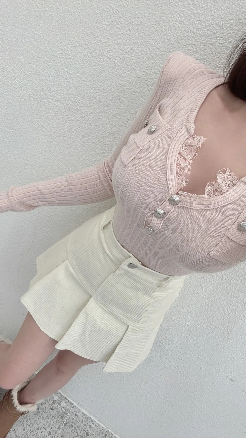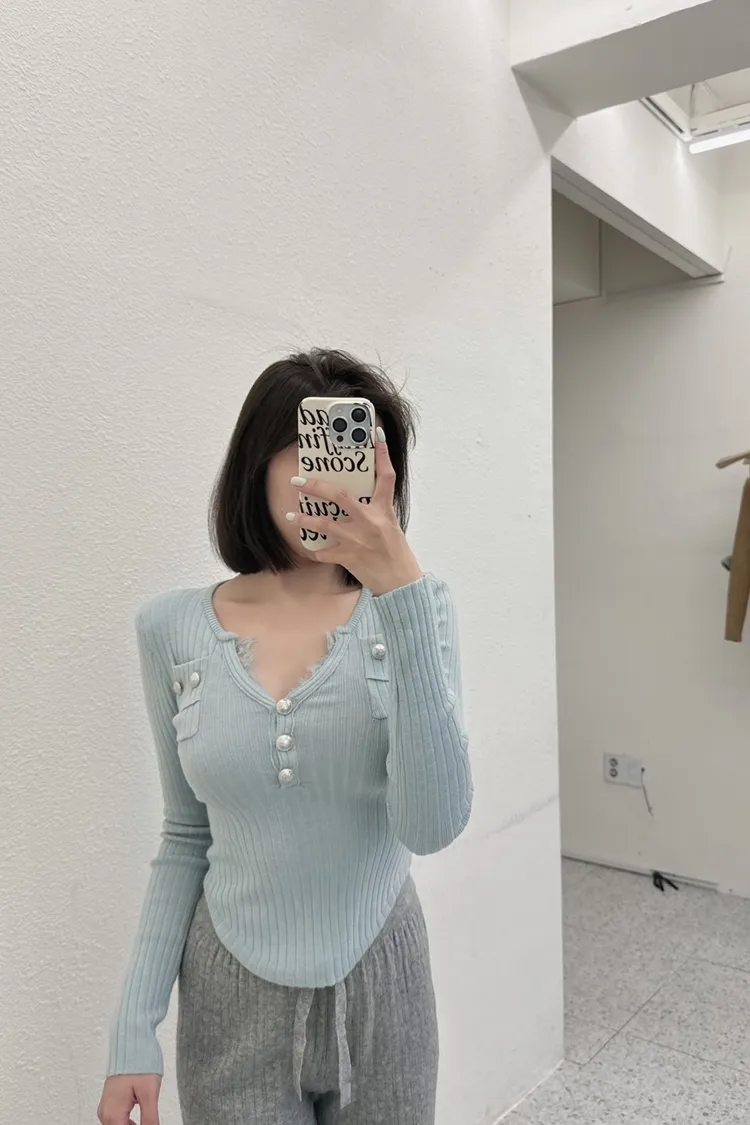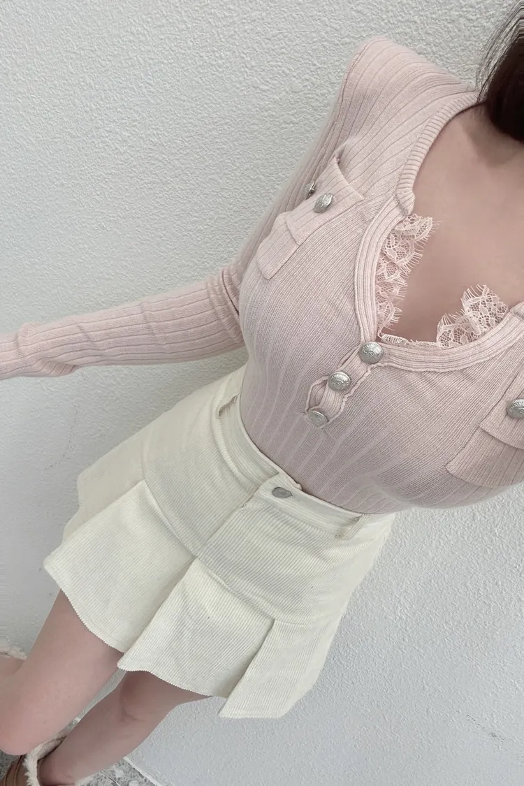 (檔口選品系列)歐膩家坑條羅紋小香風小V蕾絲上衣