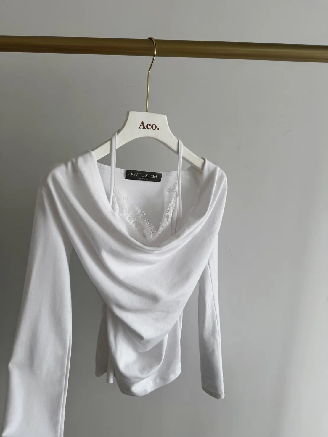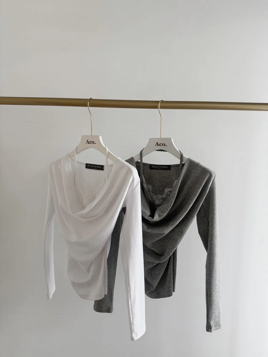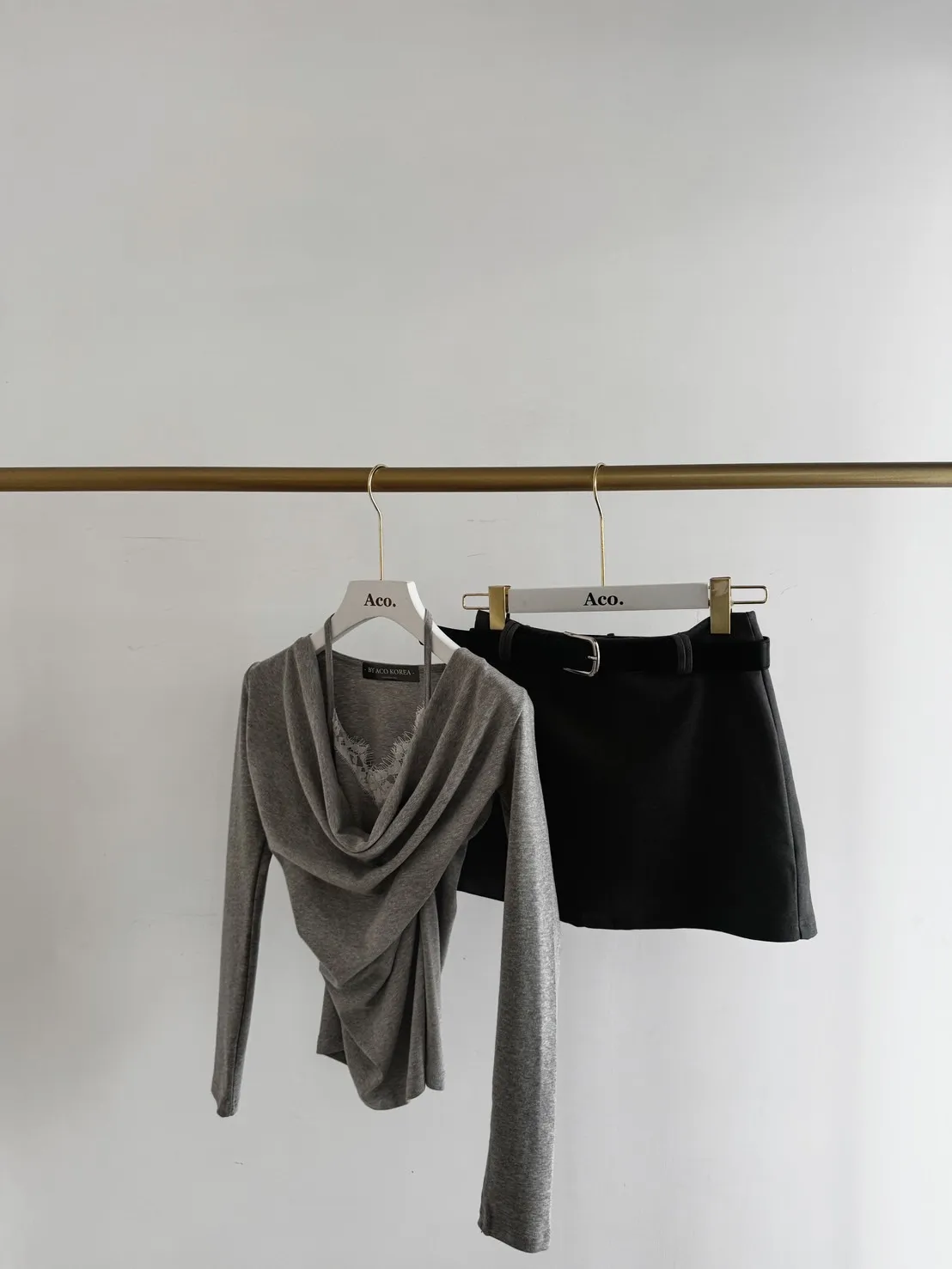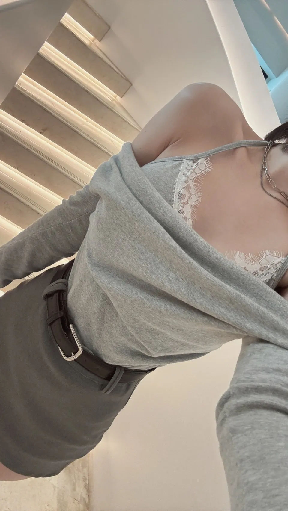 私藏假兩件性感蕾絲繞脖彈力棉質上衣(高級灰現貨)