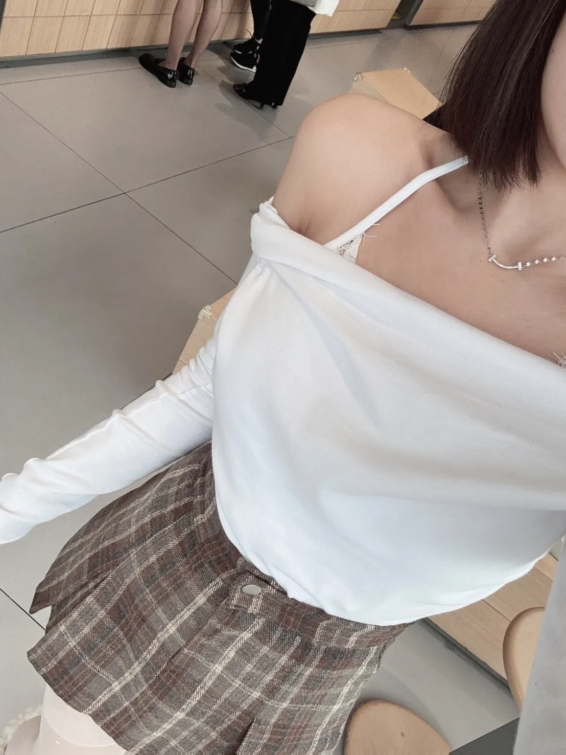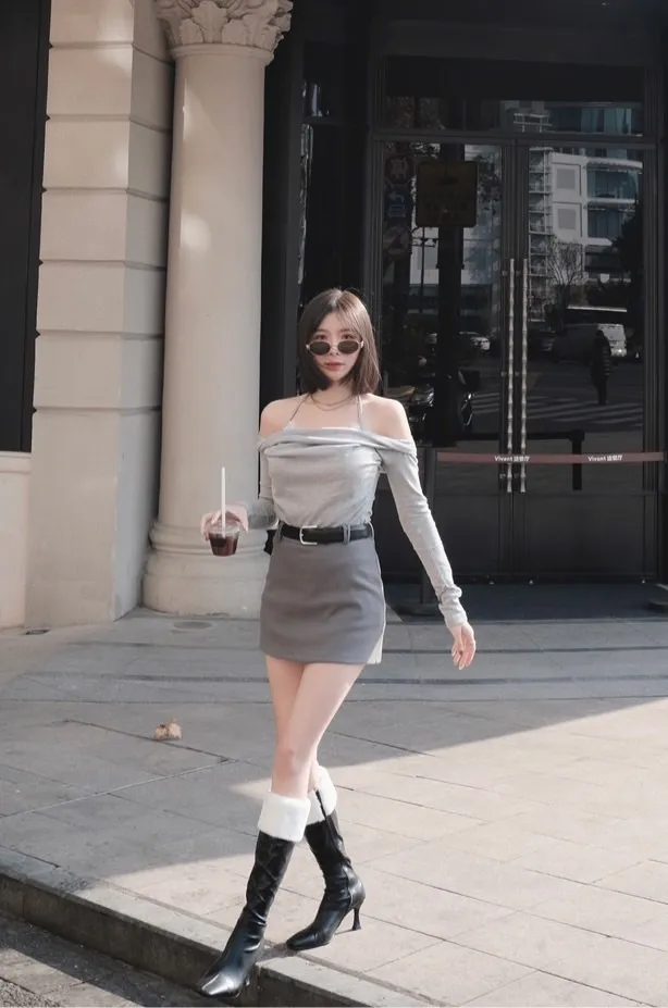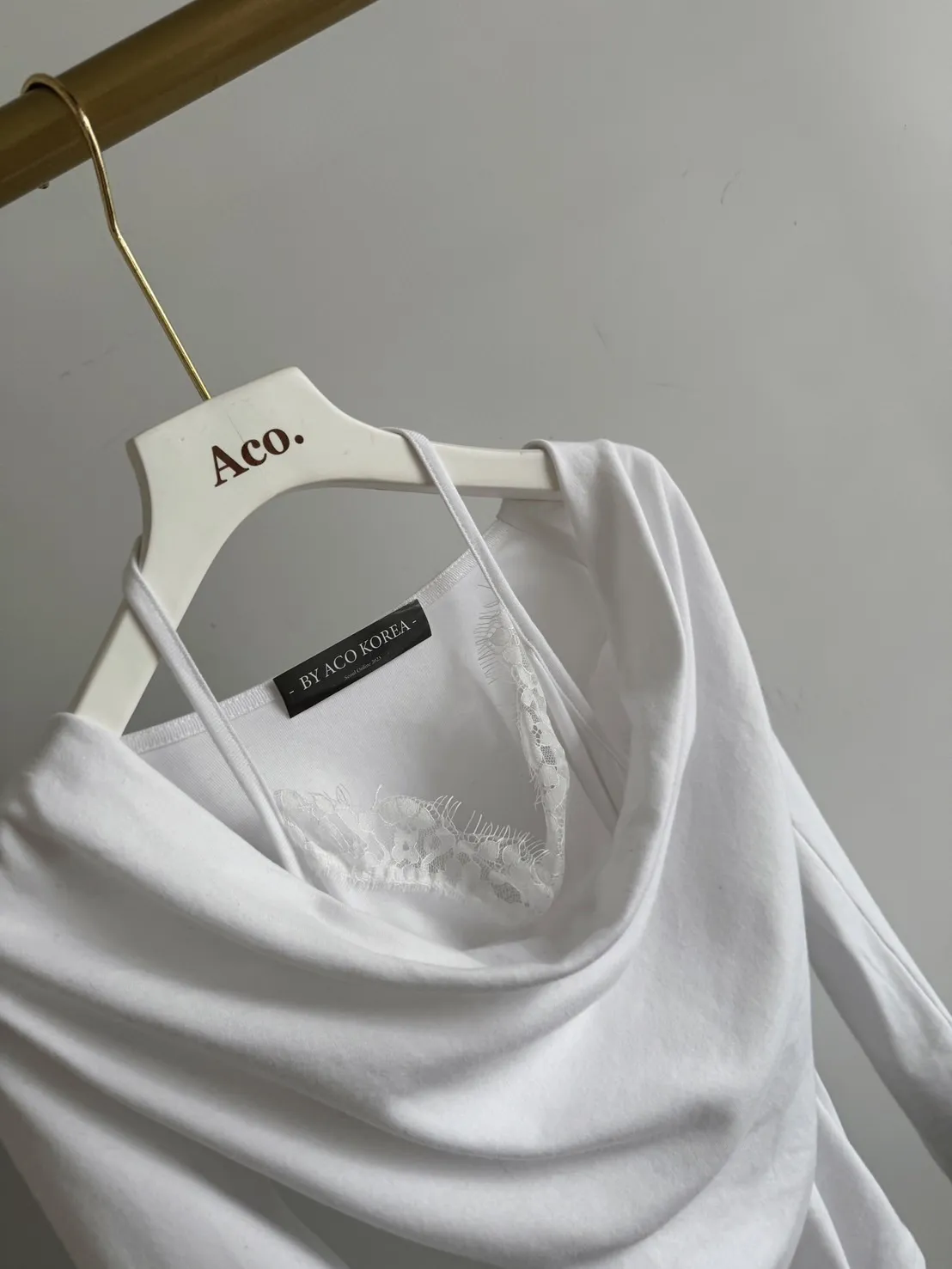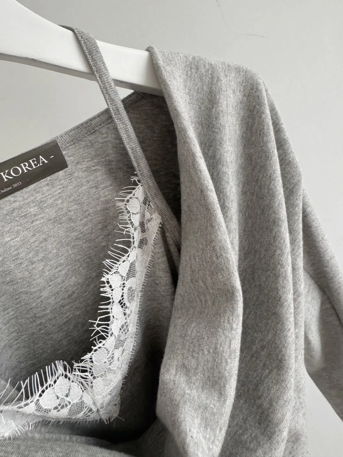 私藏假兩件性感蕾絲繞脖彈力棉質上衣(高級灰現貨)