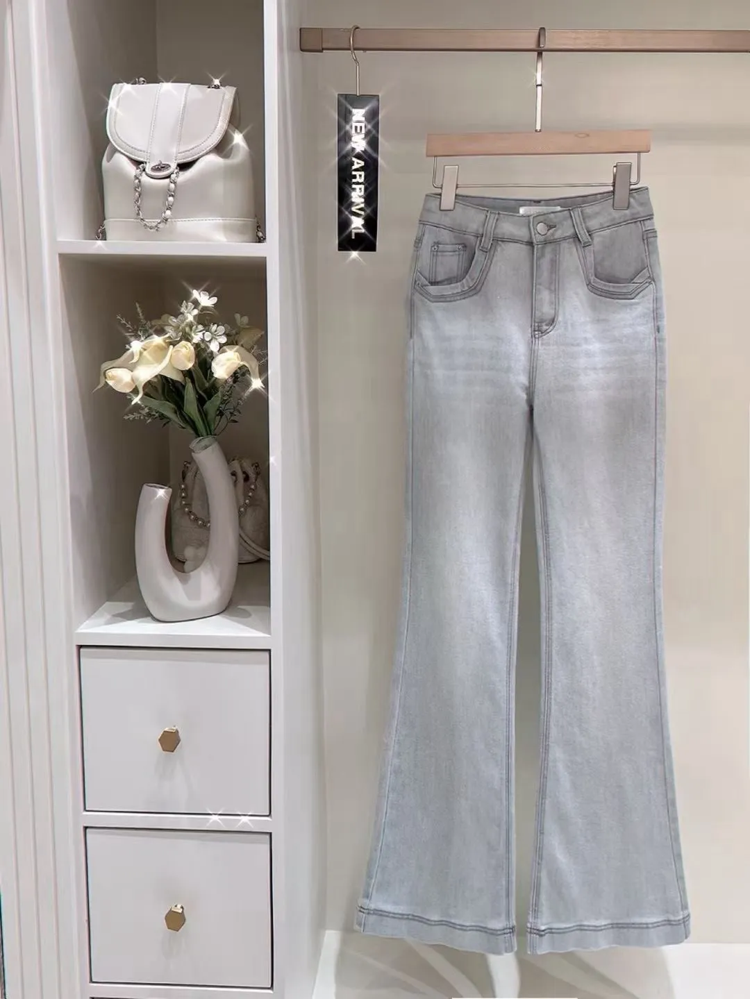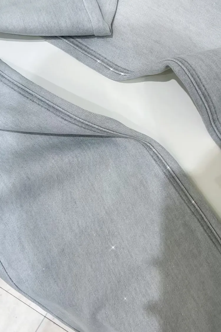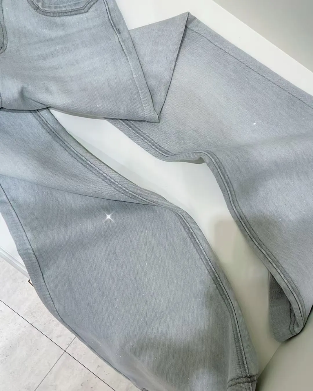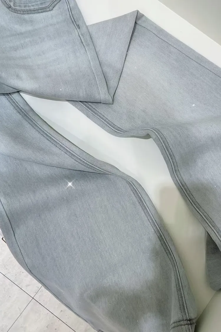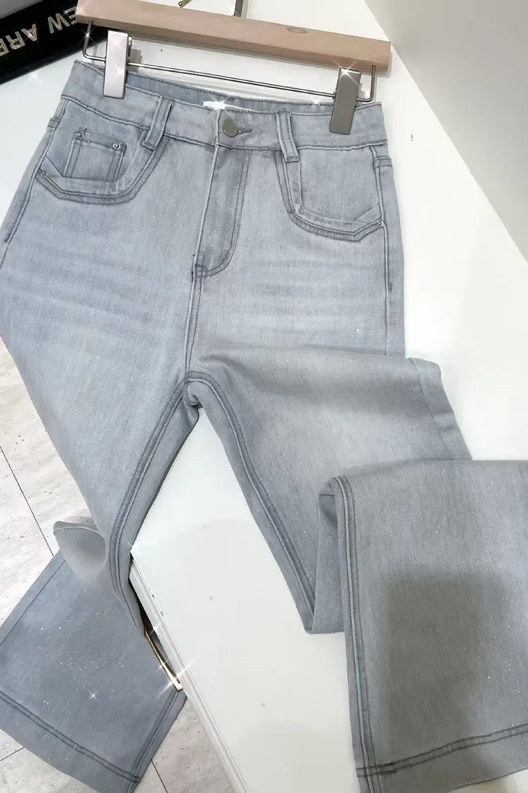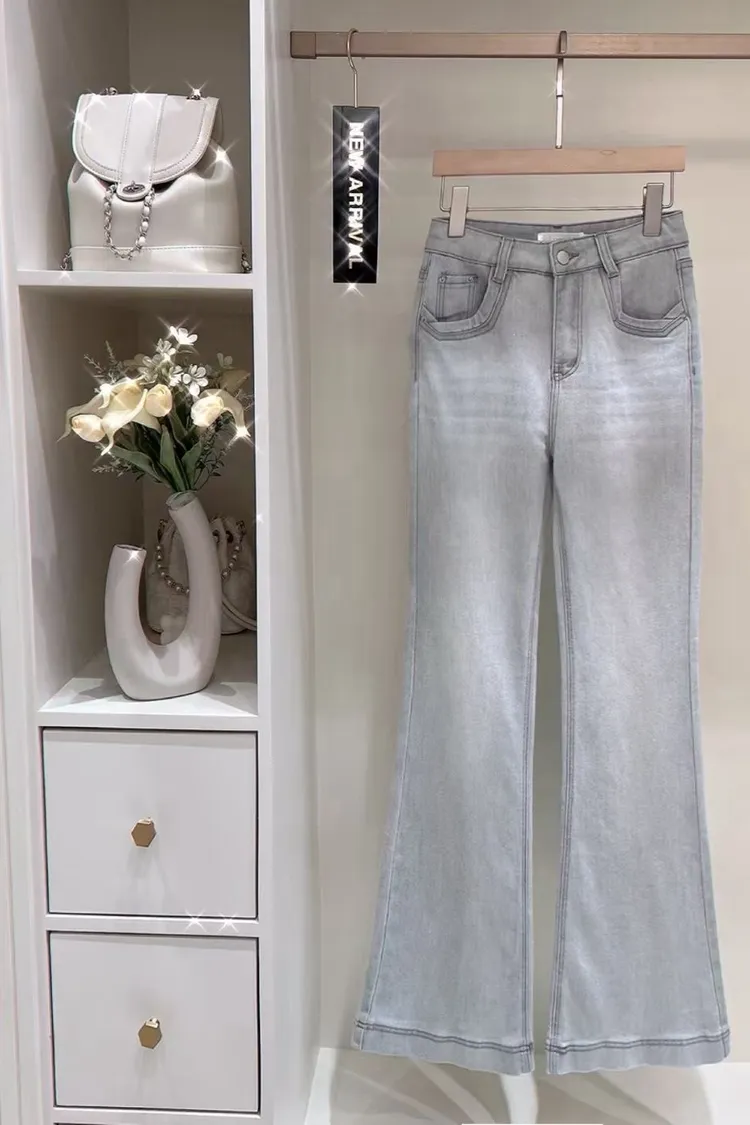 超絕美必買細閃高腰彈力淺藍喇叭褲