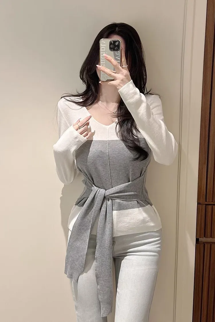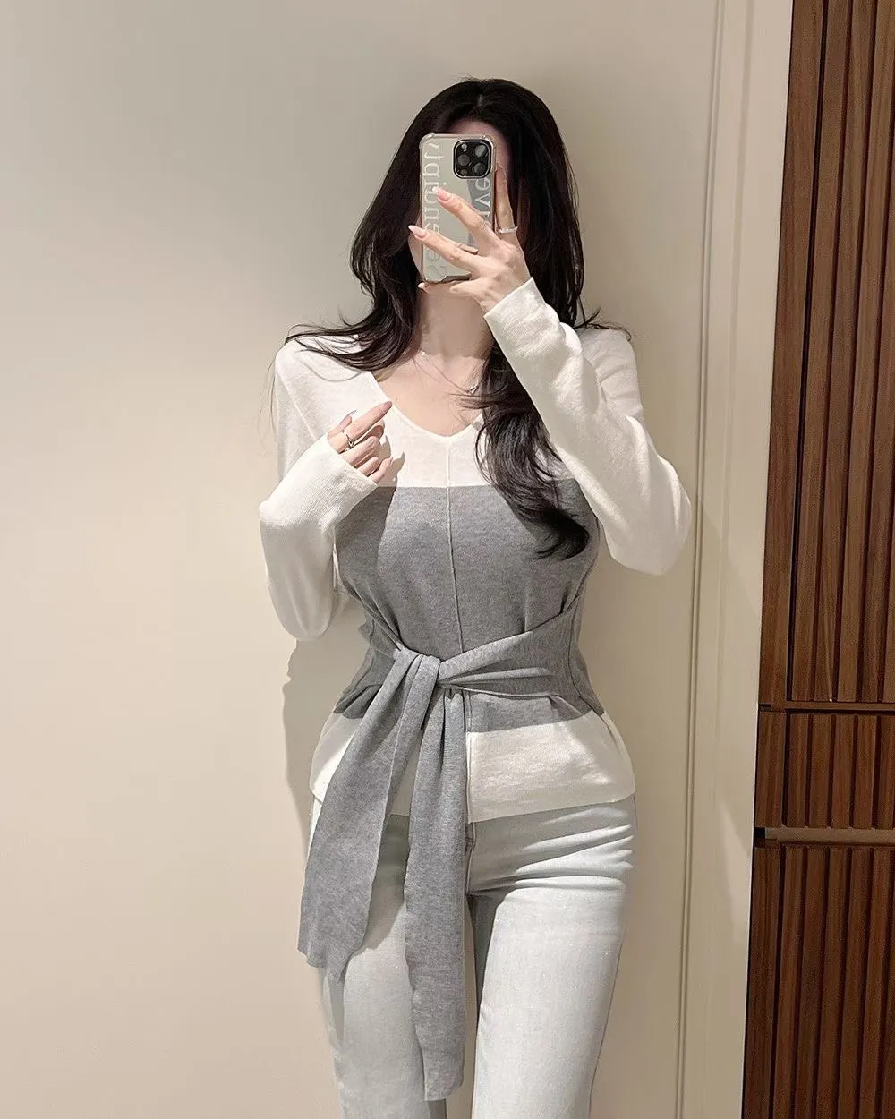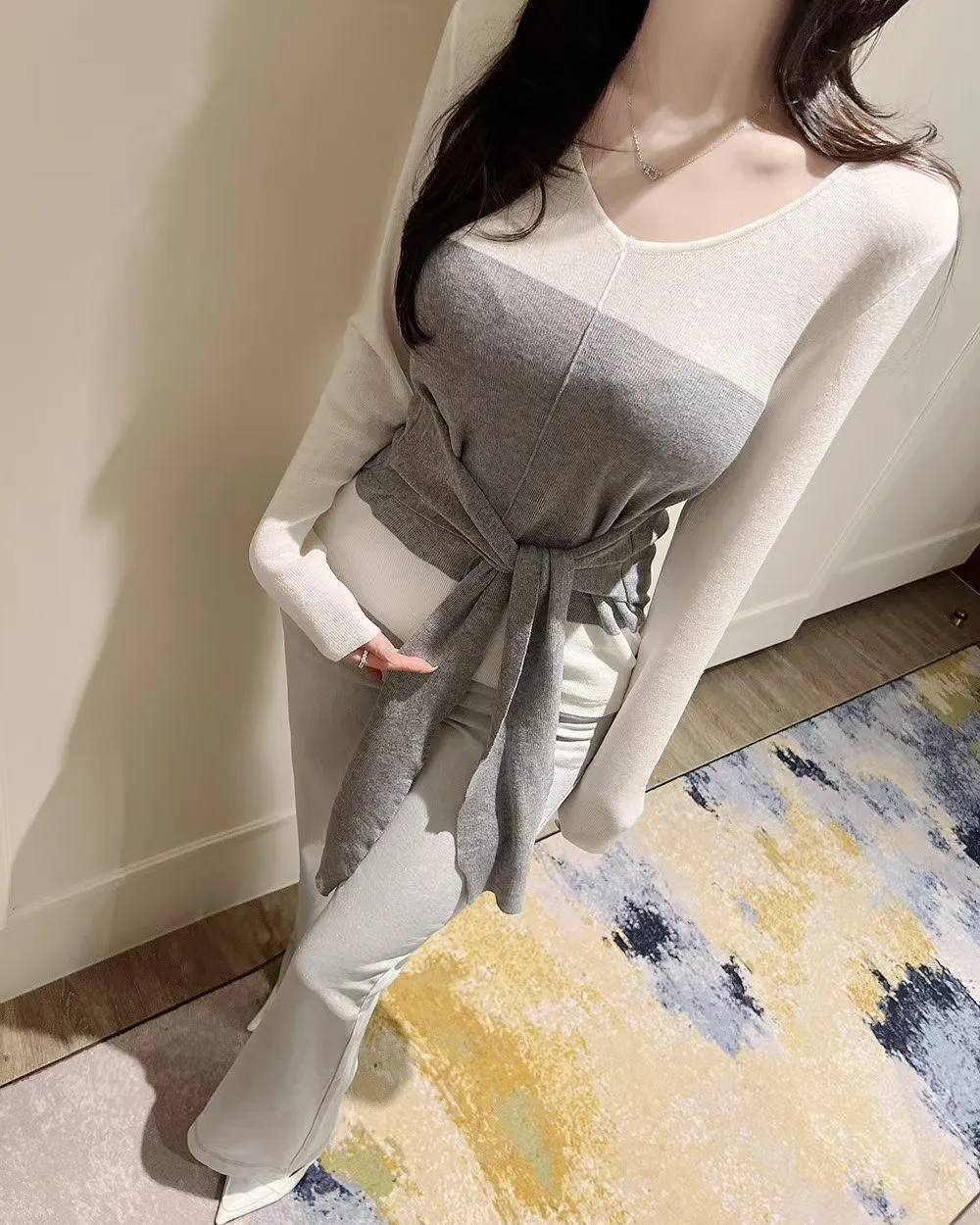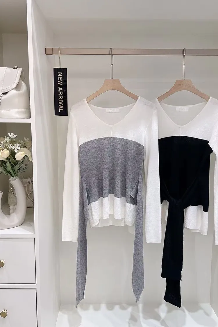 溫柔歐膩家薄款針織拼色綁帶上衣