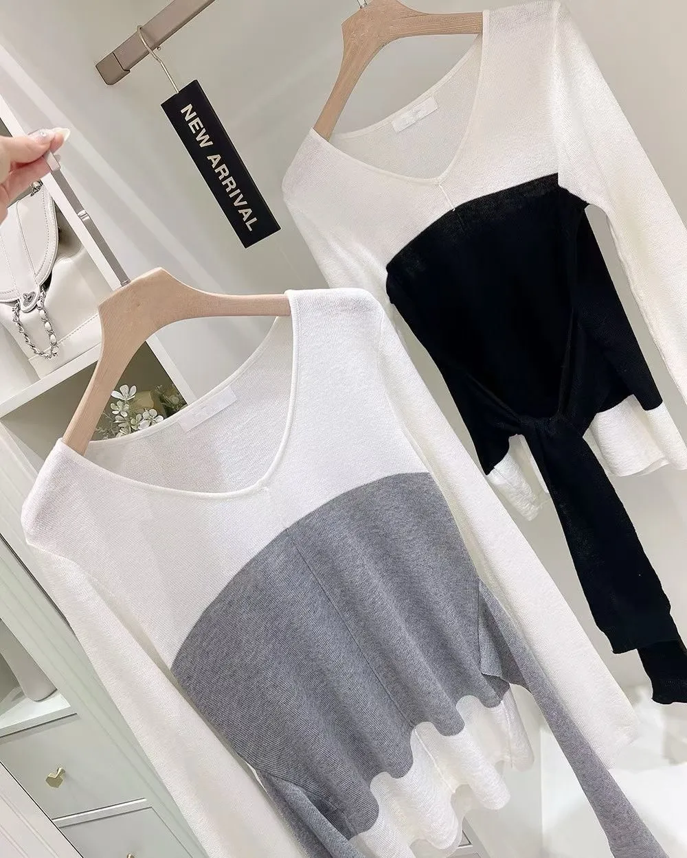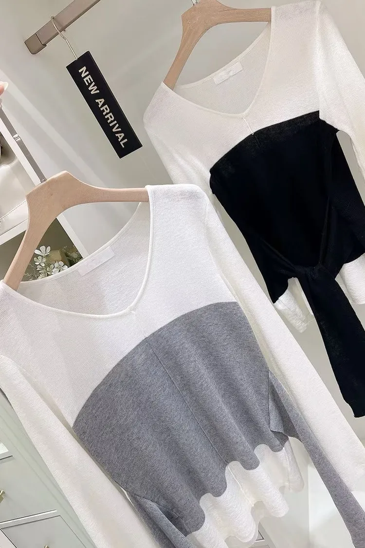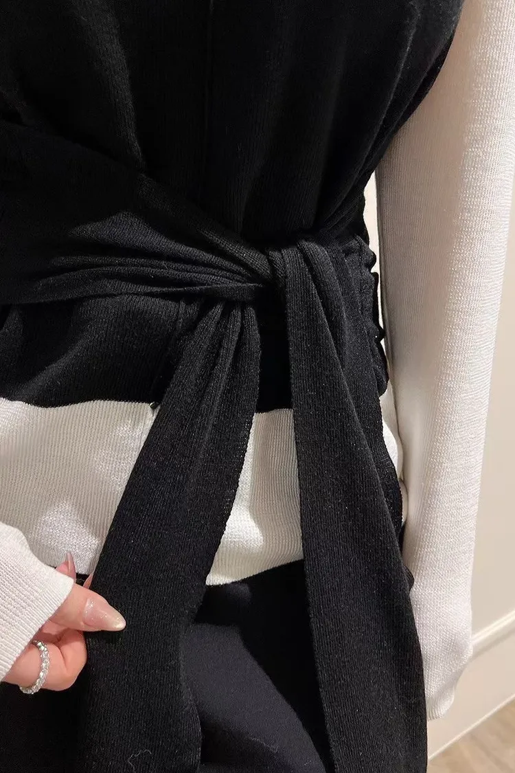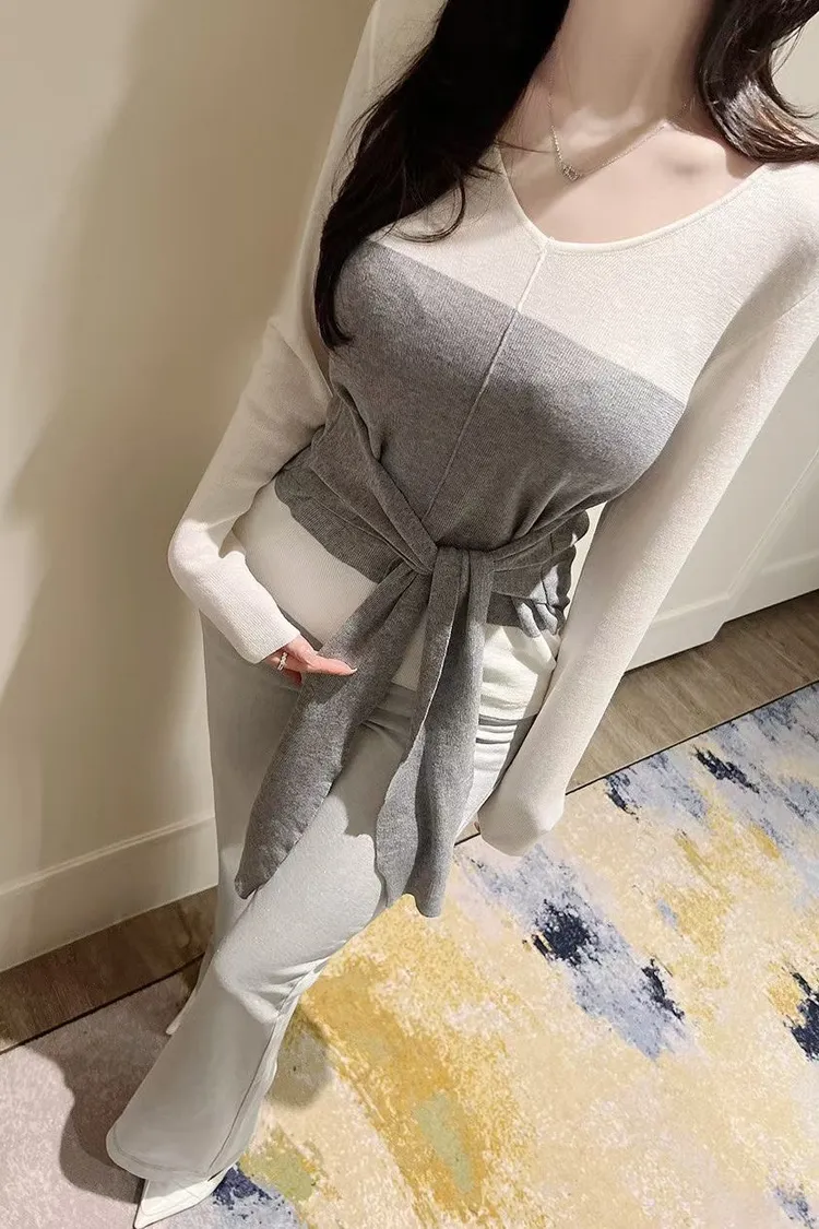 溫柔歐膩家薄款針織拼色綁帶上衣