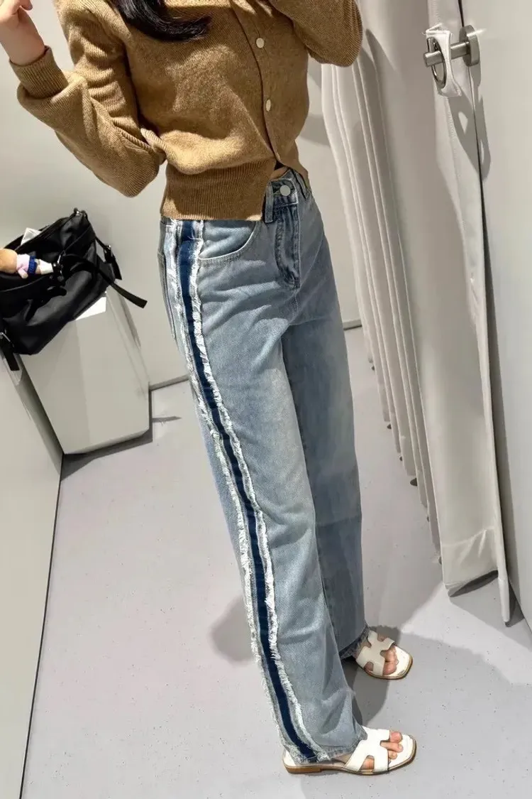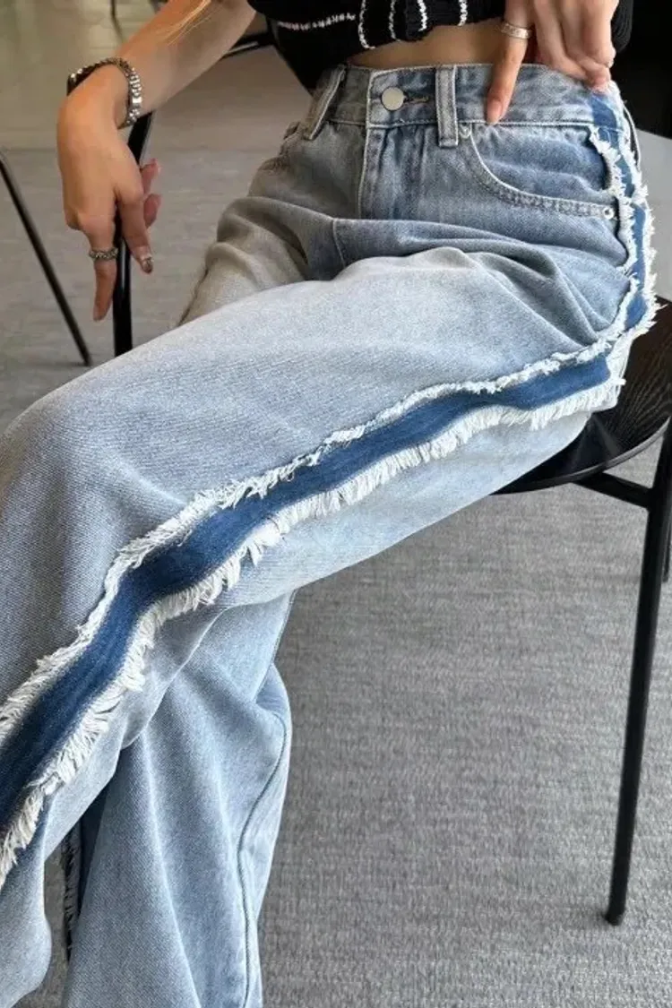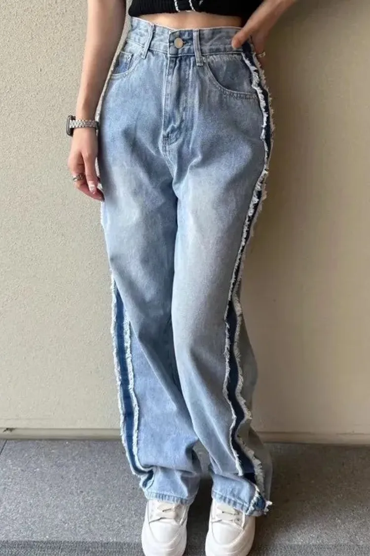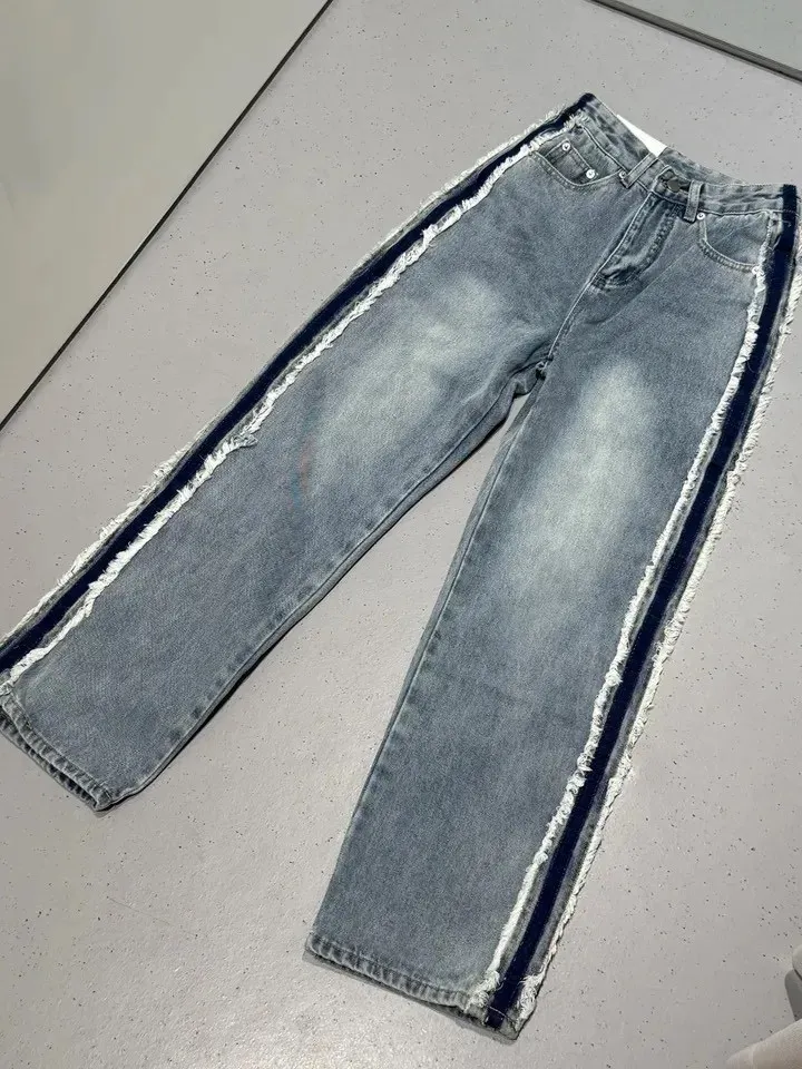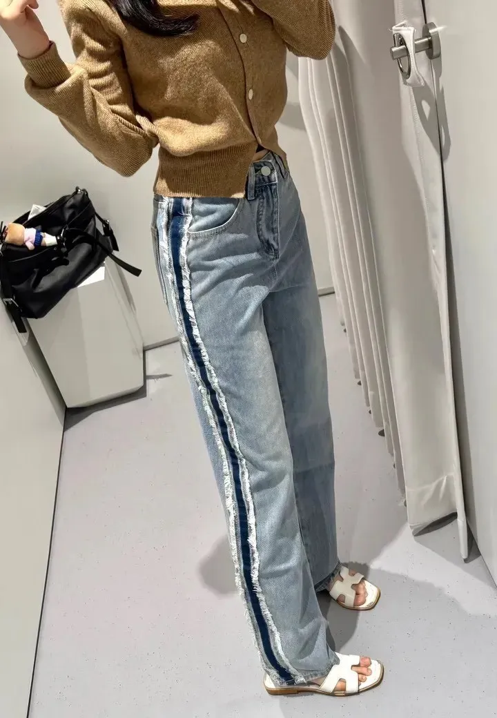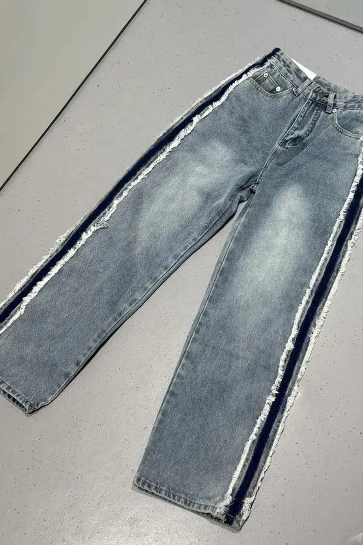 絕美側邊滾毛邊復古刷色牛仔直筒寬褲