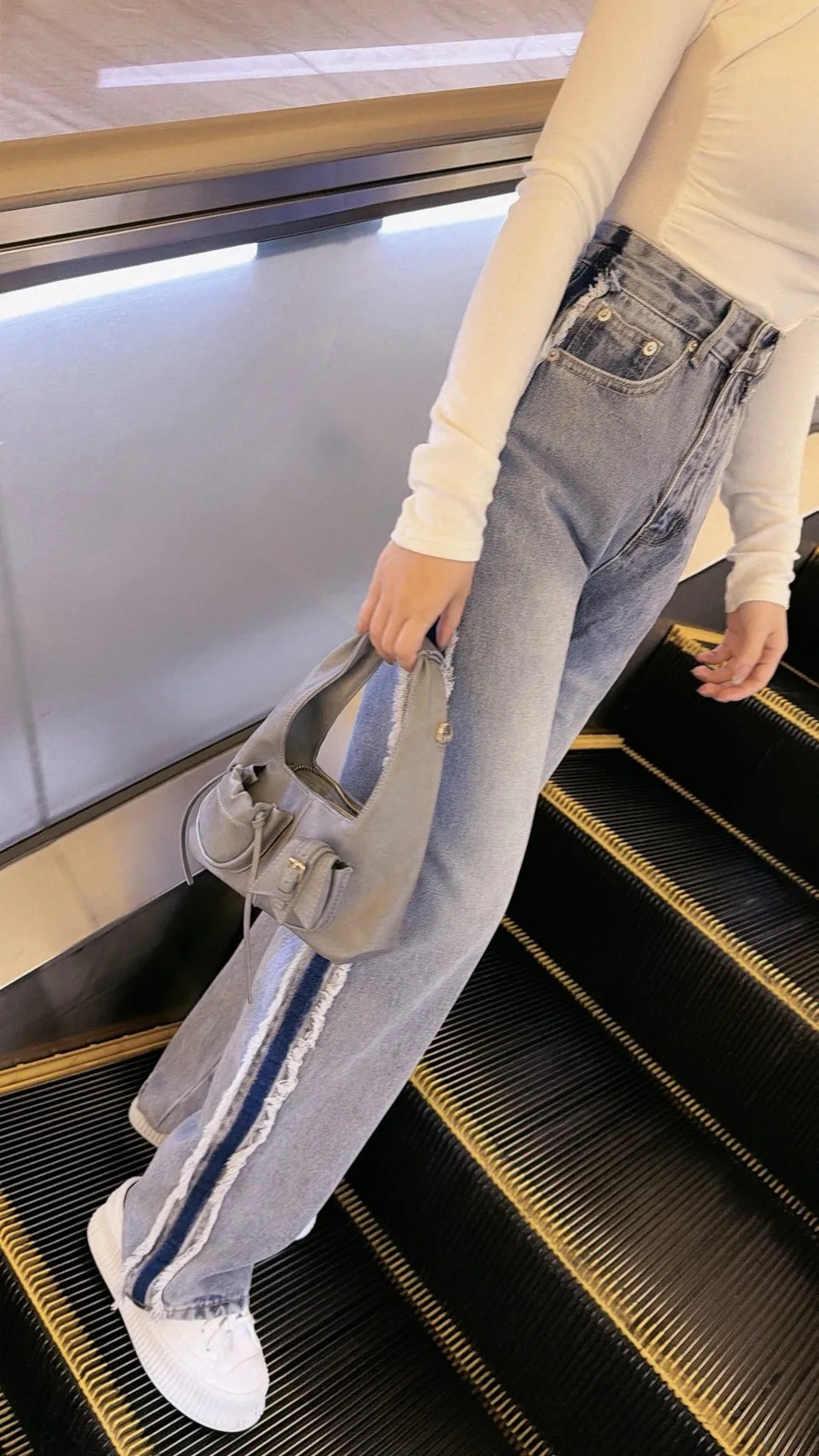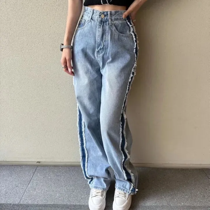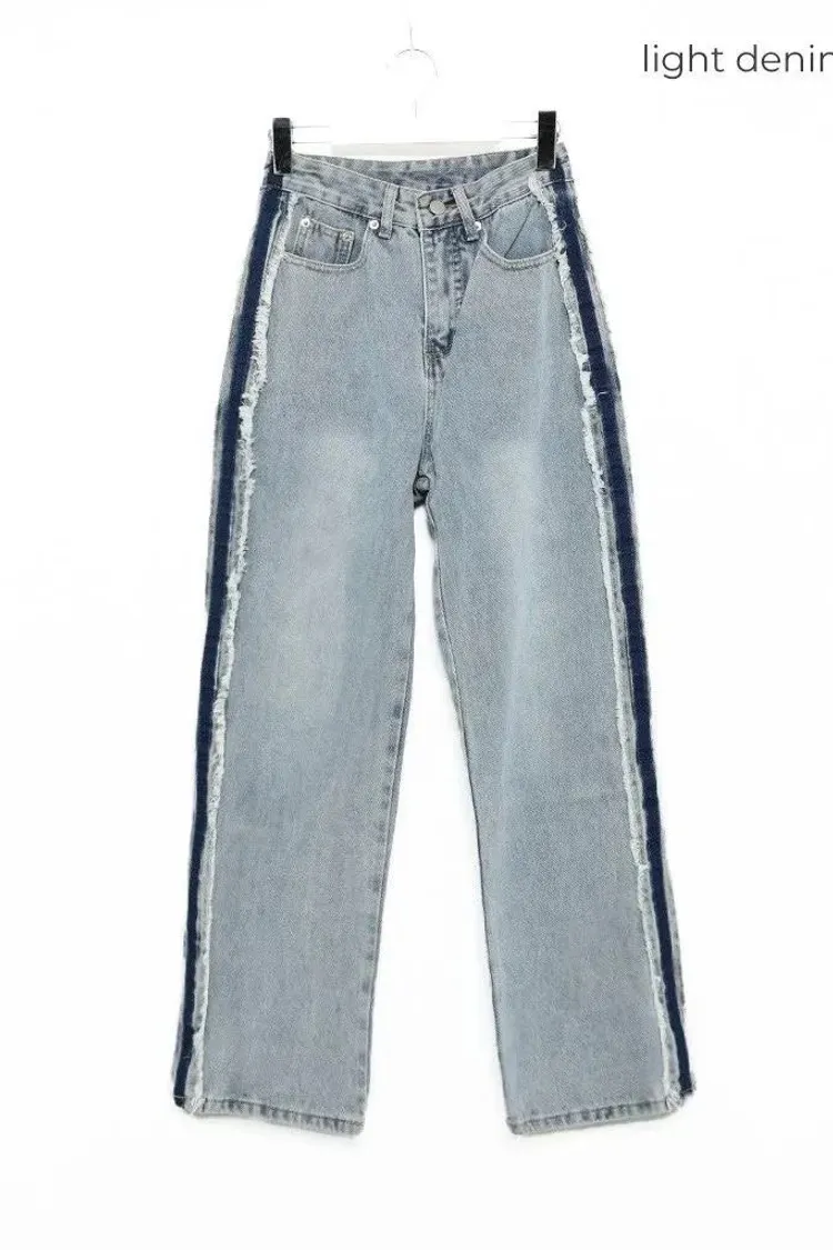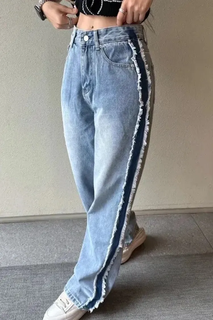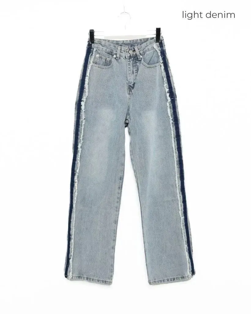 絕美側邊滾毛邊復古刷色牛仔直筒寬褲
