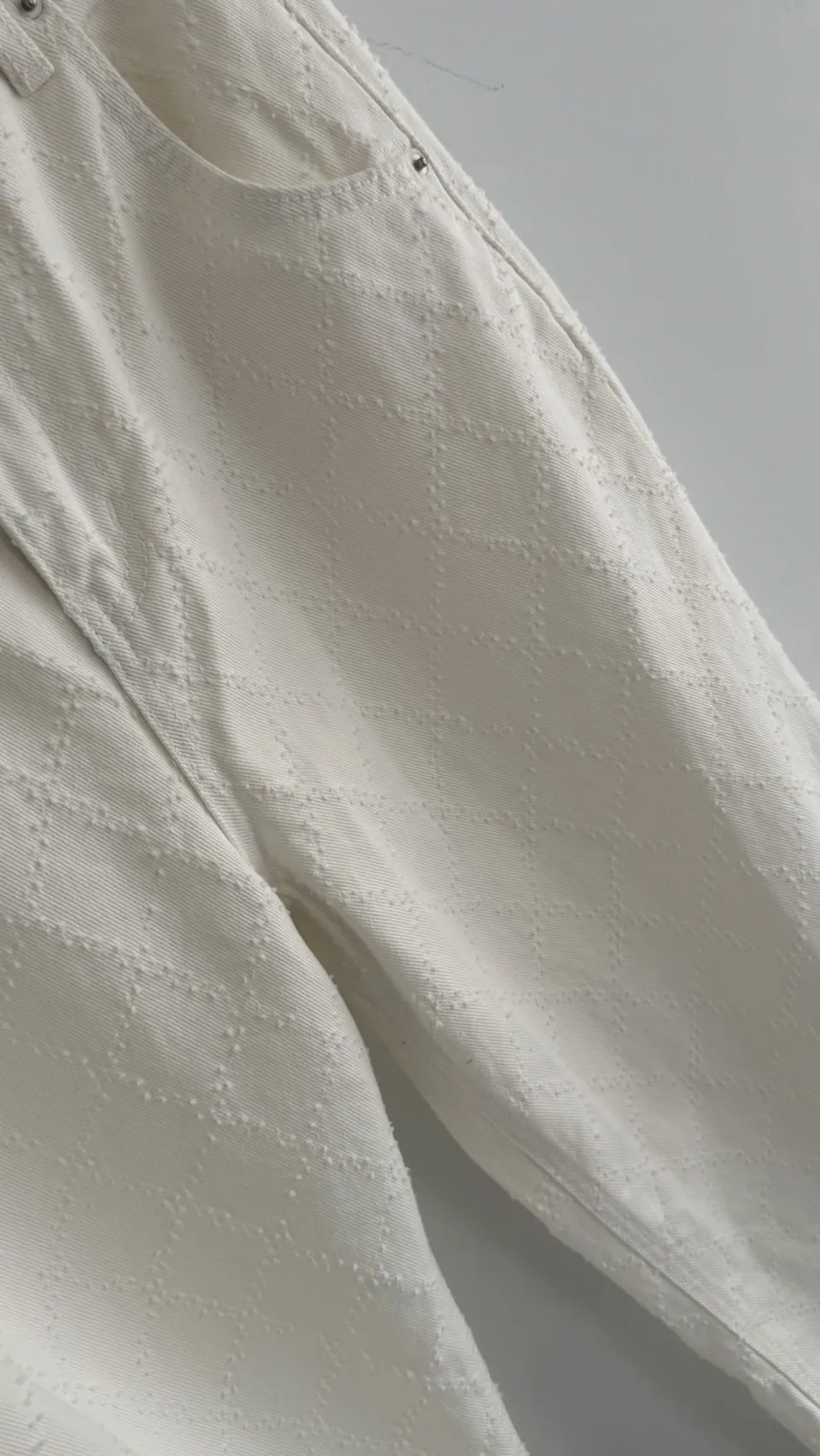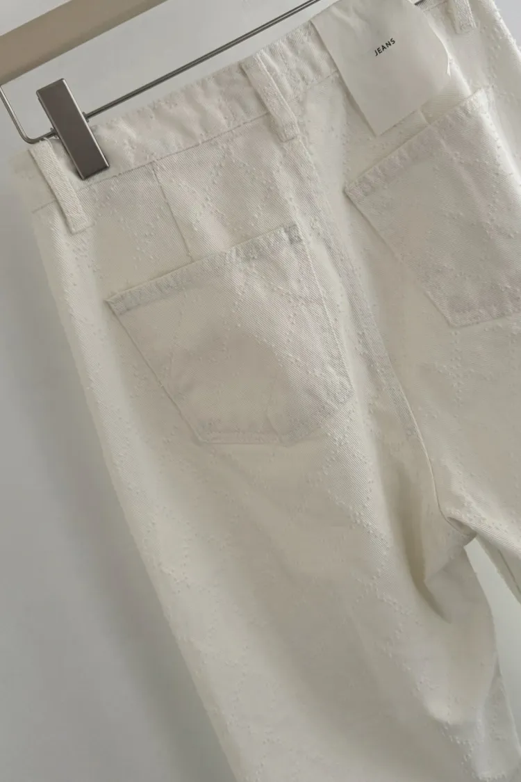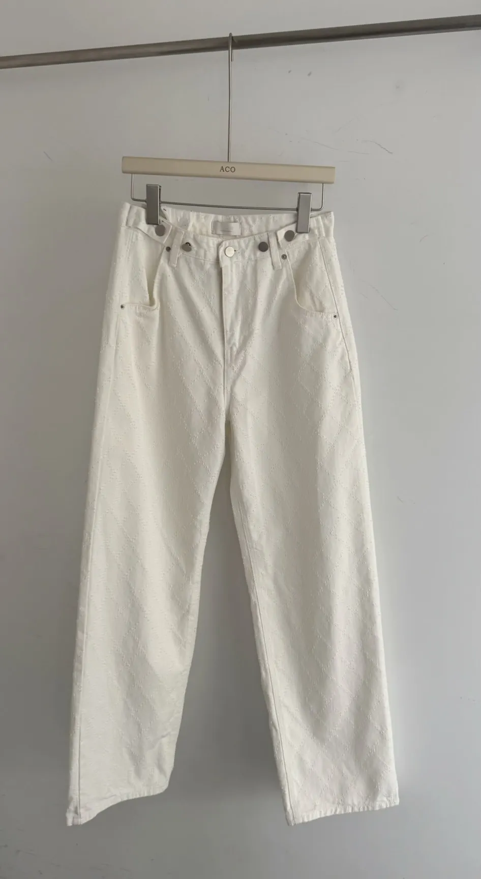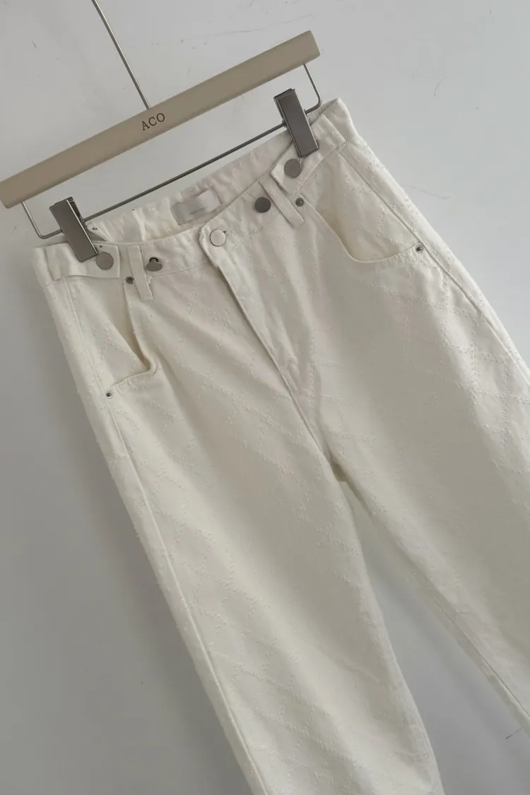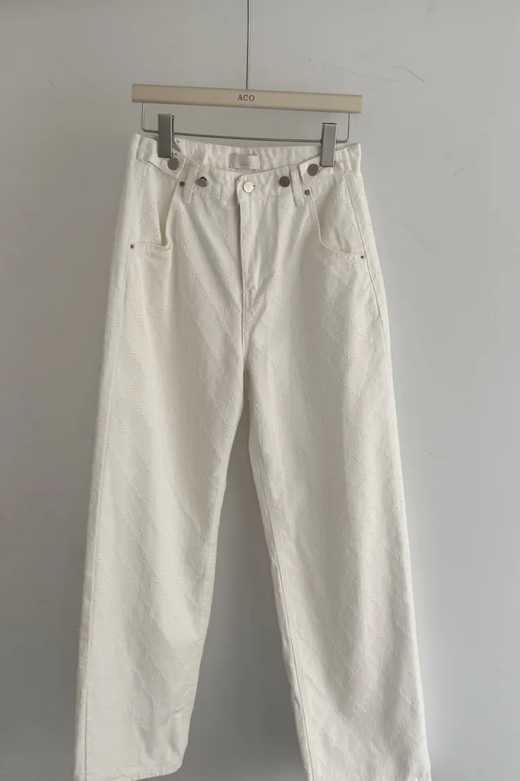 必買私藏菱格紋腰釦設計白色牛仔寬褲