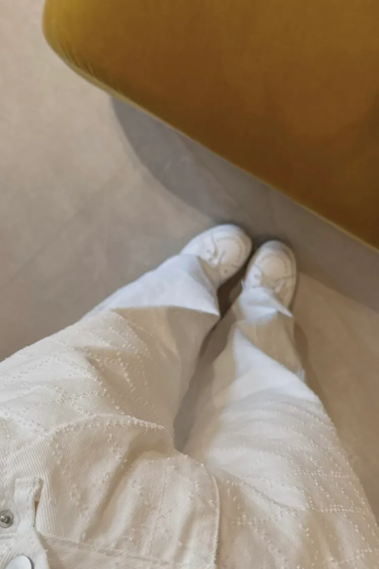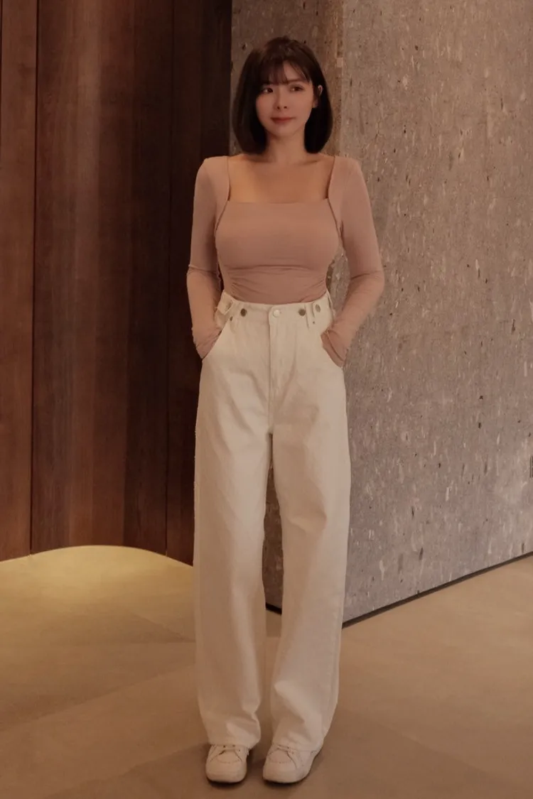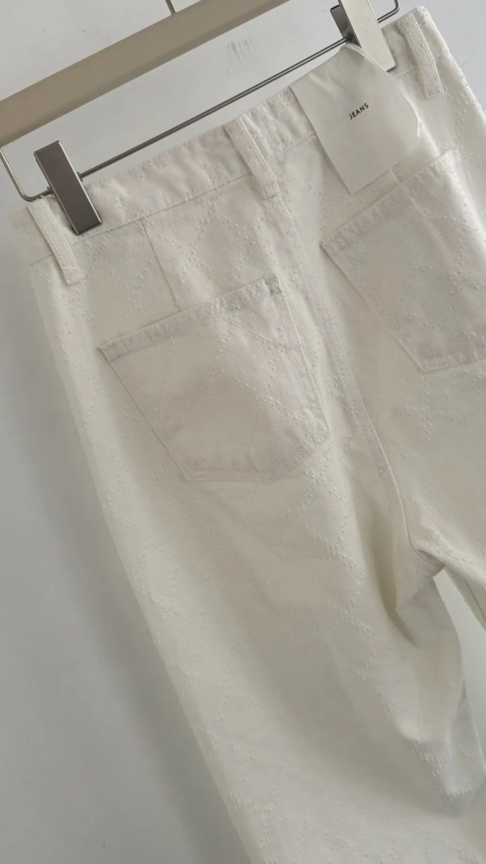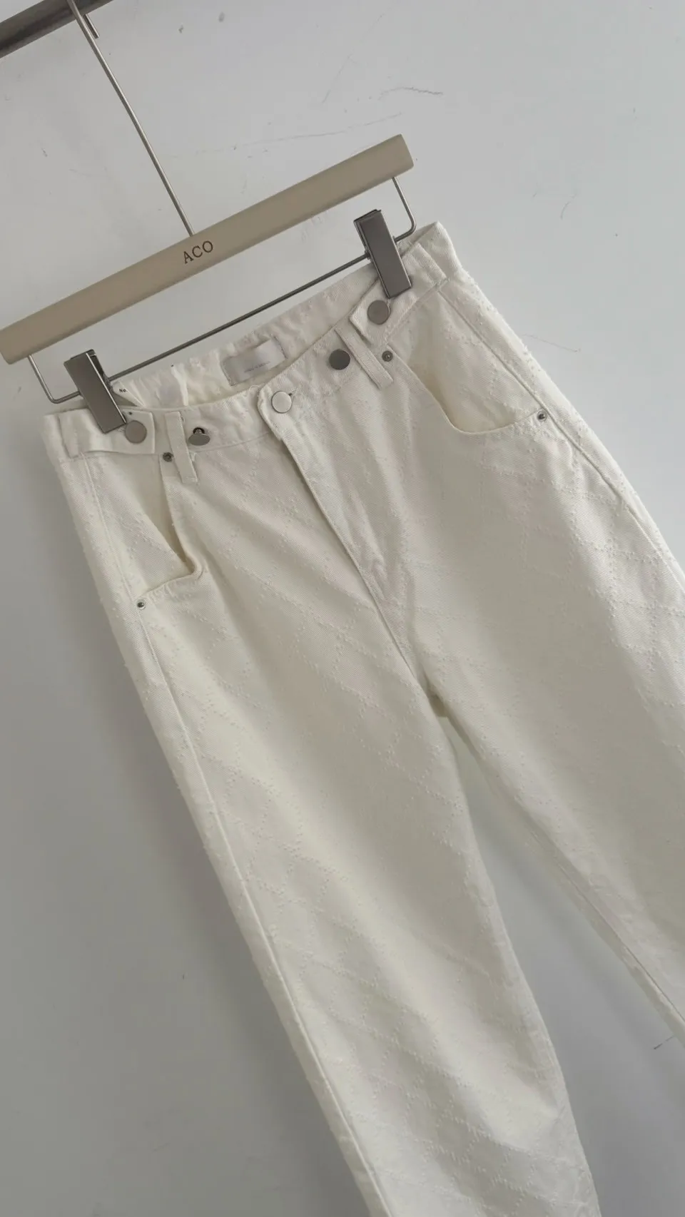 必買私藏菱格紋腰釦設計白色牛仔寬褲