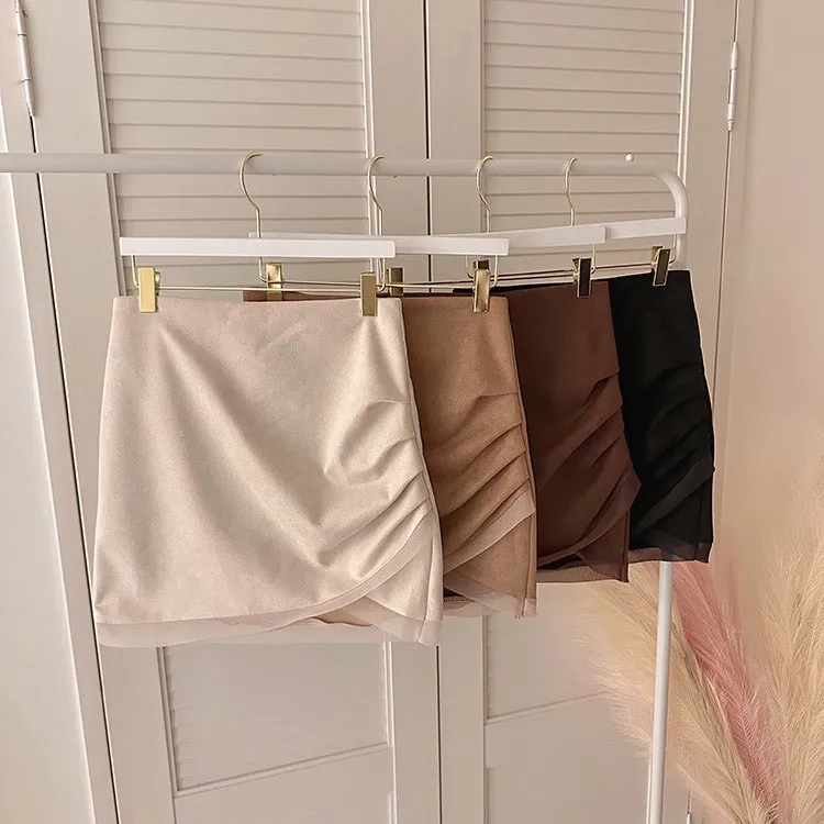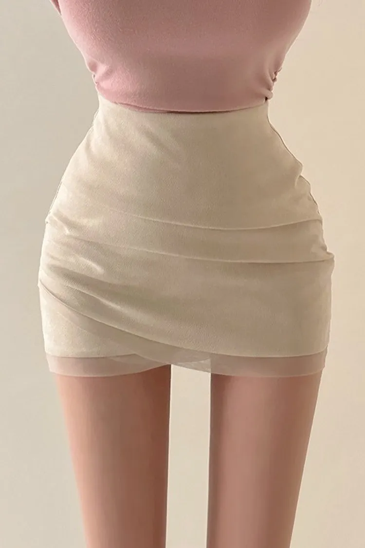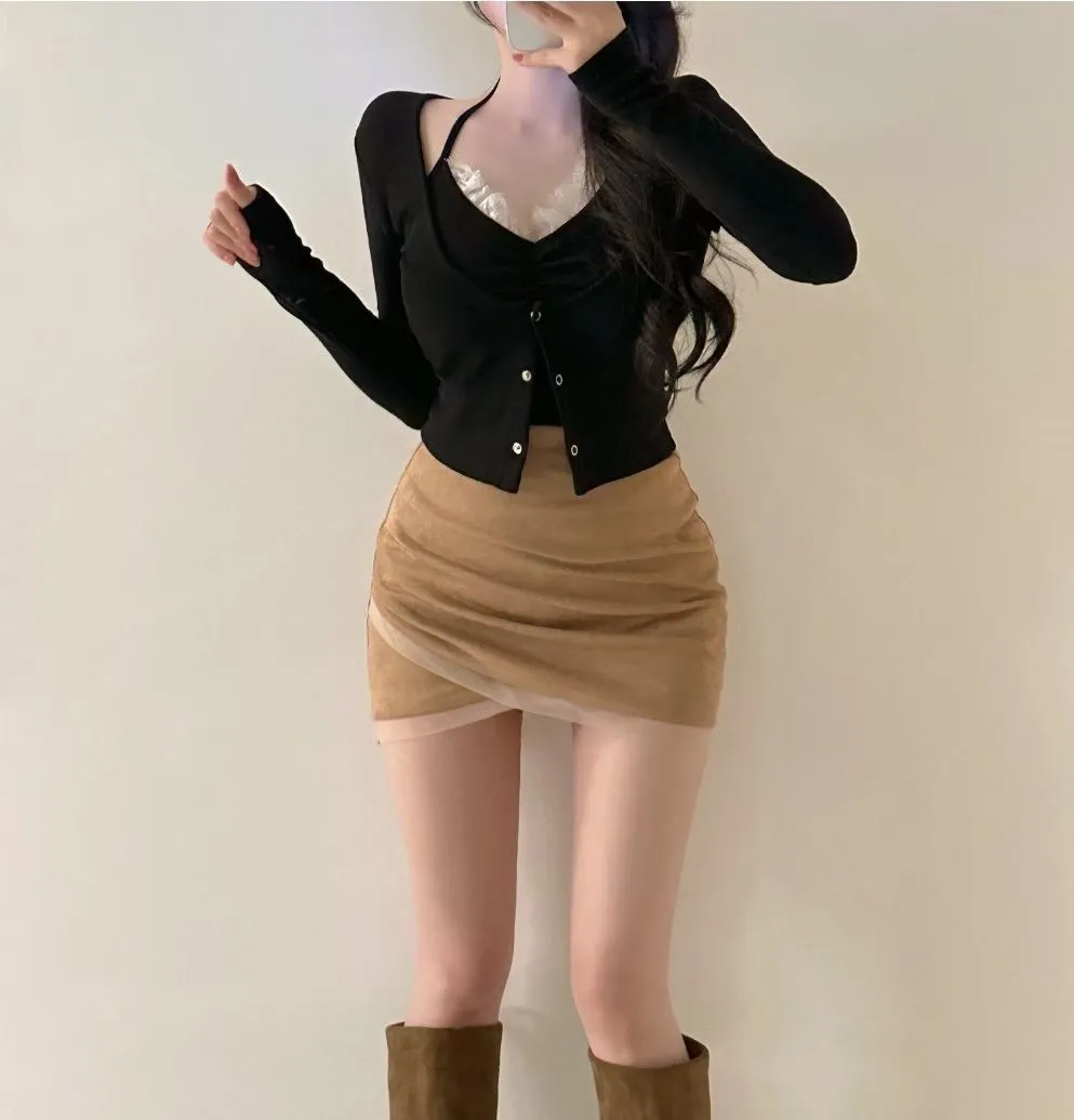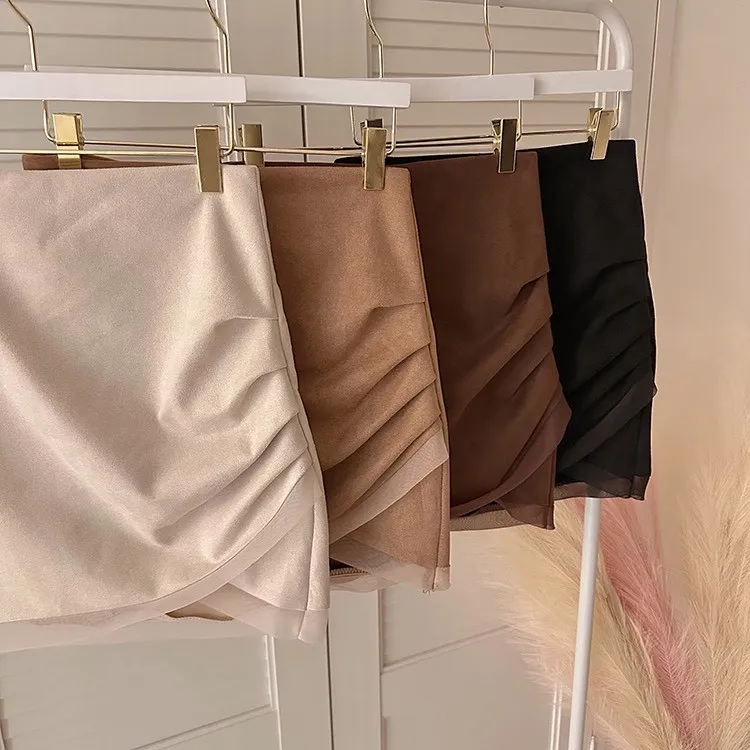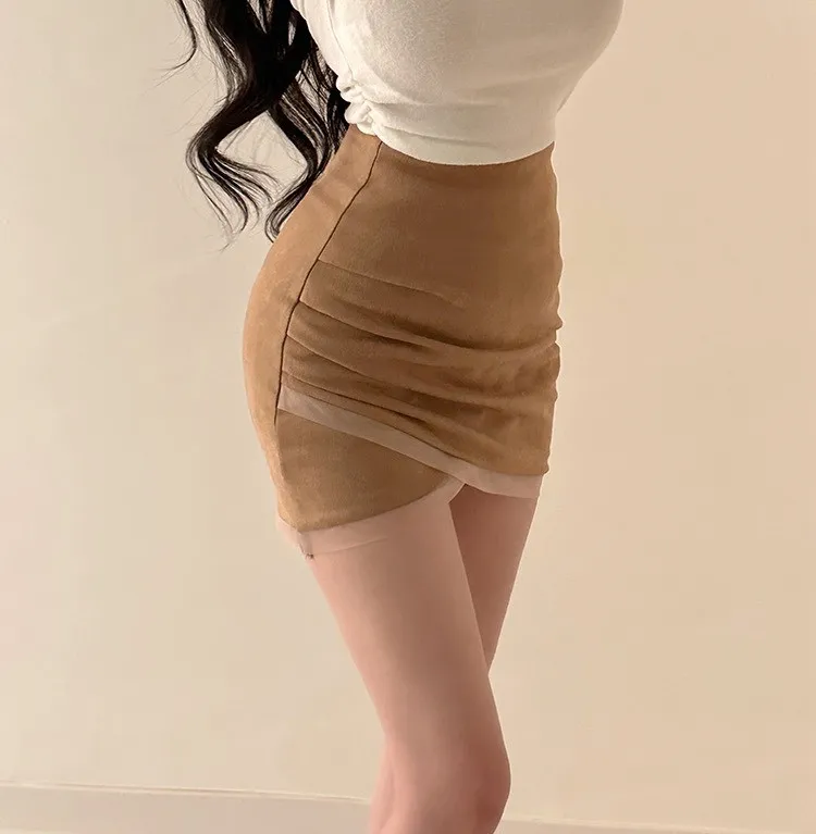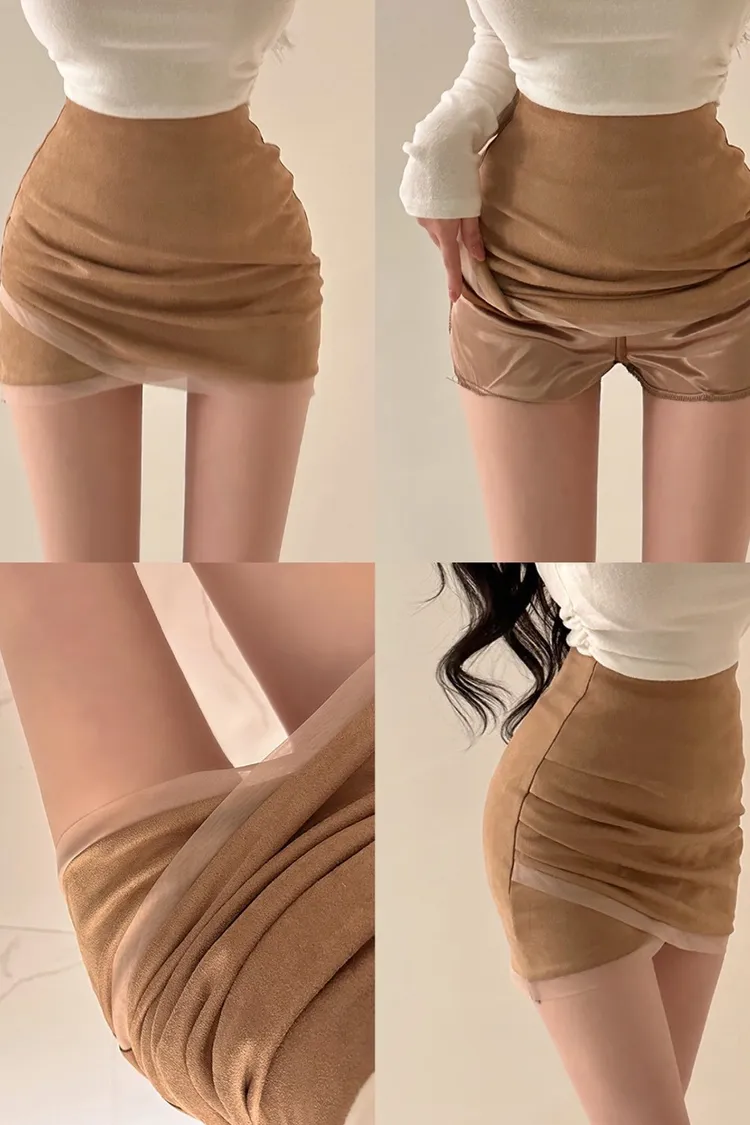 私藏秋冬訂製麂皮拼接網紗包臀裙