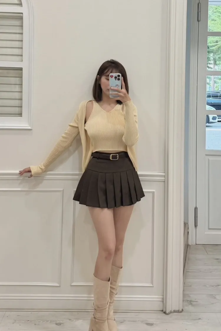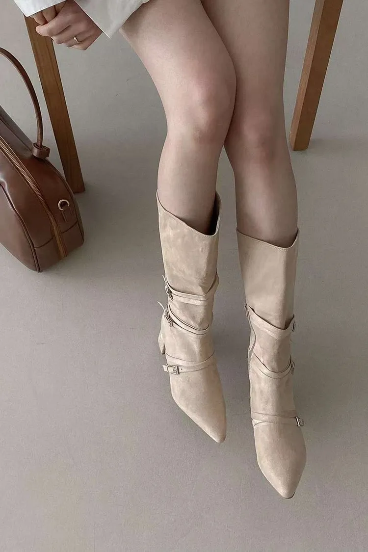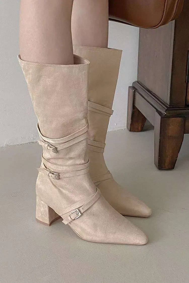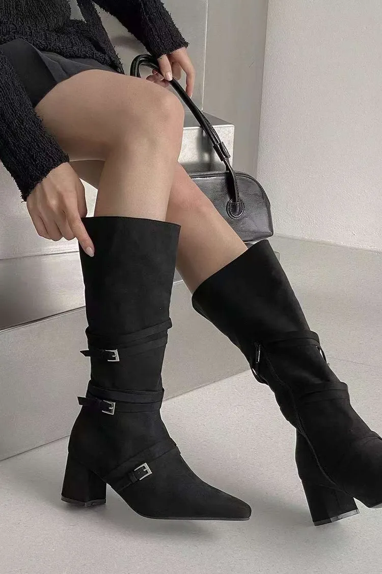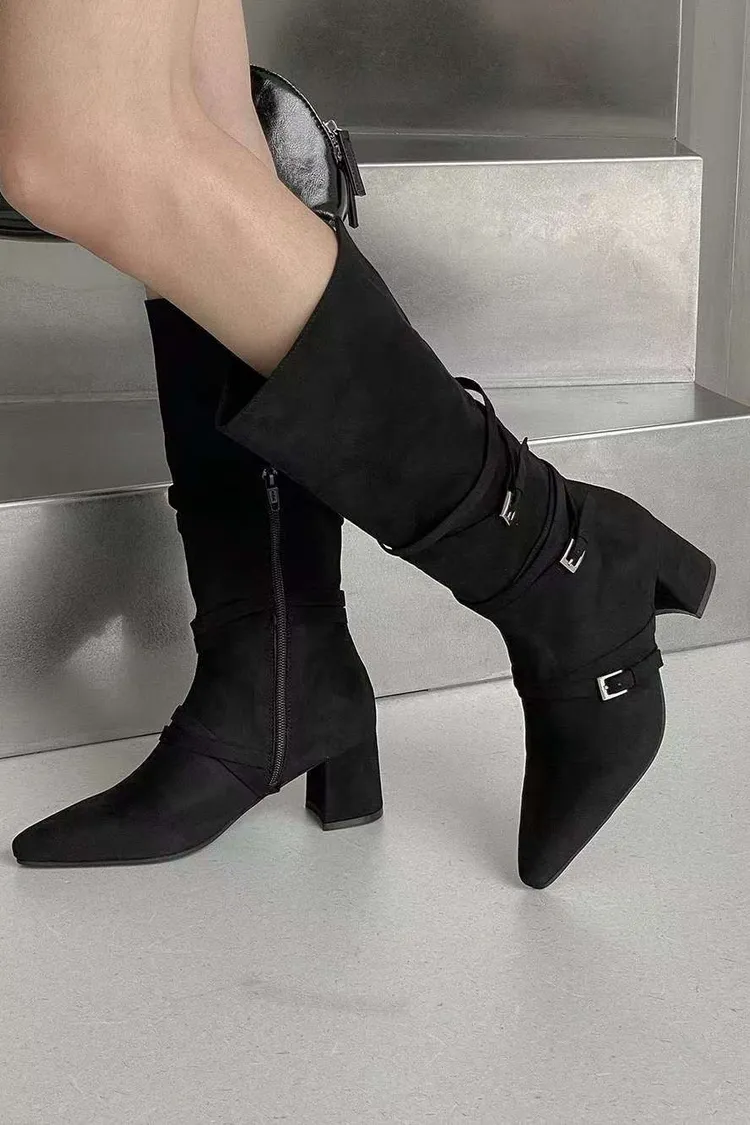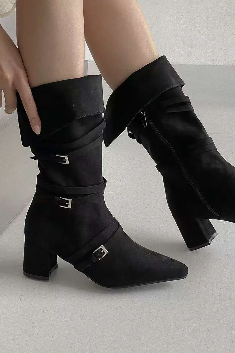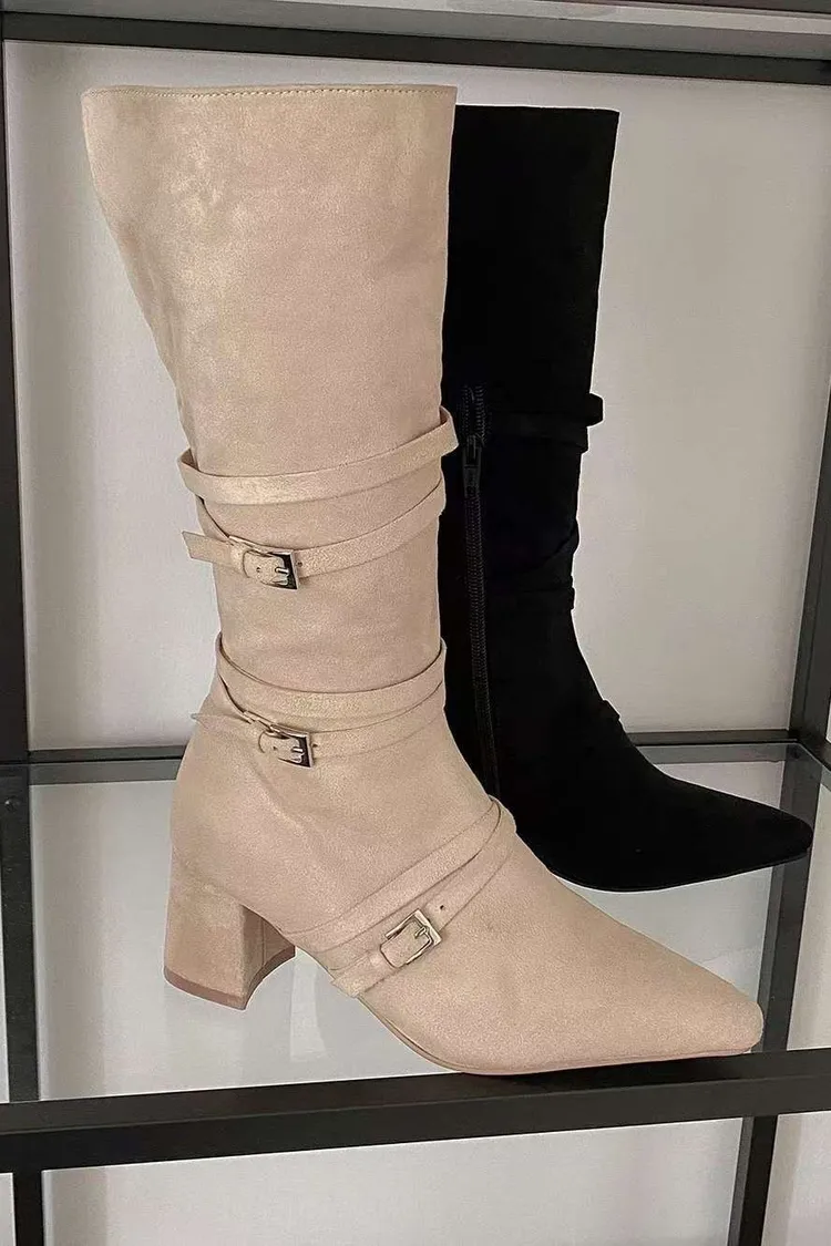 溫柔私藏麂皮拼接皮帶中長款短跟靴