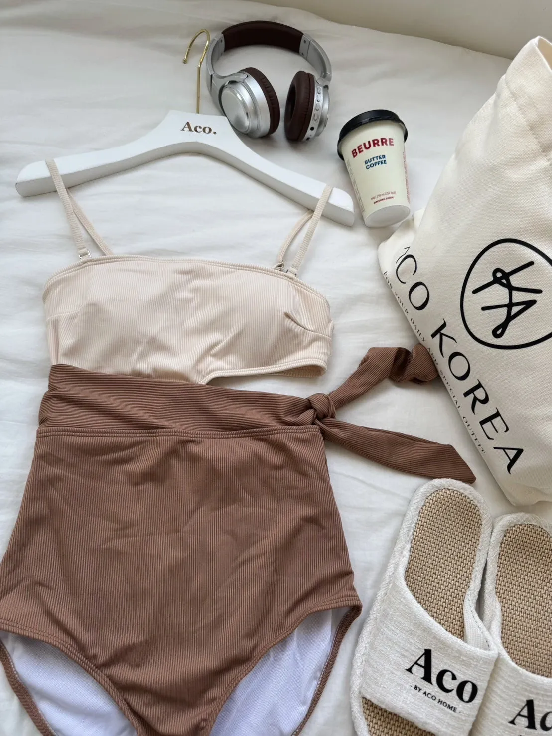 私藏拿鐵奶杏拼色鏤空綁帶兩穿連身泳衣