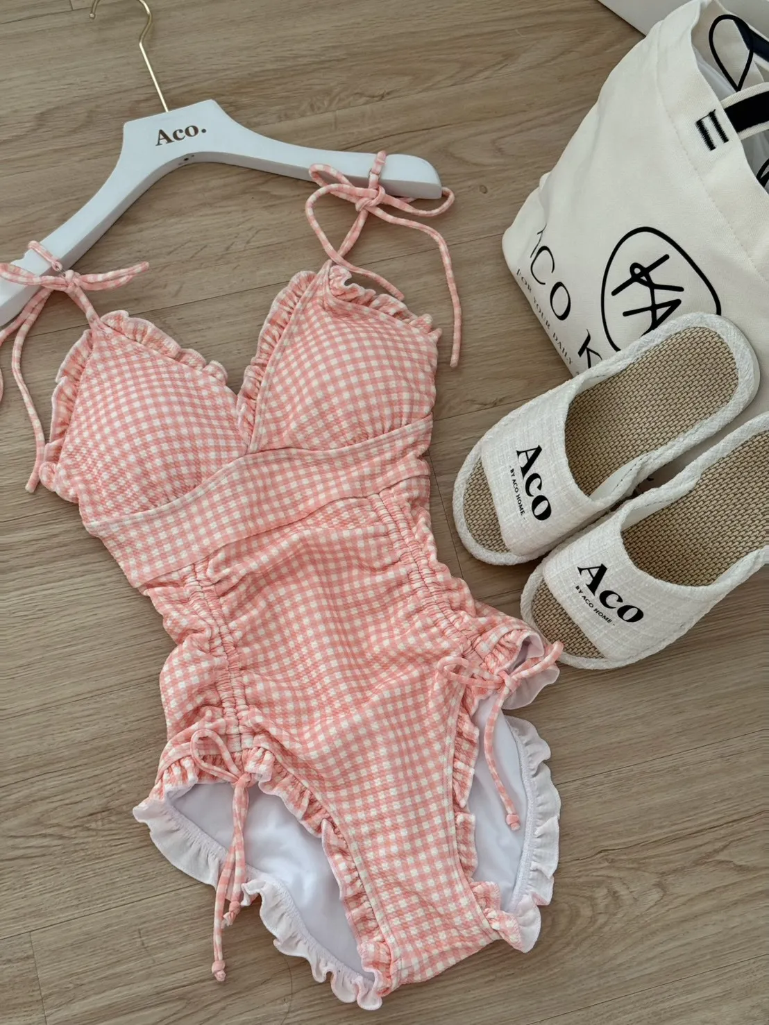 歐膩款粉色格紋V領抽繩連身泳衣