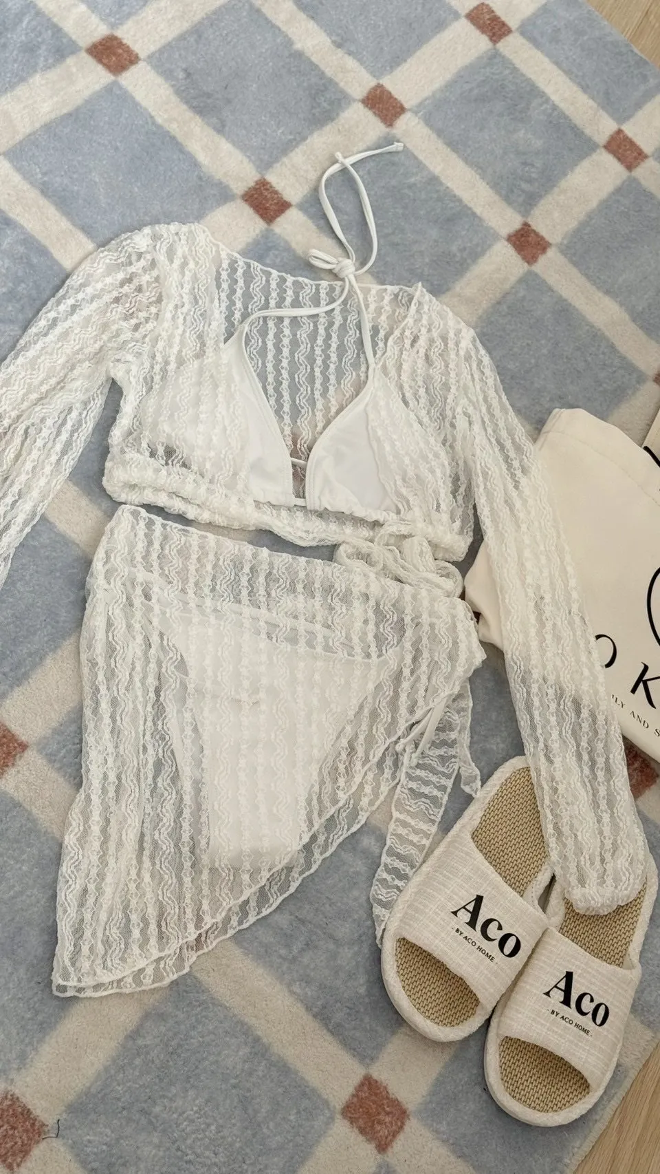 性感私藏純白比基尼+雕花外罩四件式套裝